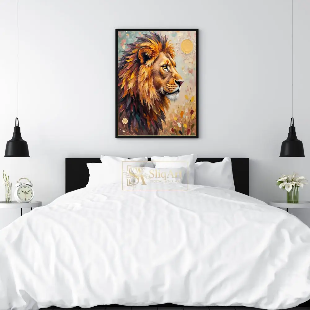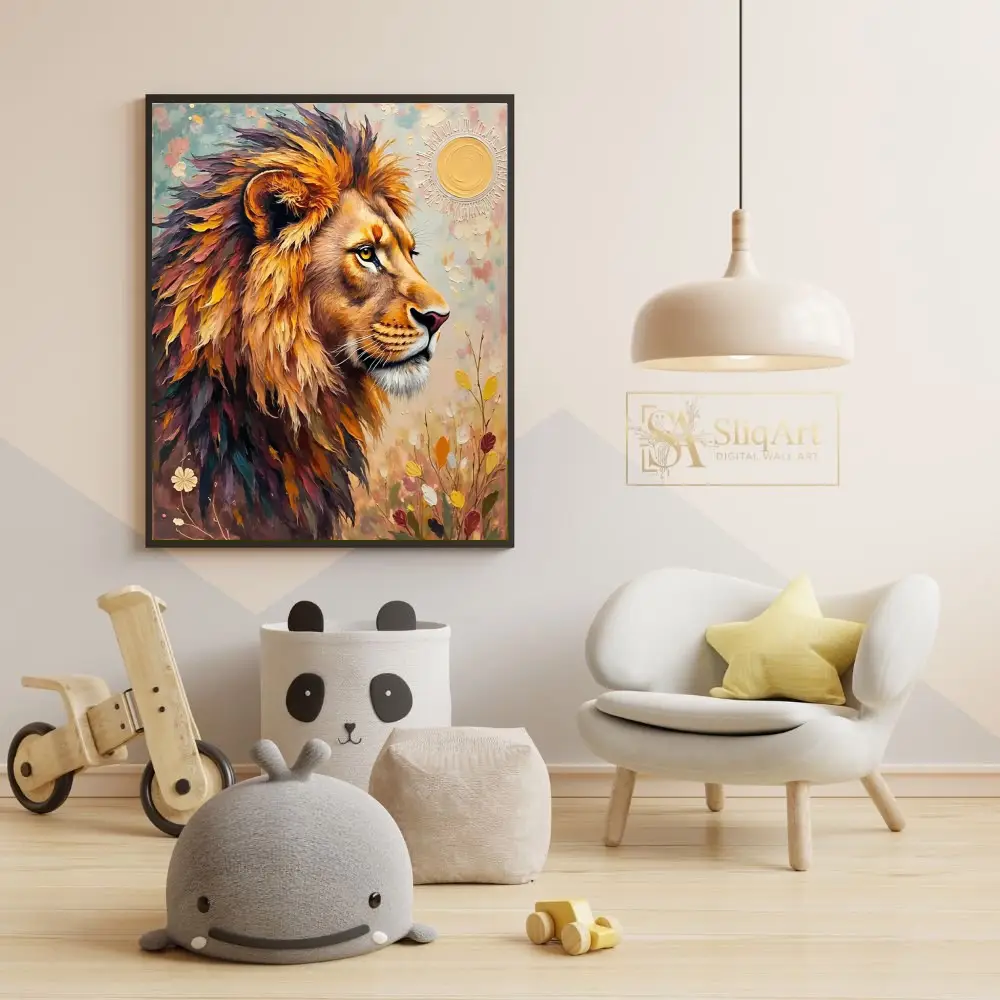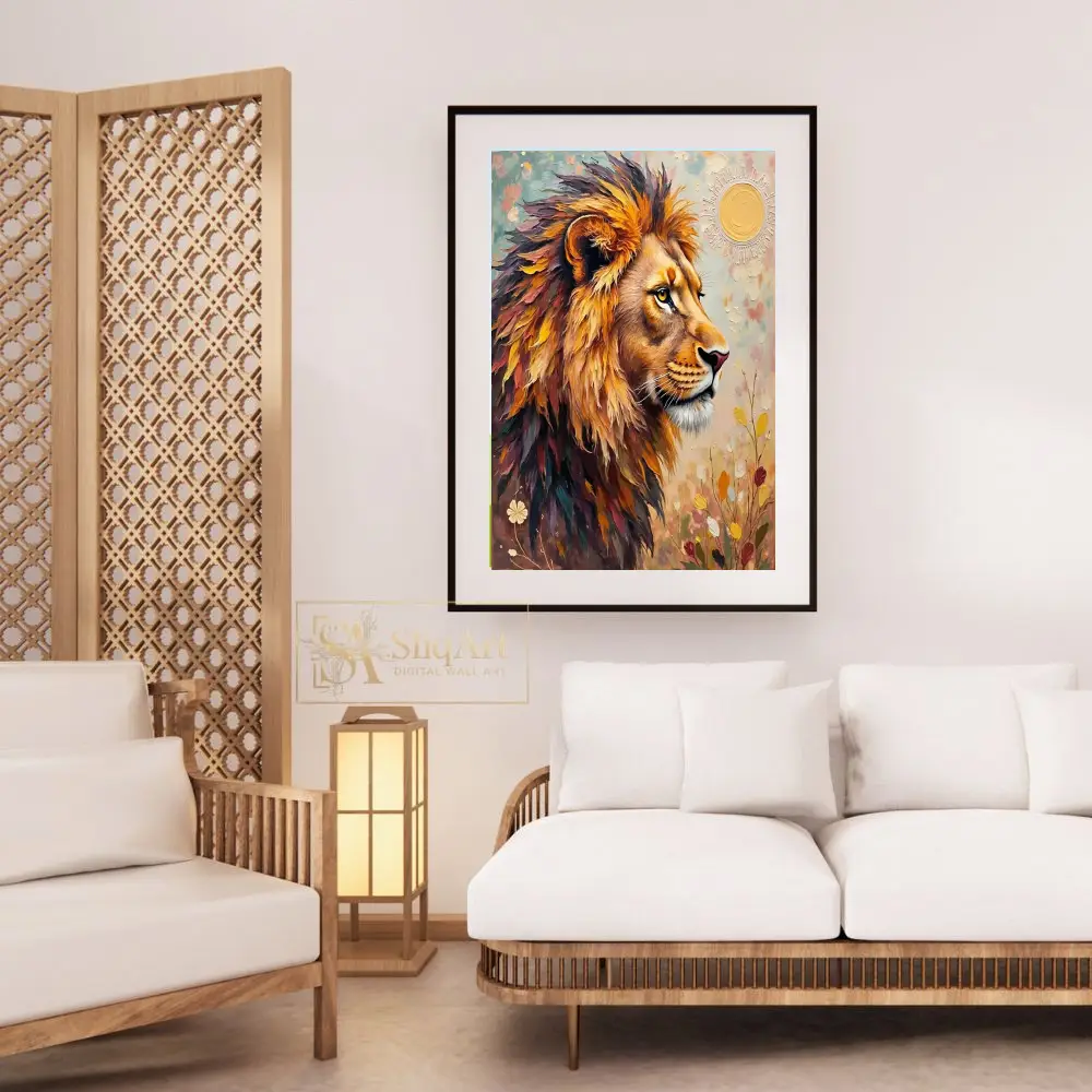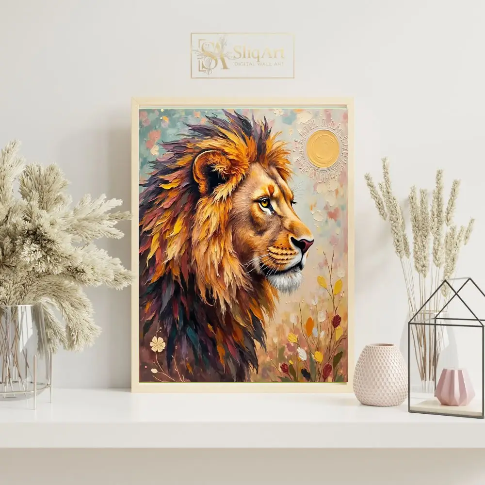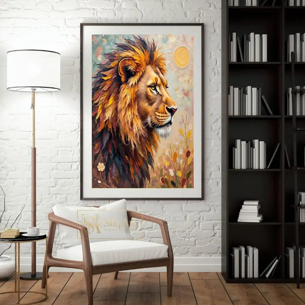 Elevate your interior design with this striking impasto lion portrait. Featuring bold, thick brushstrokes and a rich, textured palette of autumnal golds, deep purples, and vibrant teals, this piece captures the majestic and regal spirit of the king of the jungle.