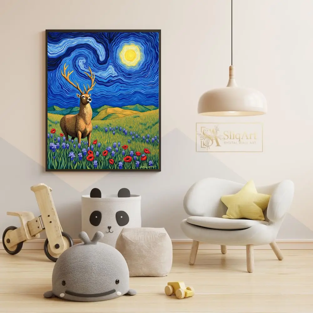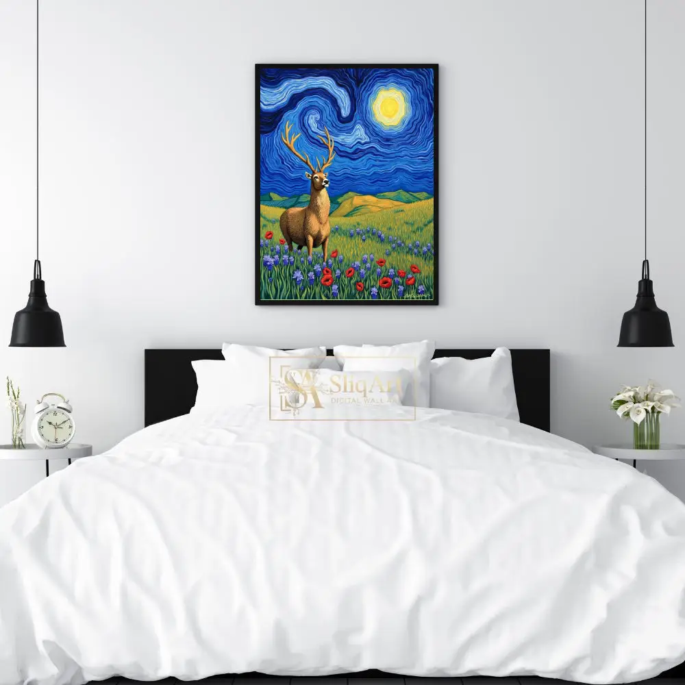 Elevate your interior with this stunning Impressionist-style canvas print featuring a majestic stag standing amidst a vibrant field of poppies and lavender. The backdrop showcases a mesmerizing swirling sky, paying homage to the expressive brushwork of Post-Impressionist masters.