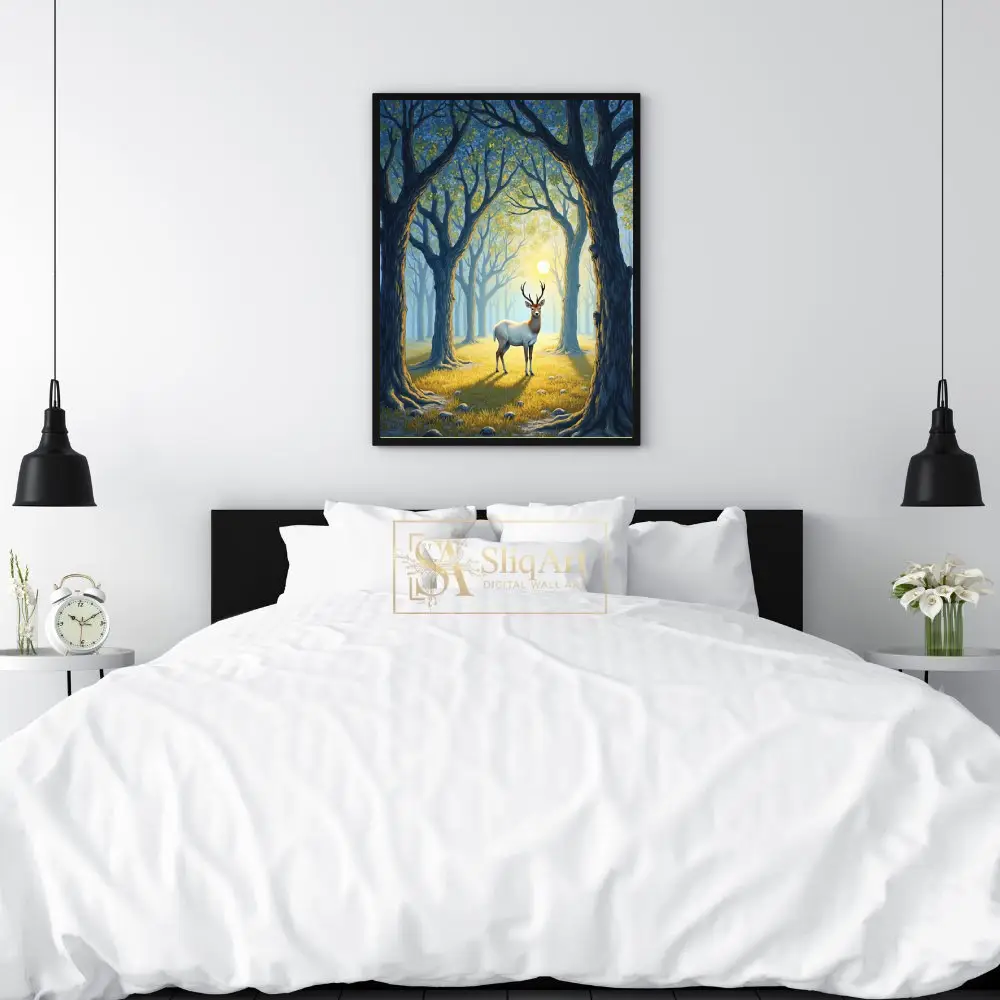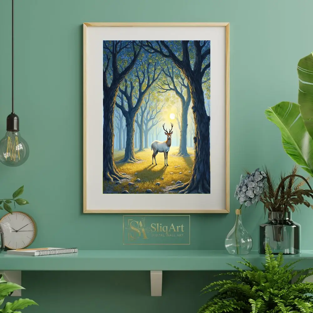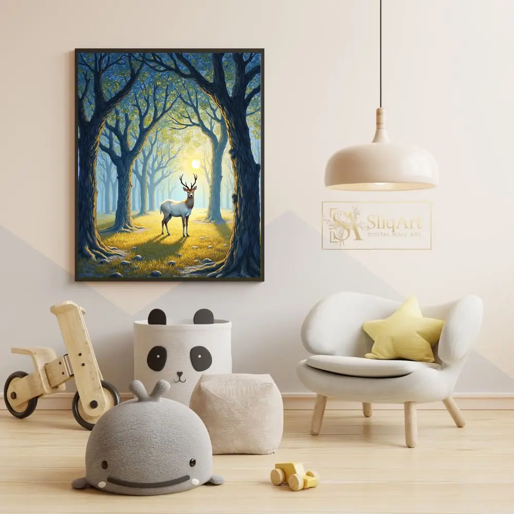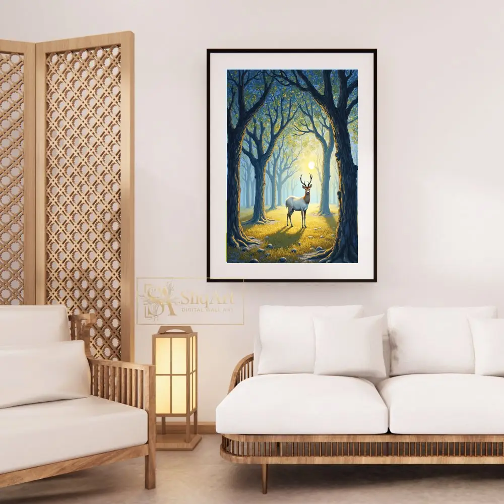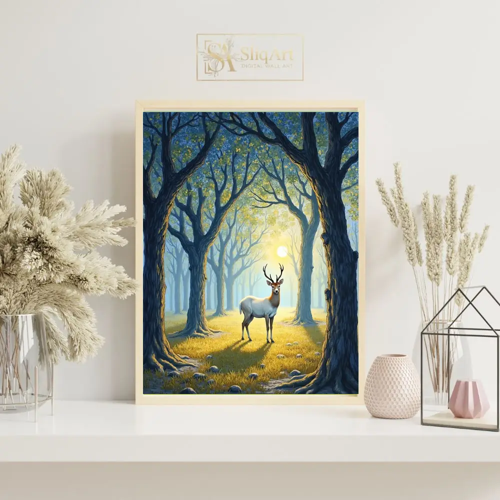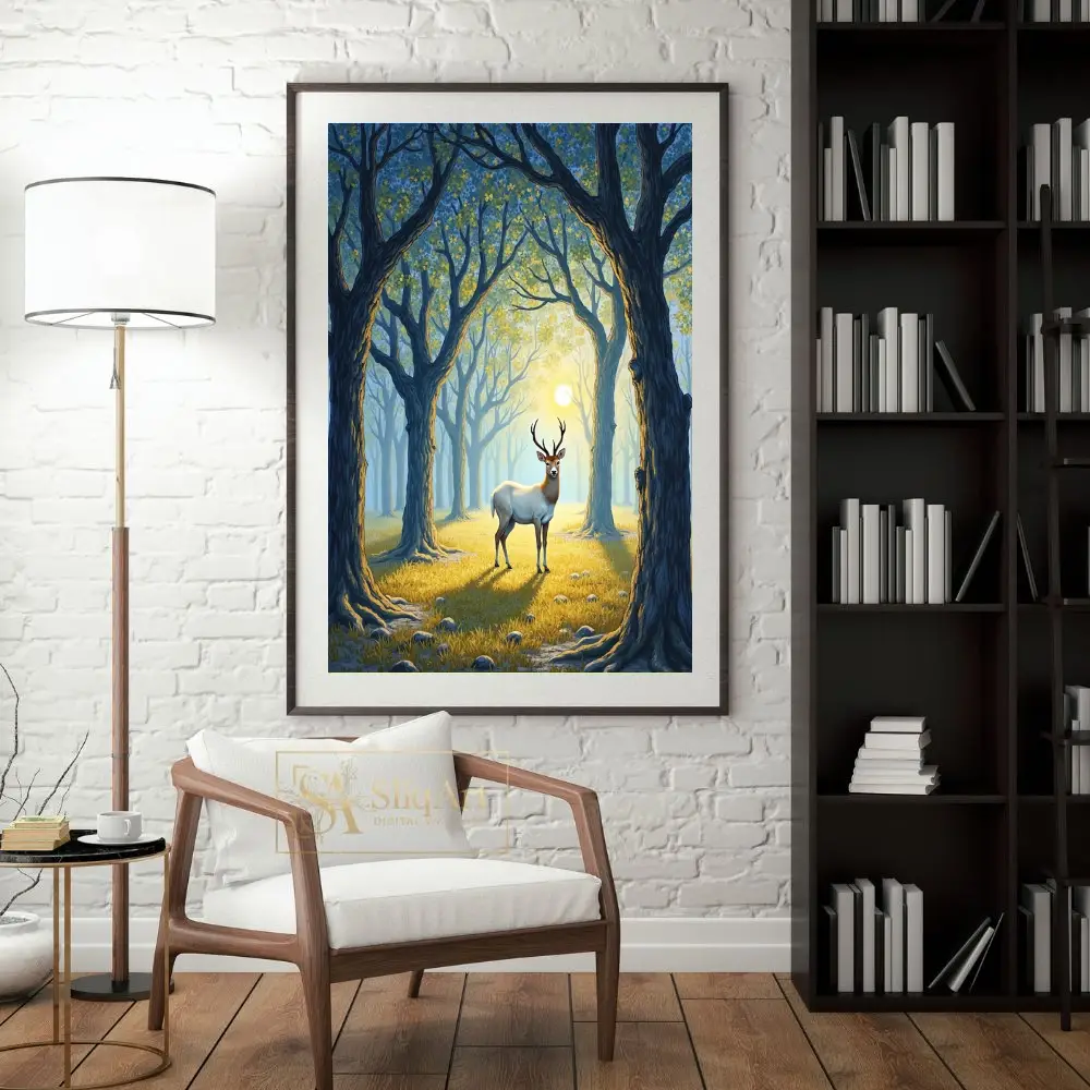 Step into a world of serene wonder with this breathtaking digital illustration of a majestic white stag. Bathed in the ethereal glow of a golden morning sun, the deer stands as a silent guardian in an ancient, gnarled forest.