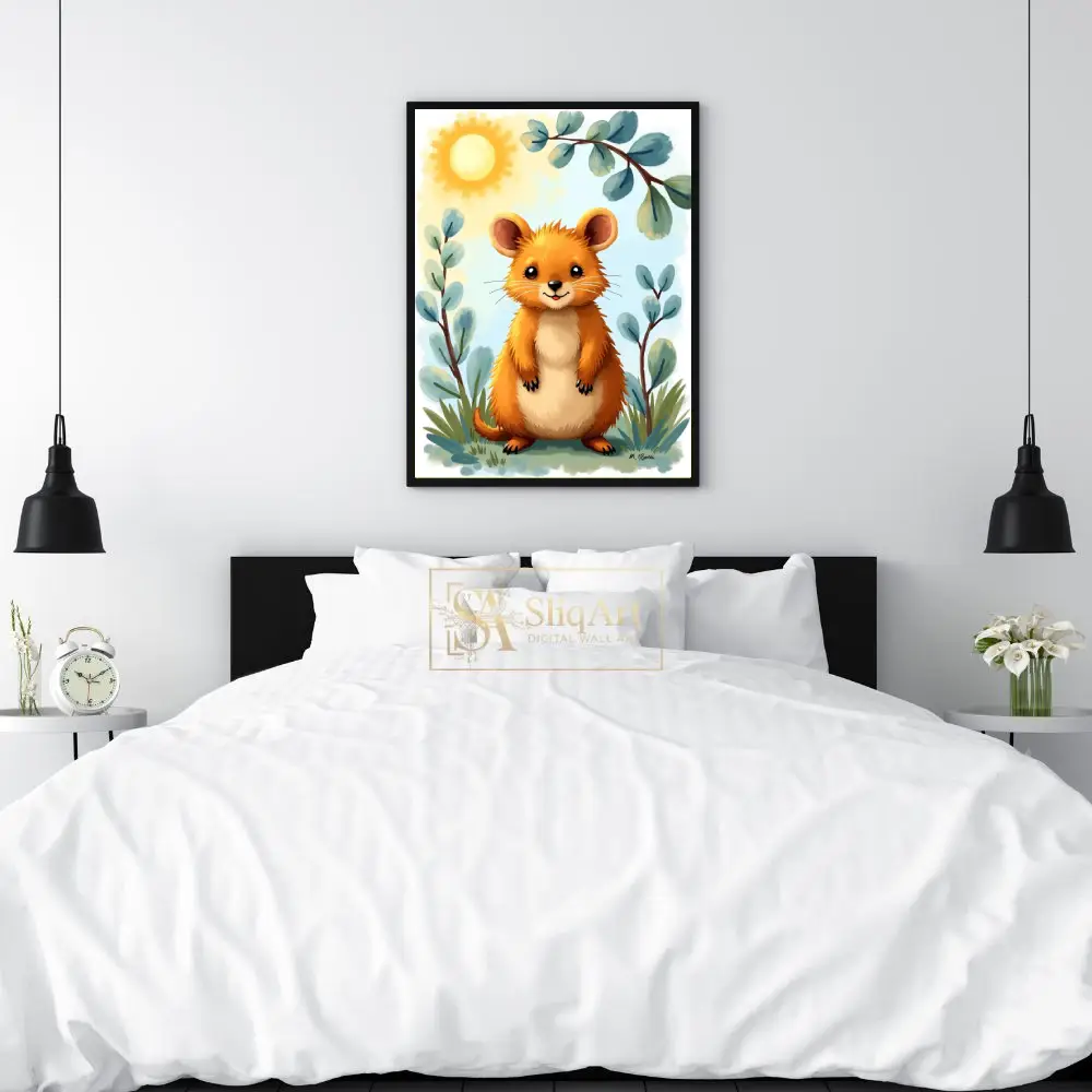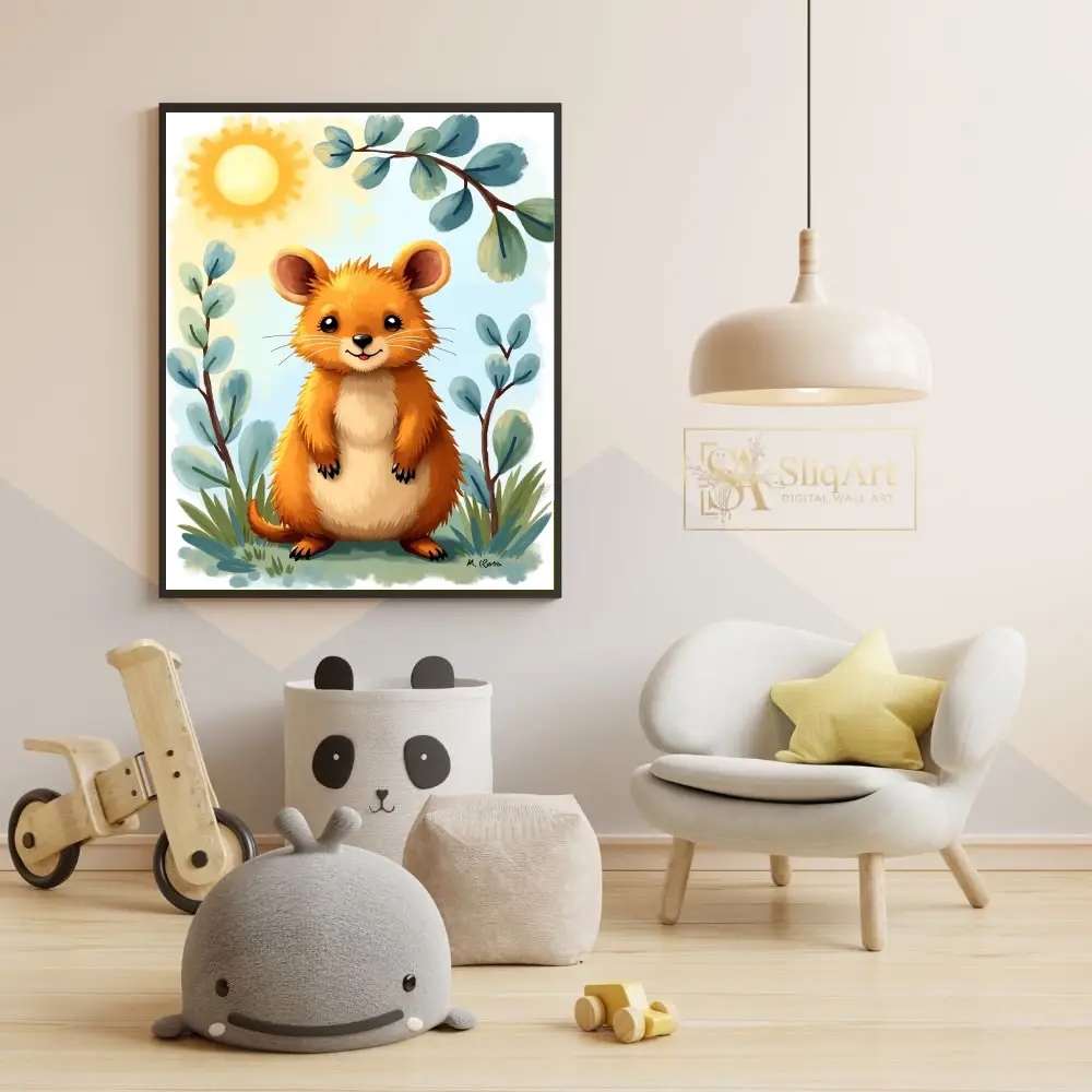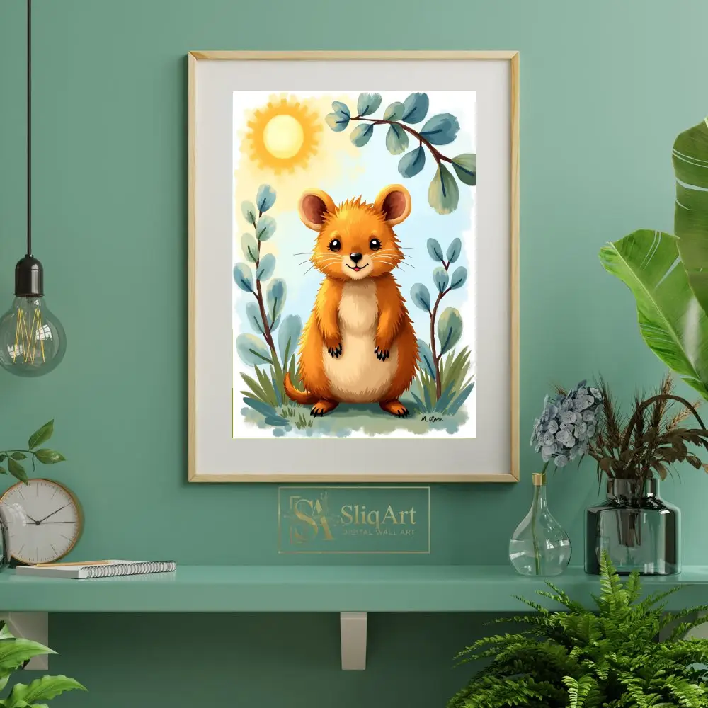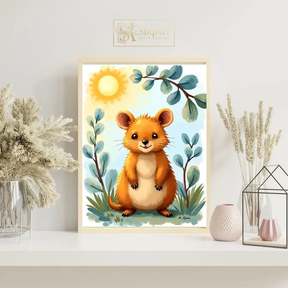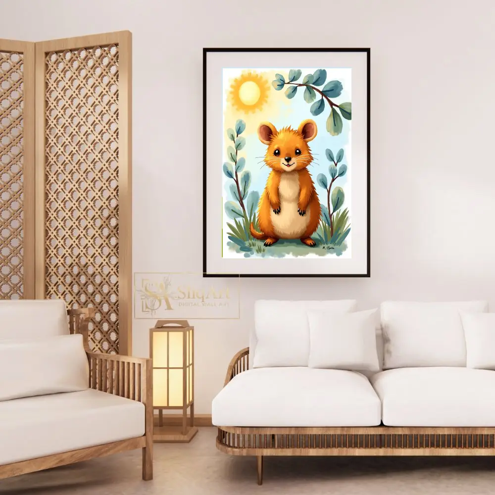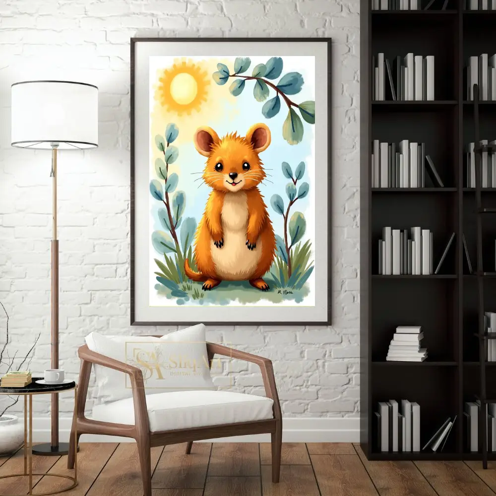 Bring a splash of joy into your home with this adorable digital illustration of a golden hamster. The character is rendered with rich, warm textures and expressive features that capture a sense of innocence and wonder.