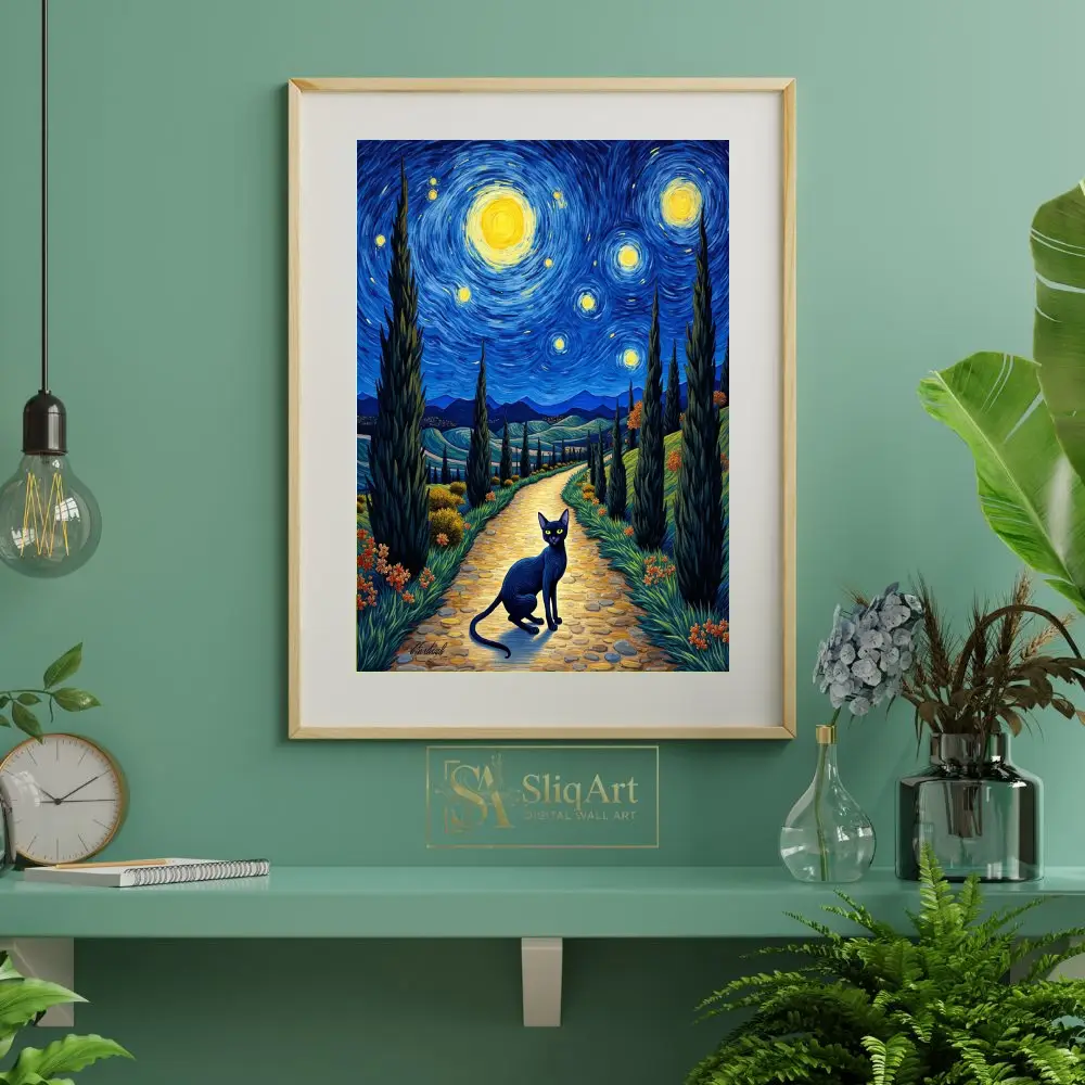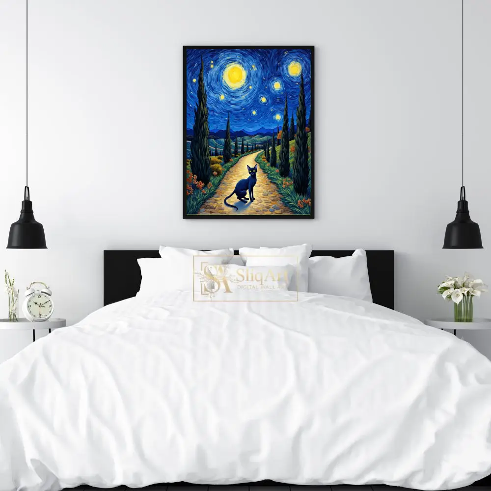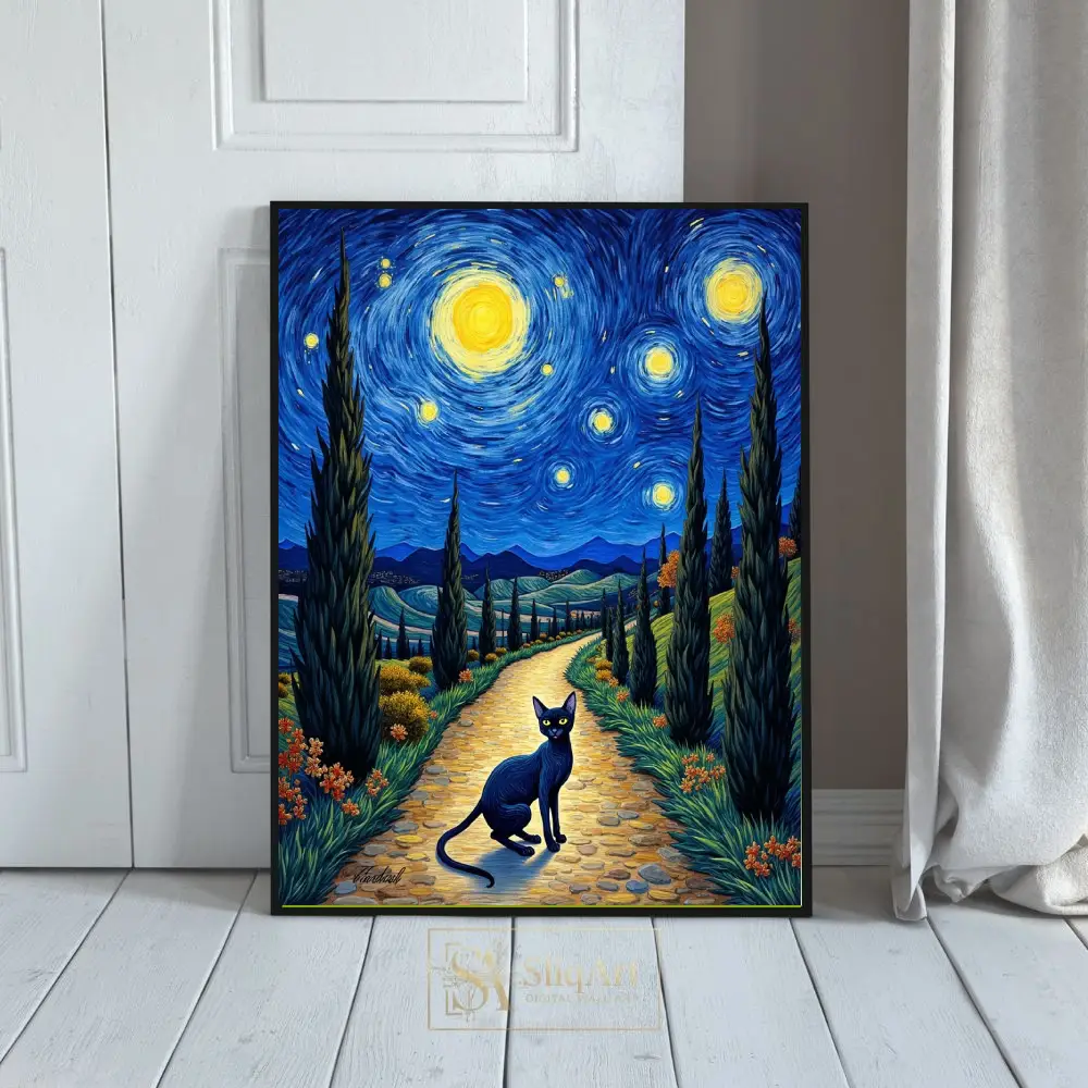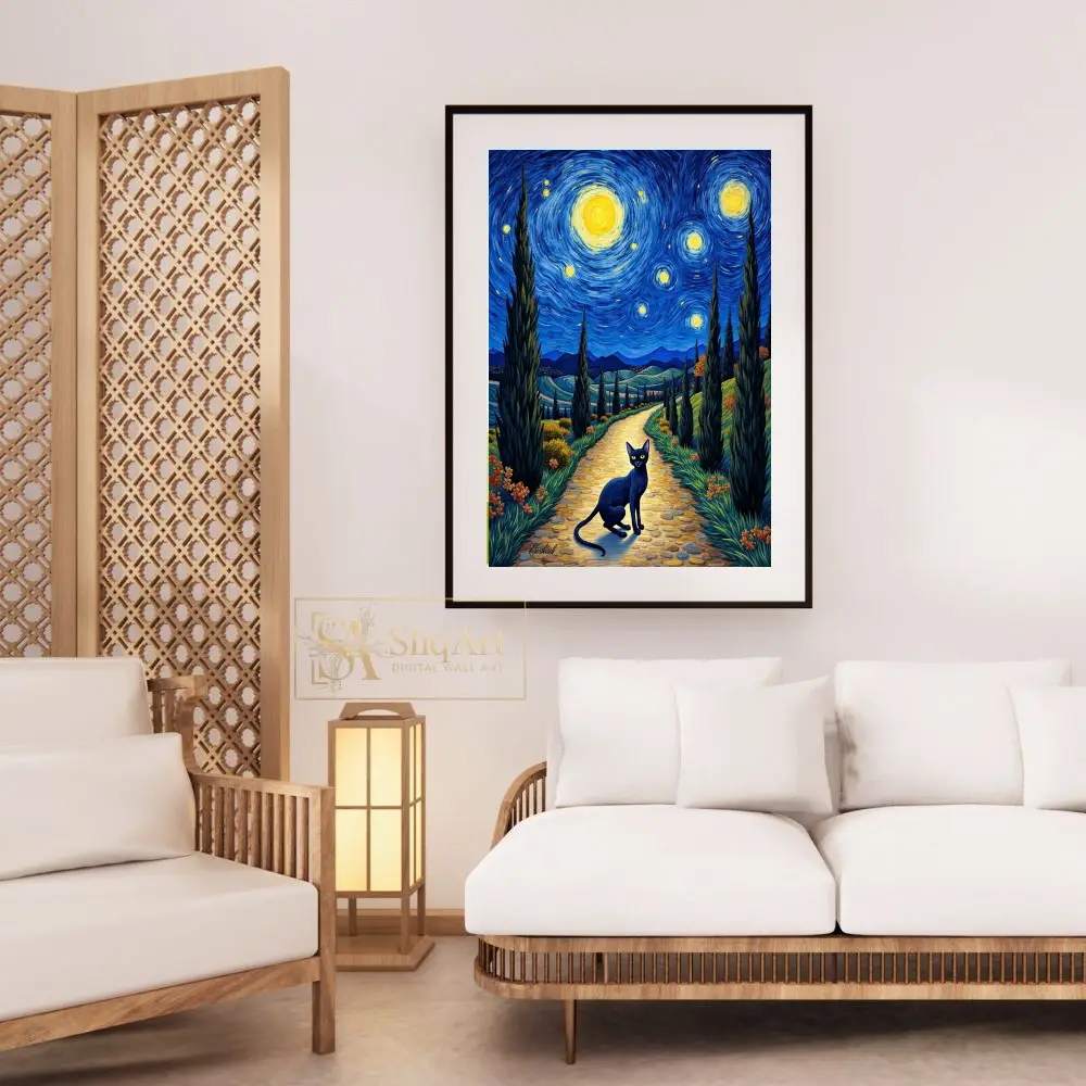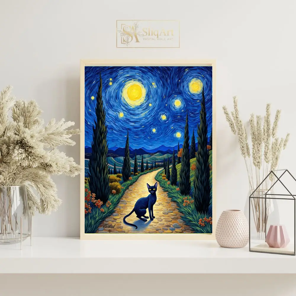 Immerse yourself in a whimsical fusion of classical art and feline charm with this stunning ‘Starry Night’ inspired canvas. Featuring a sleek black cat perched on a sunlit cobblestone path, the piece pays homage to Van Gogh’s iconic post-impressionist style.