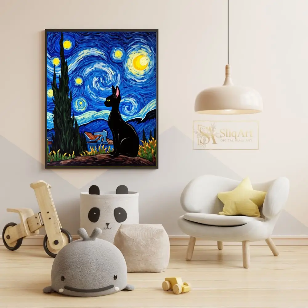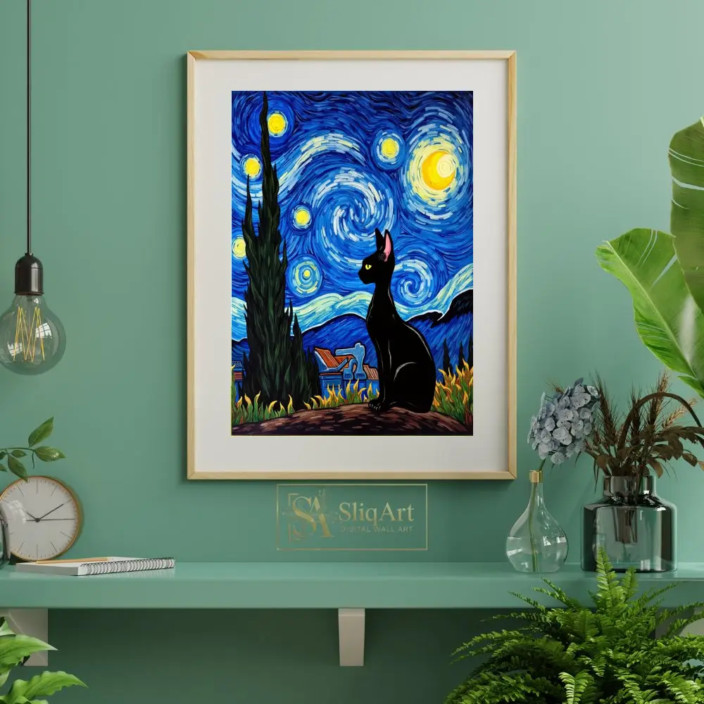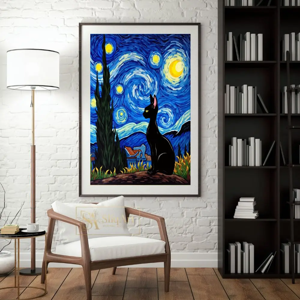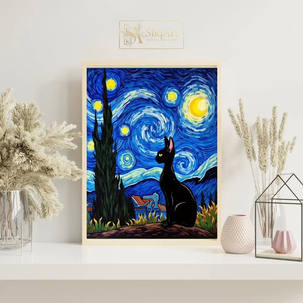 Add a touch of whimsical sophistication to your home with this stunning piece of art that blends the legendary style of Vincent van Gogh with the mysterious elegance of a black cat. This high-contrast composition features a sleek, dark feline silhouette perched against a vibrant, swirling sky of deep cobalt blues and luminous golden yellows.