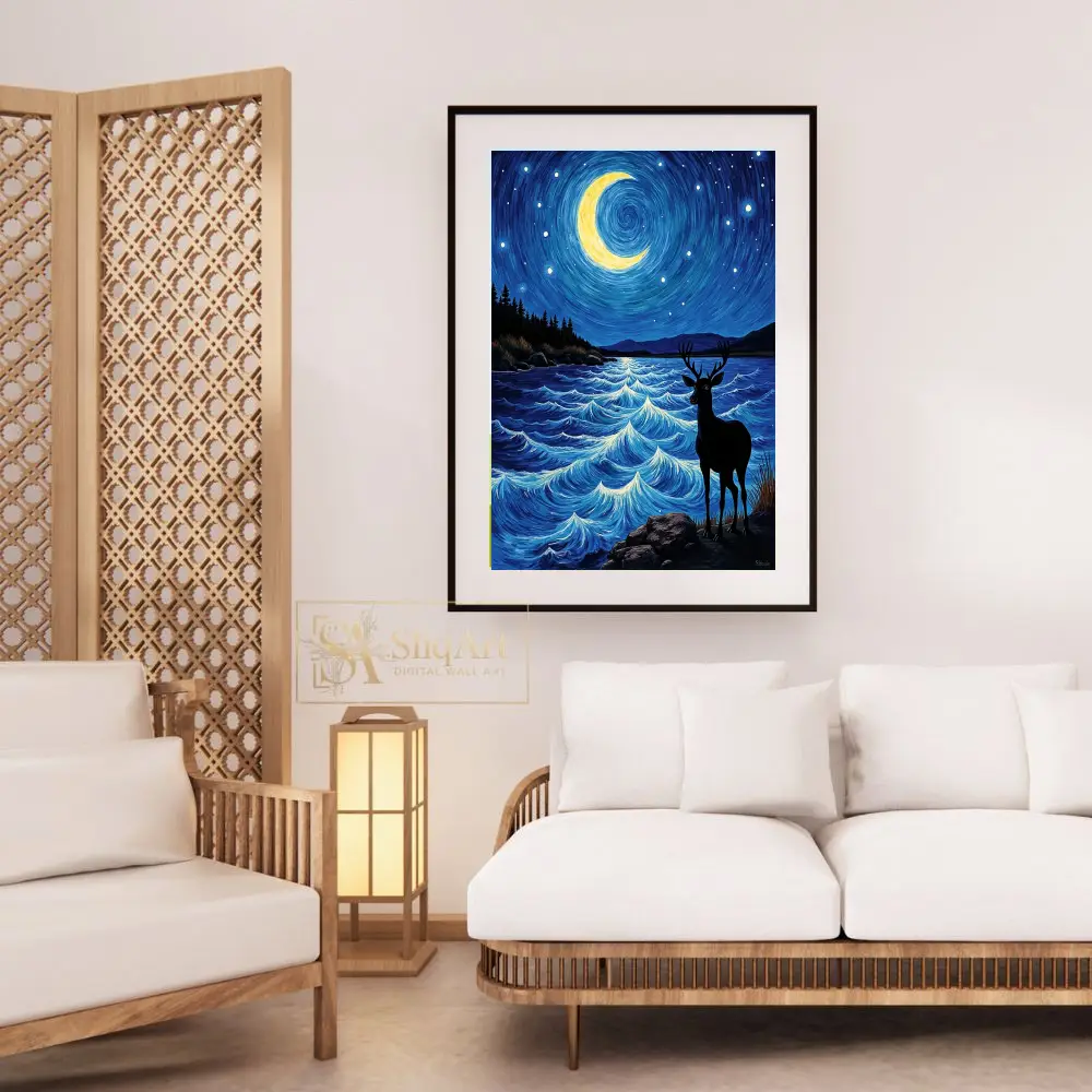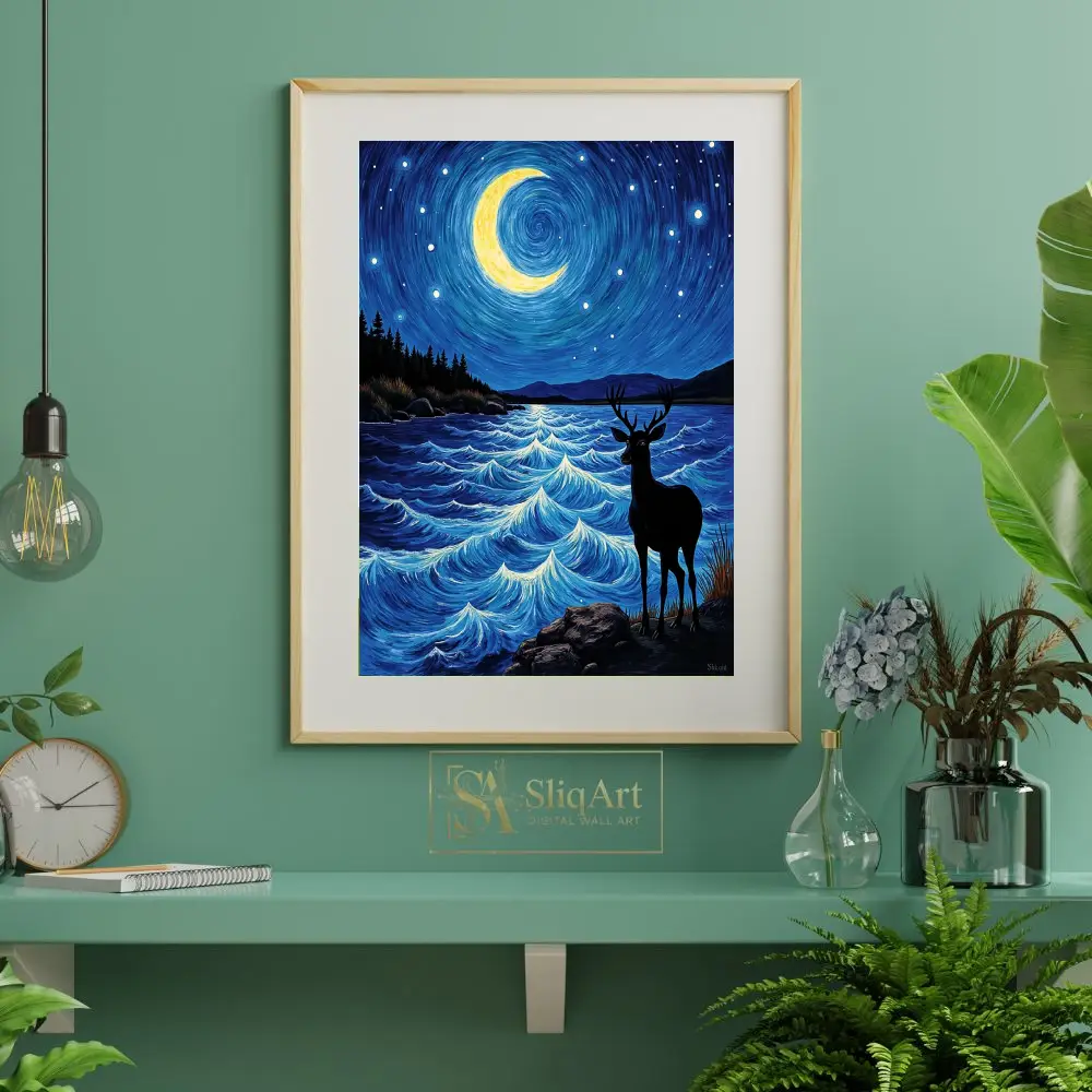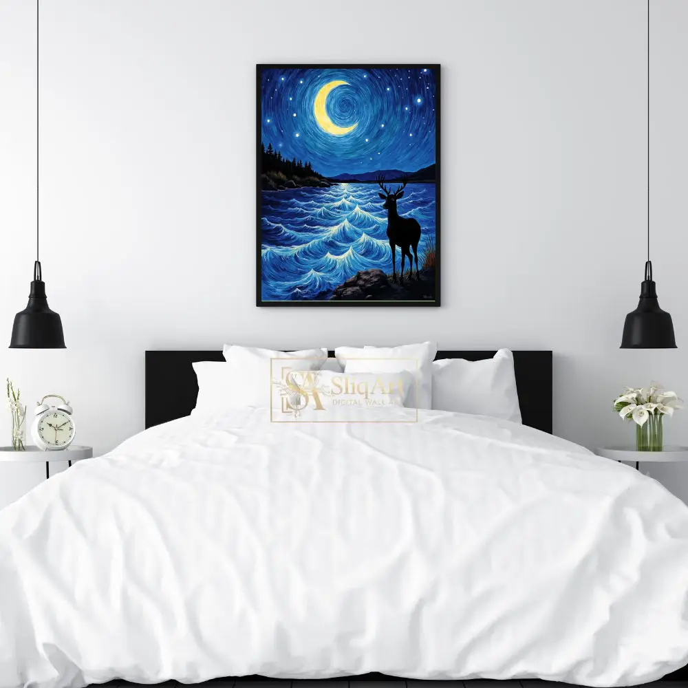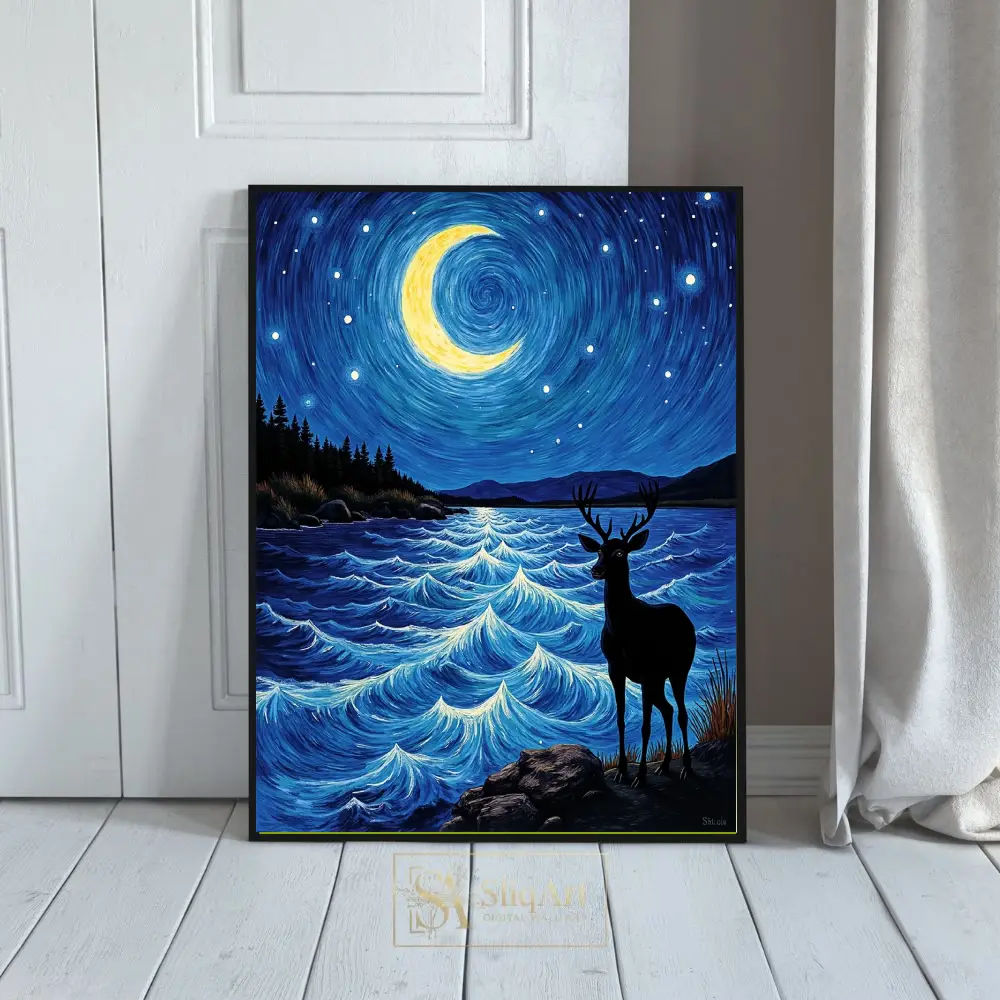 Elevate your interior with this enchanting post-impressionist masterpiece. The artwork features a majestic stag silhouette standing at the water’s edge, framed by a swirling midnight sky that pays homage to Van Gogh’s iconic style.