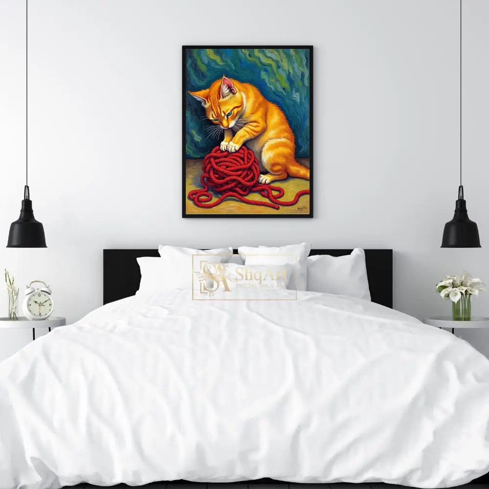 Capture the playful essence of a curious kitten with this stunning impressionist-style art piece. Featuring a bright orange tabby kitten engrossed in a large, tangled ball of red yarn, this work of art stands out with its bold colors and swirling, textured background of deep blues and forest greens.