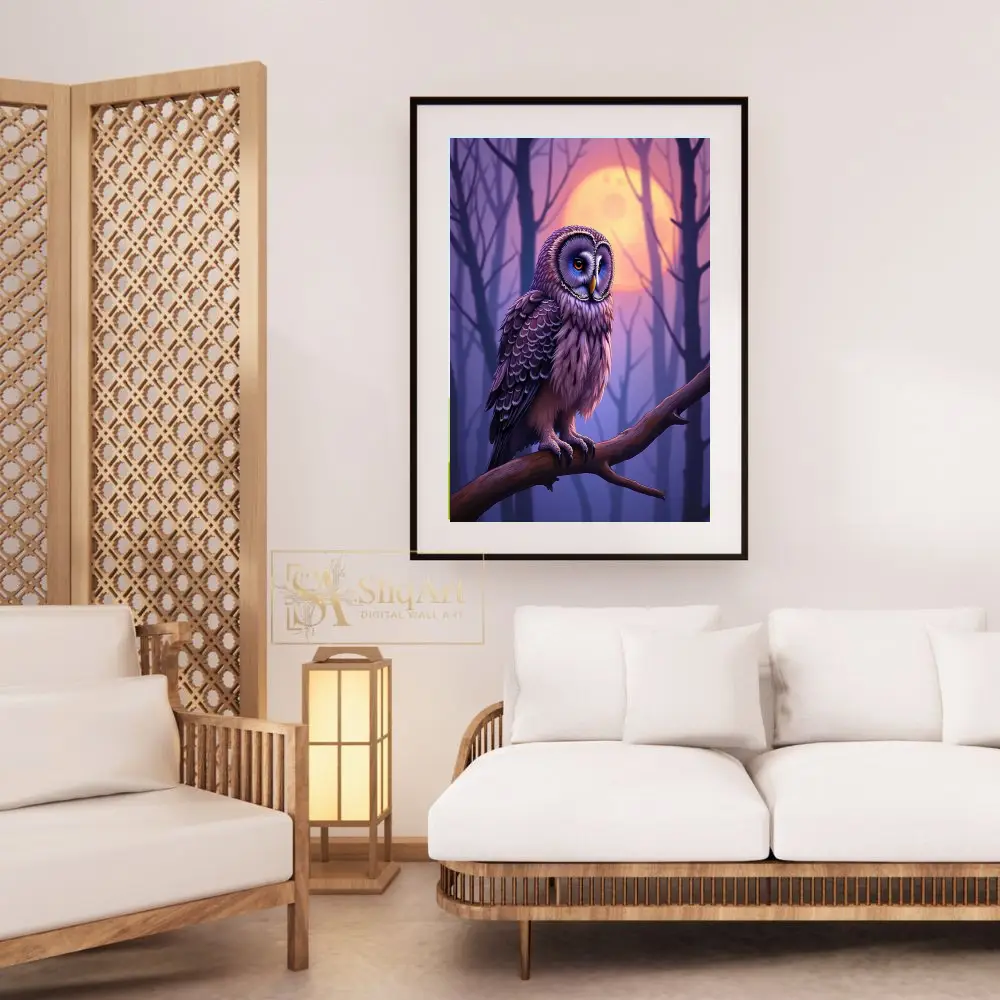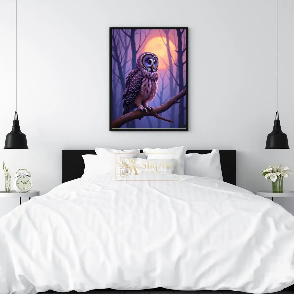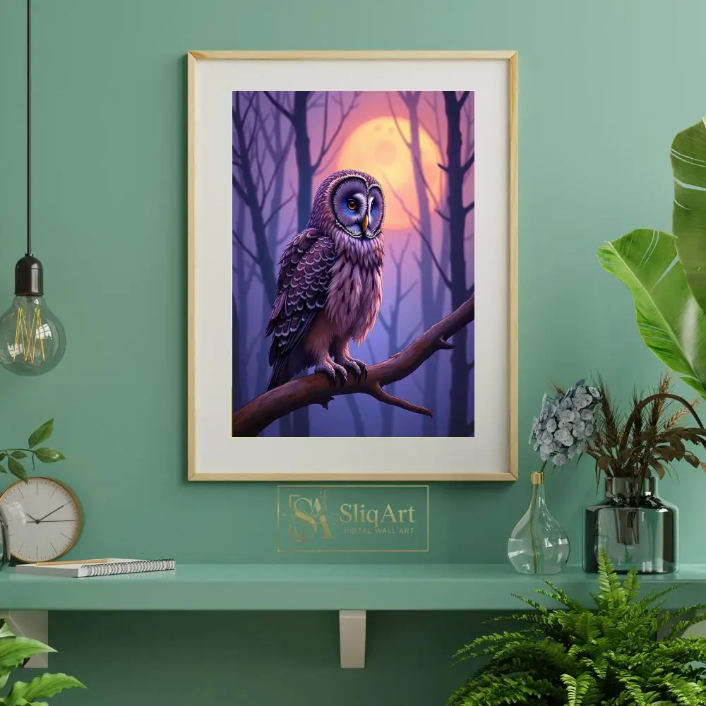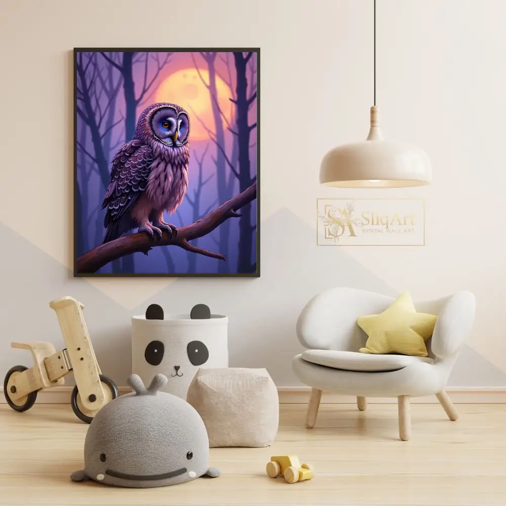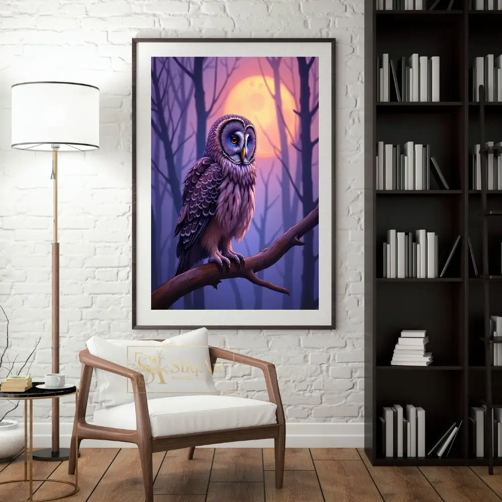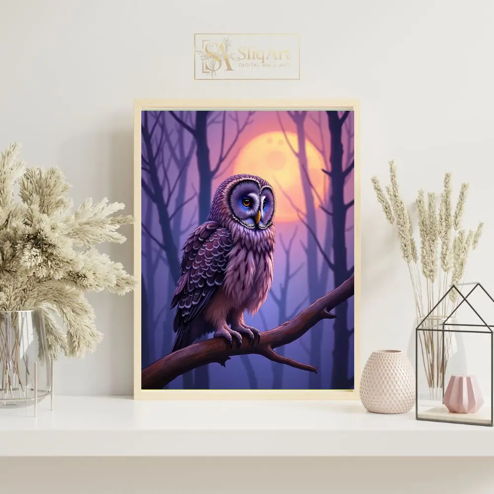 Transform your space with this enchanting digital illustration featuring a majestic owl perched on a branch against a glowing sunset moon. The rich palette of deep purples, lavenders, and warm golds creates a serene yet mysterious atmosphere.