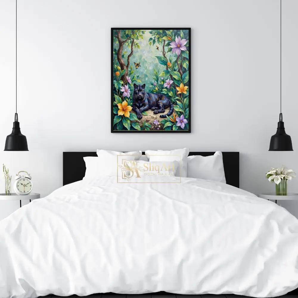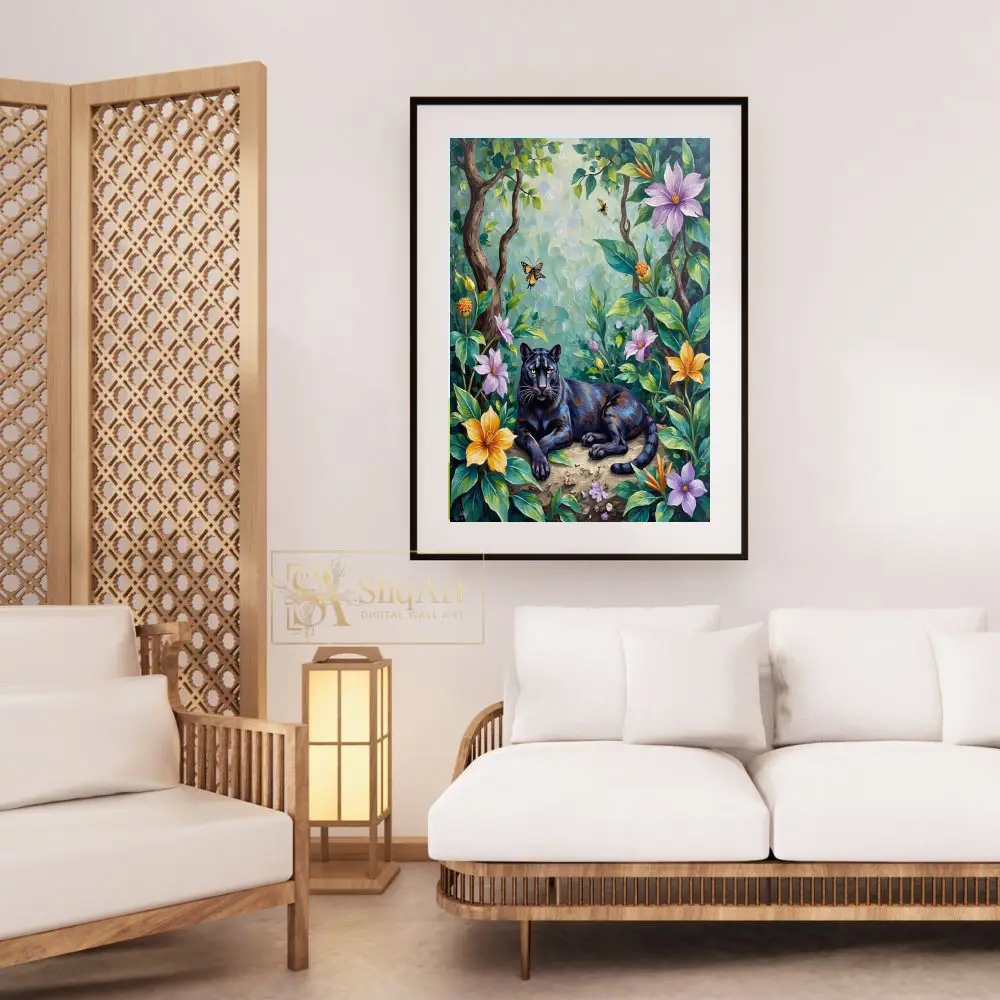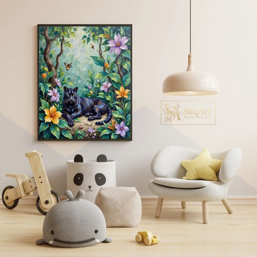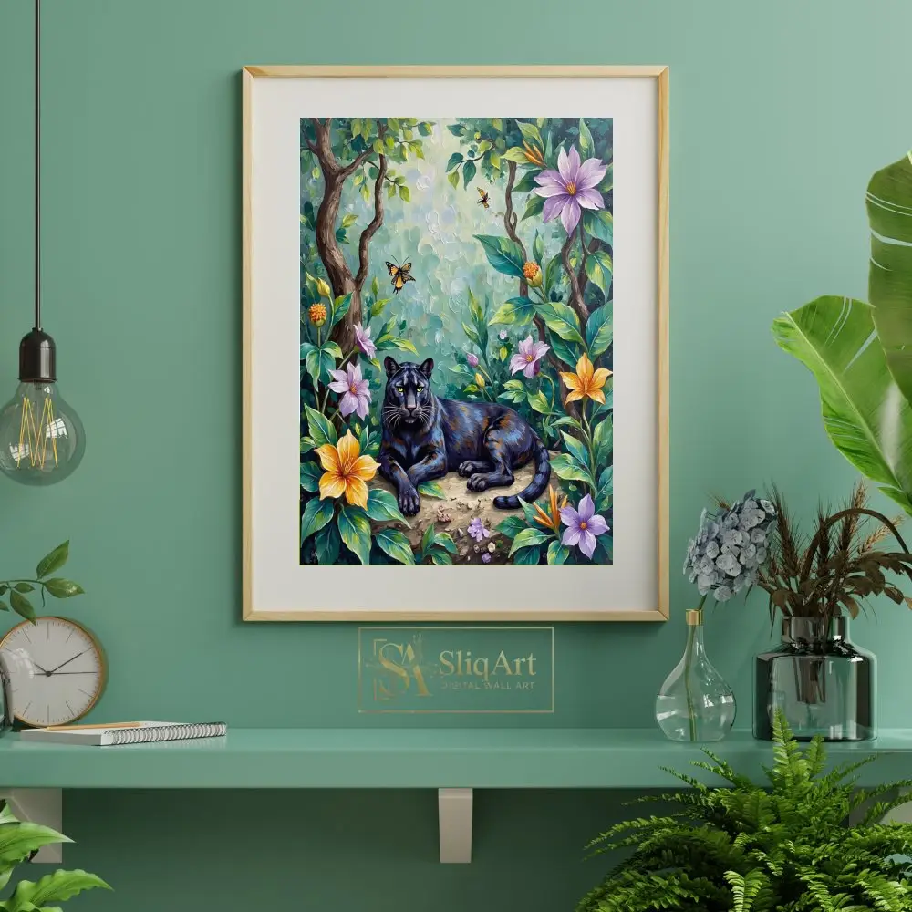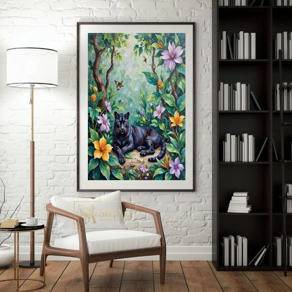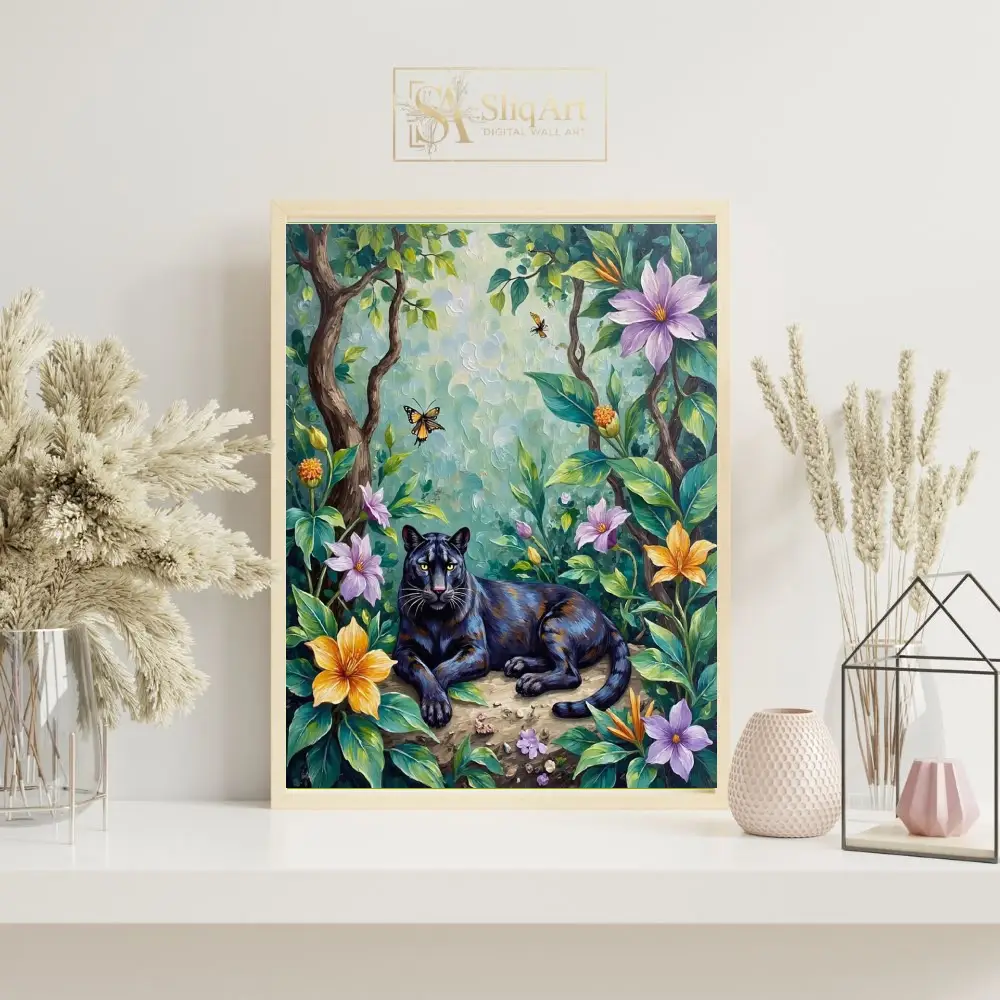 Transform your living space with this captivating impasto-style painting featuring a majestic black panther at rest. Set within an enchanted tropical sanctuary, the sleek predator is surrounded by vibrant lavender and golden-orange blooms, fluttering butterflies, and lush emerald foliage.