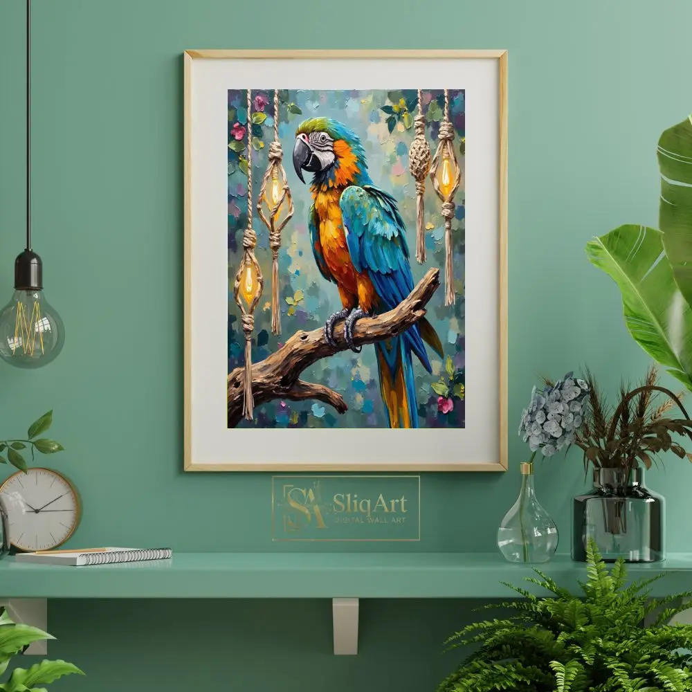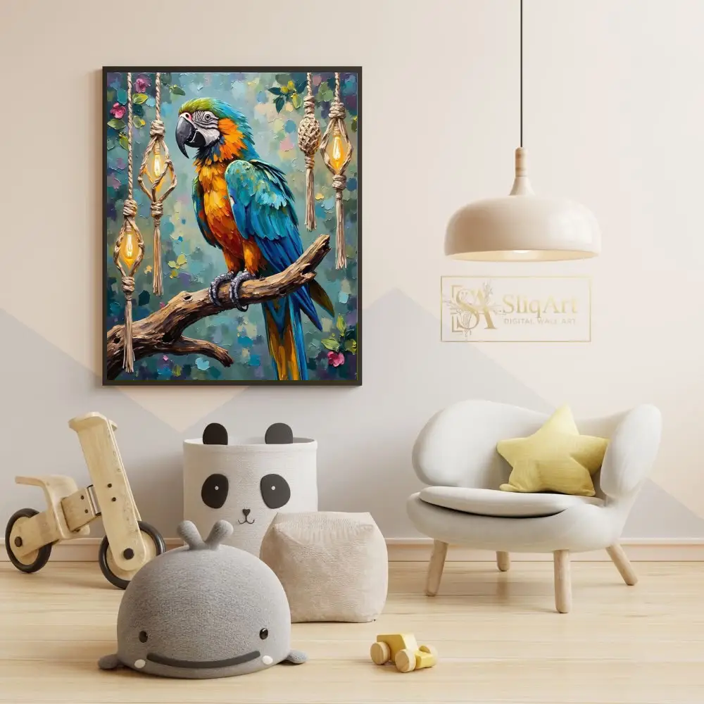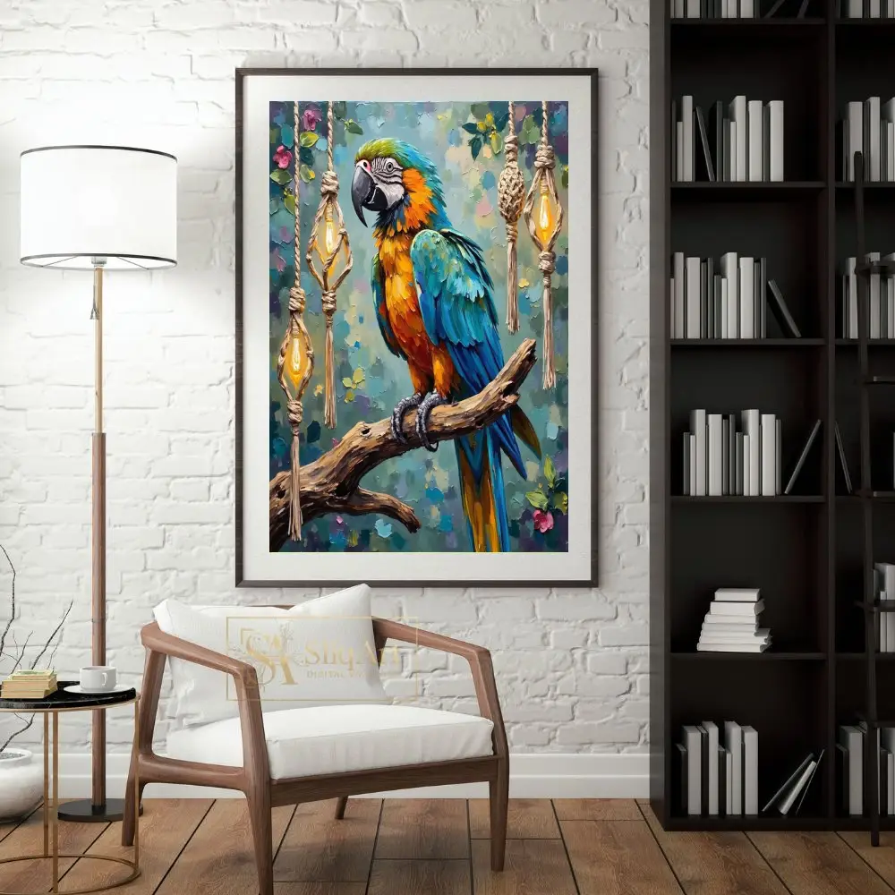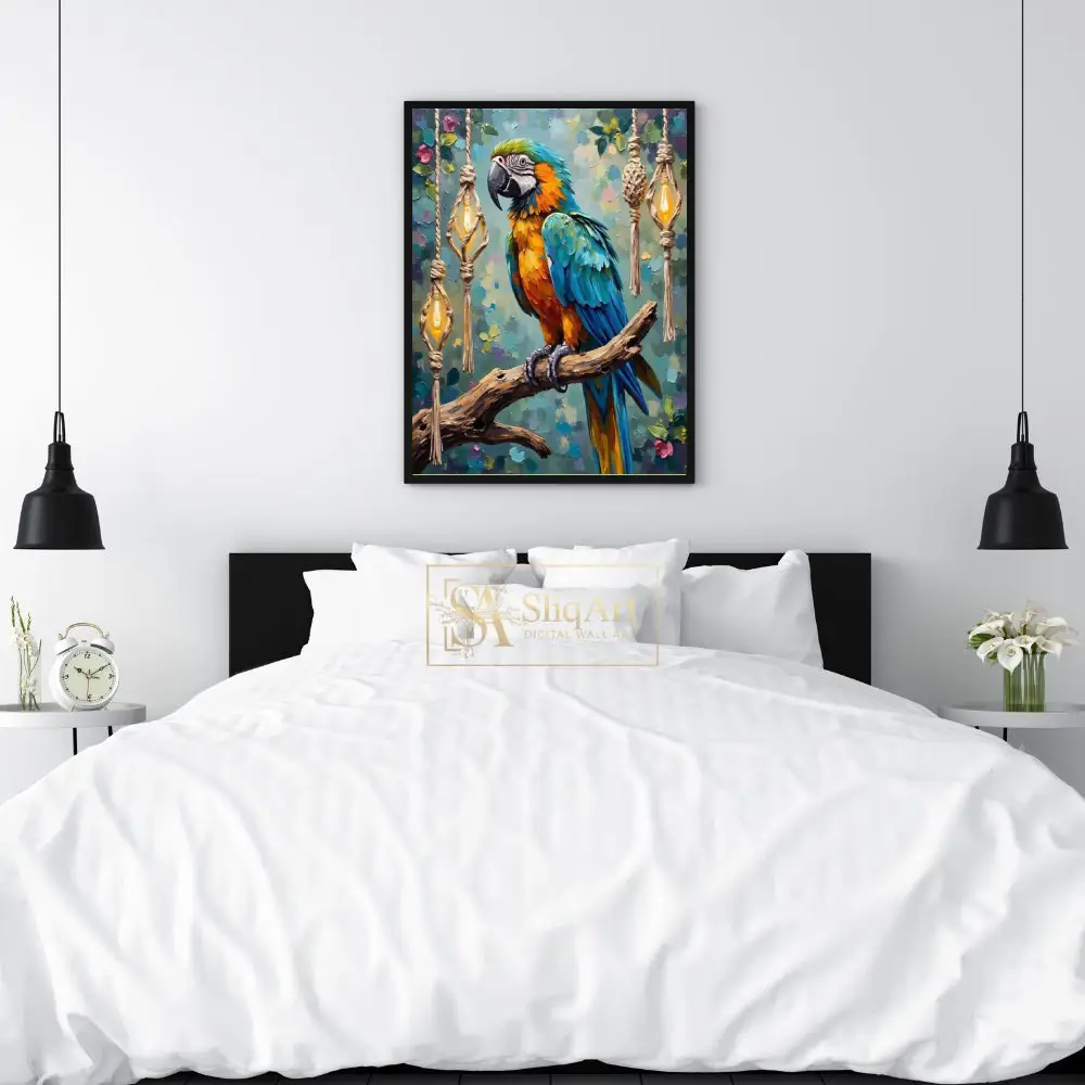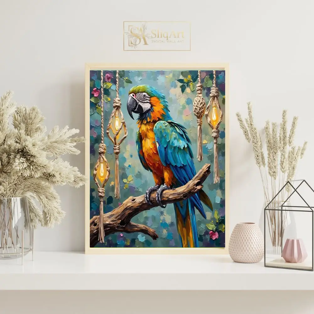 Set against a whimsical backdrop of hanging macrame lanterns and soft floral accents, this piece blends tropical nature with bohemian charm. The vibrant teals, oranges, and yellows will breathe life into any space, making it a captivating conversation starter for art enthusiasts and bird lovers alike.