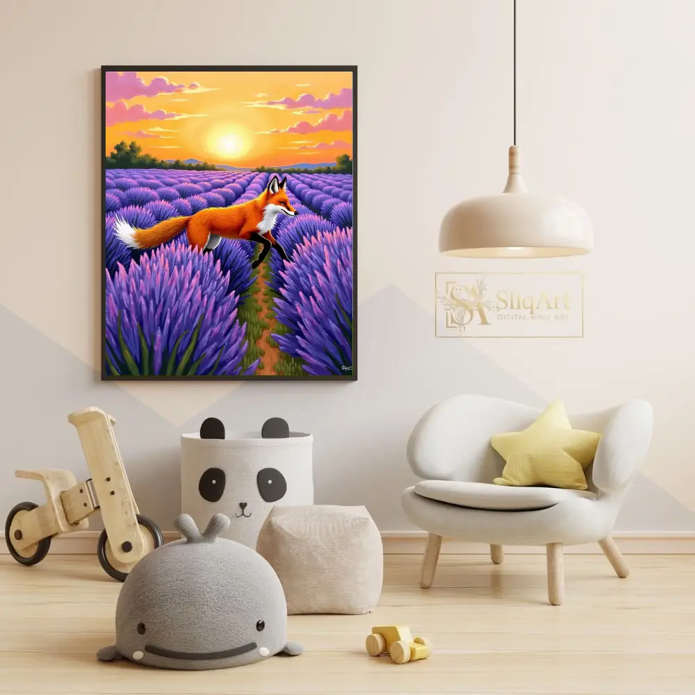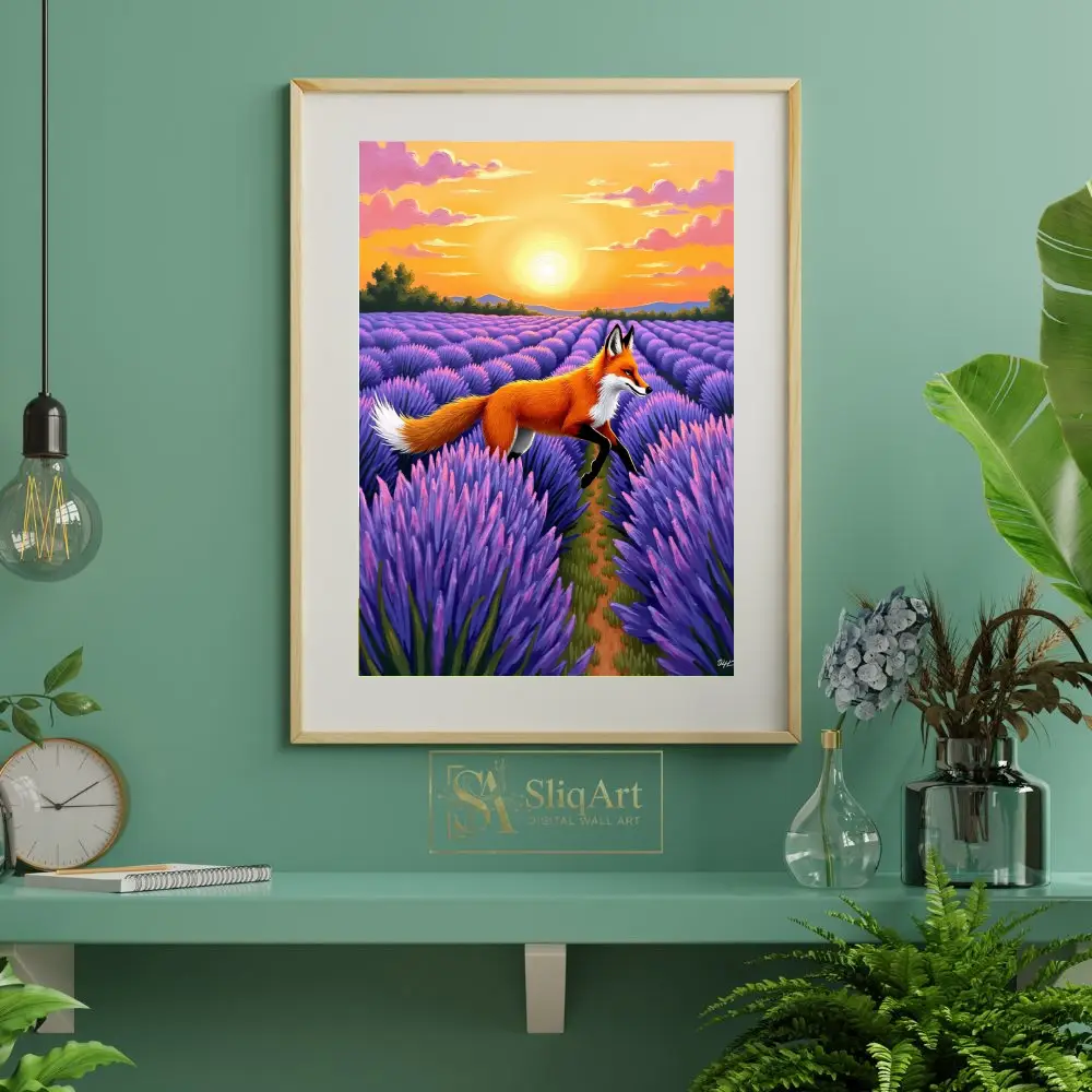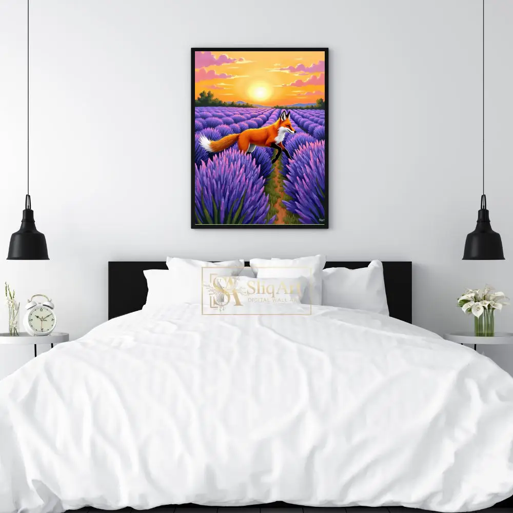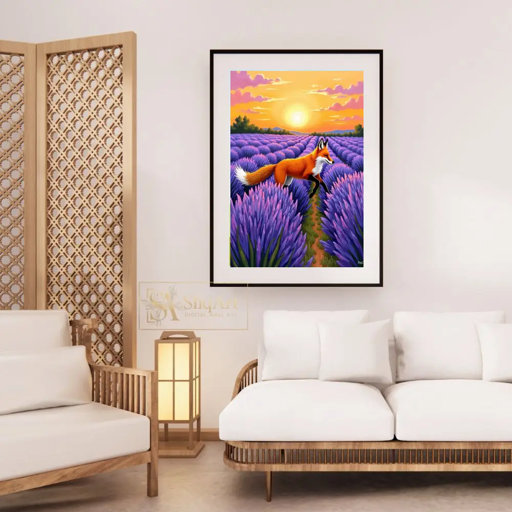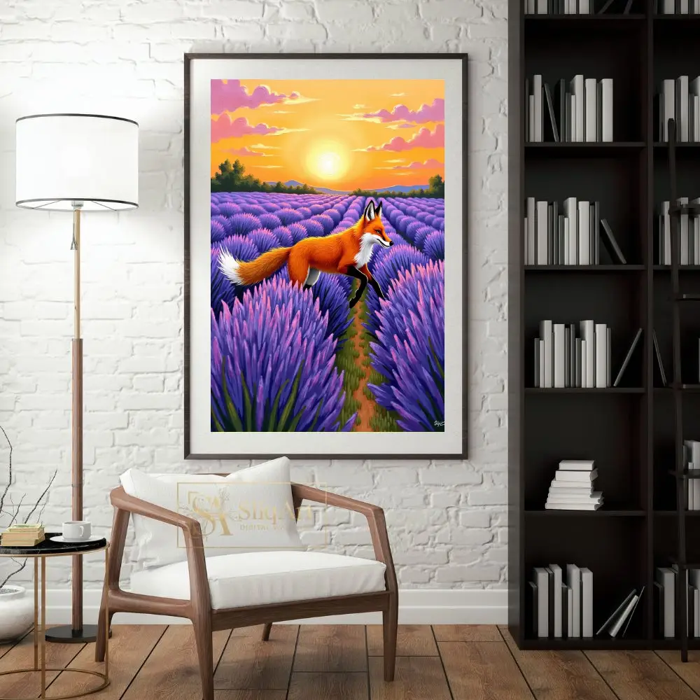 The rich brushstrokes and textured appearance of the lavender field create a sense of depth and movement, making this piece a dynamic yet serene addition to any collection. The contrast between the fiery orange of the fox and the deep violet of the flowers creates a stunning visual harmony.