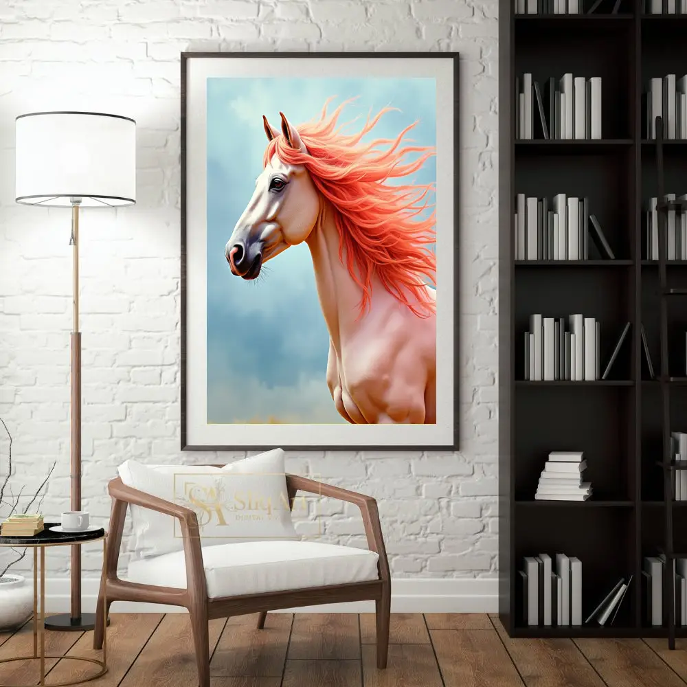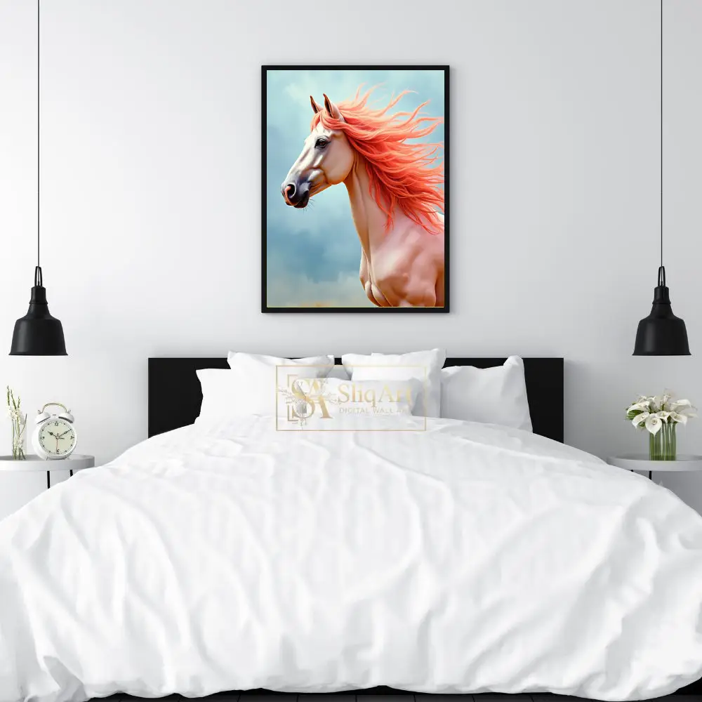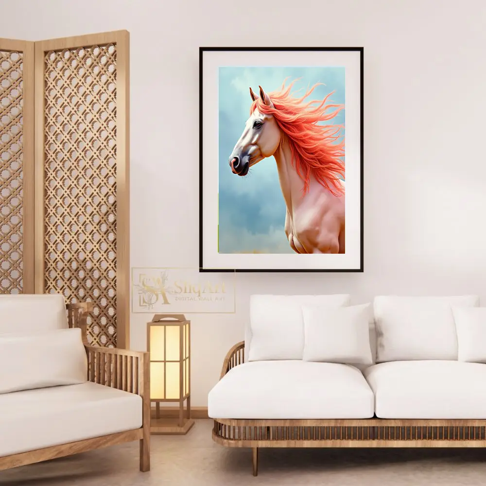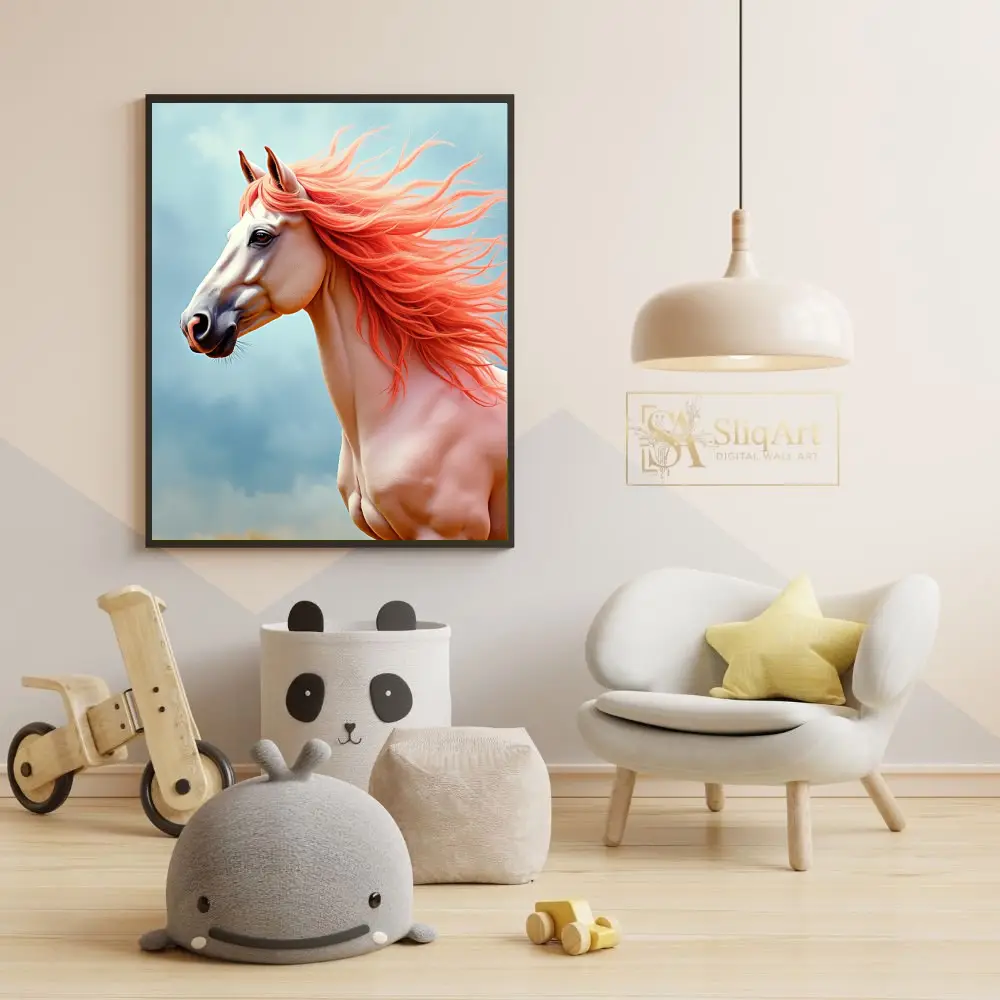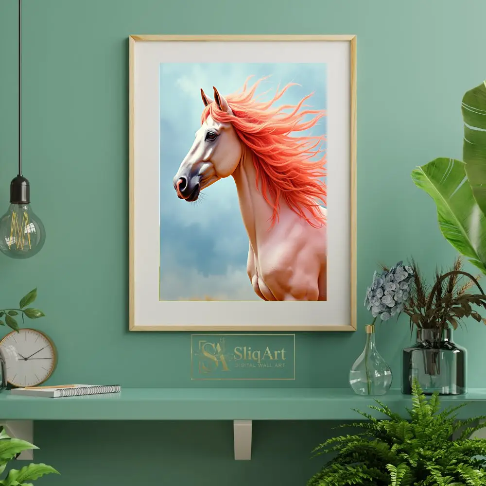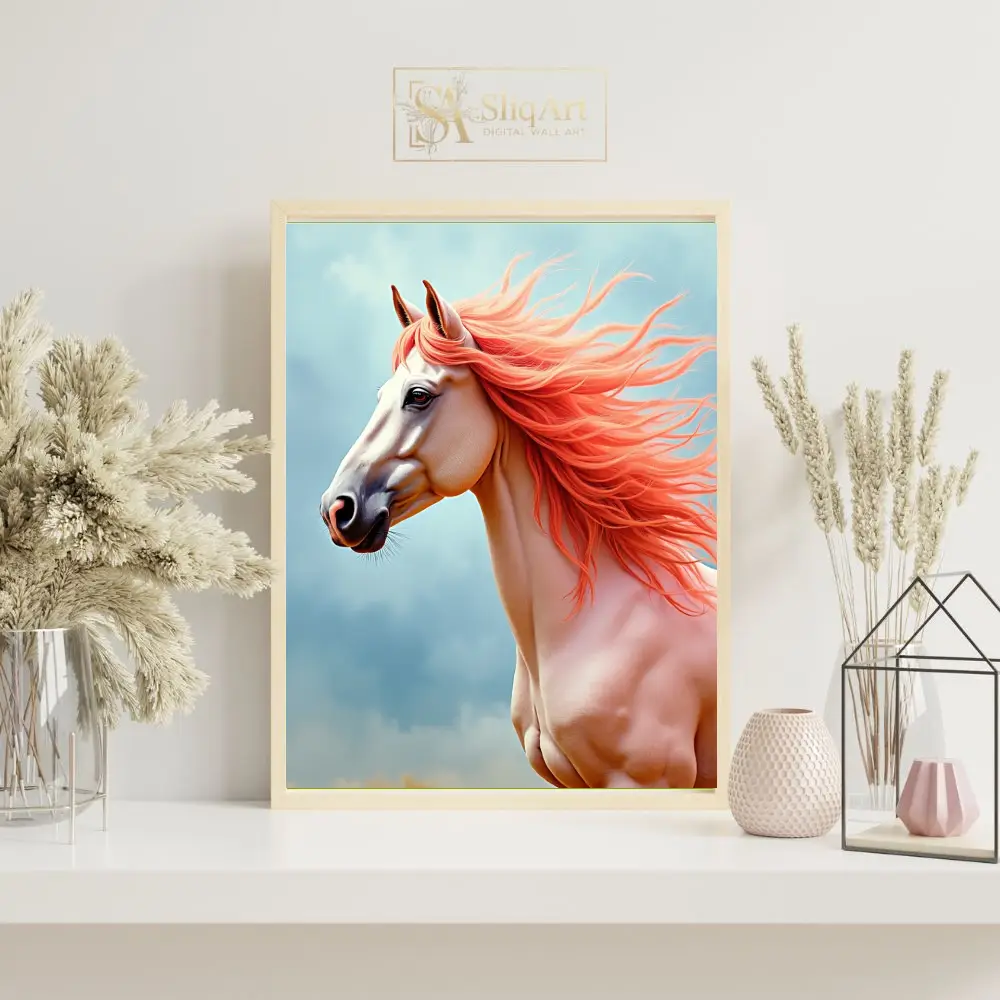 Elevate your space with this stunning horse portrait featuring a vibrant, wind-swept coral mane.