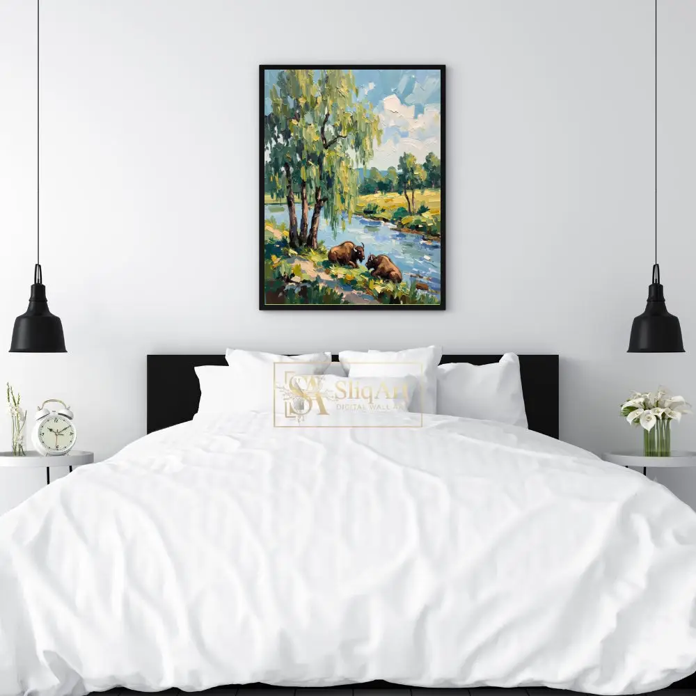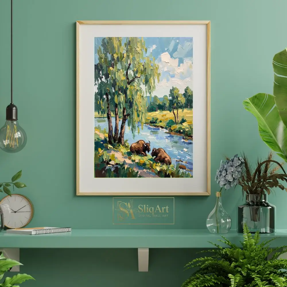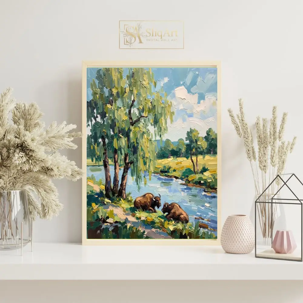 This stunning impressionist oil painting captures a serene moment in the wild, featuring two majestic bison resting on the grassy banks of a winding river. The composition is anchored by a magnificent weeping willow tree, its cascading branches rendered in vibrant shades of sage and lime.