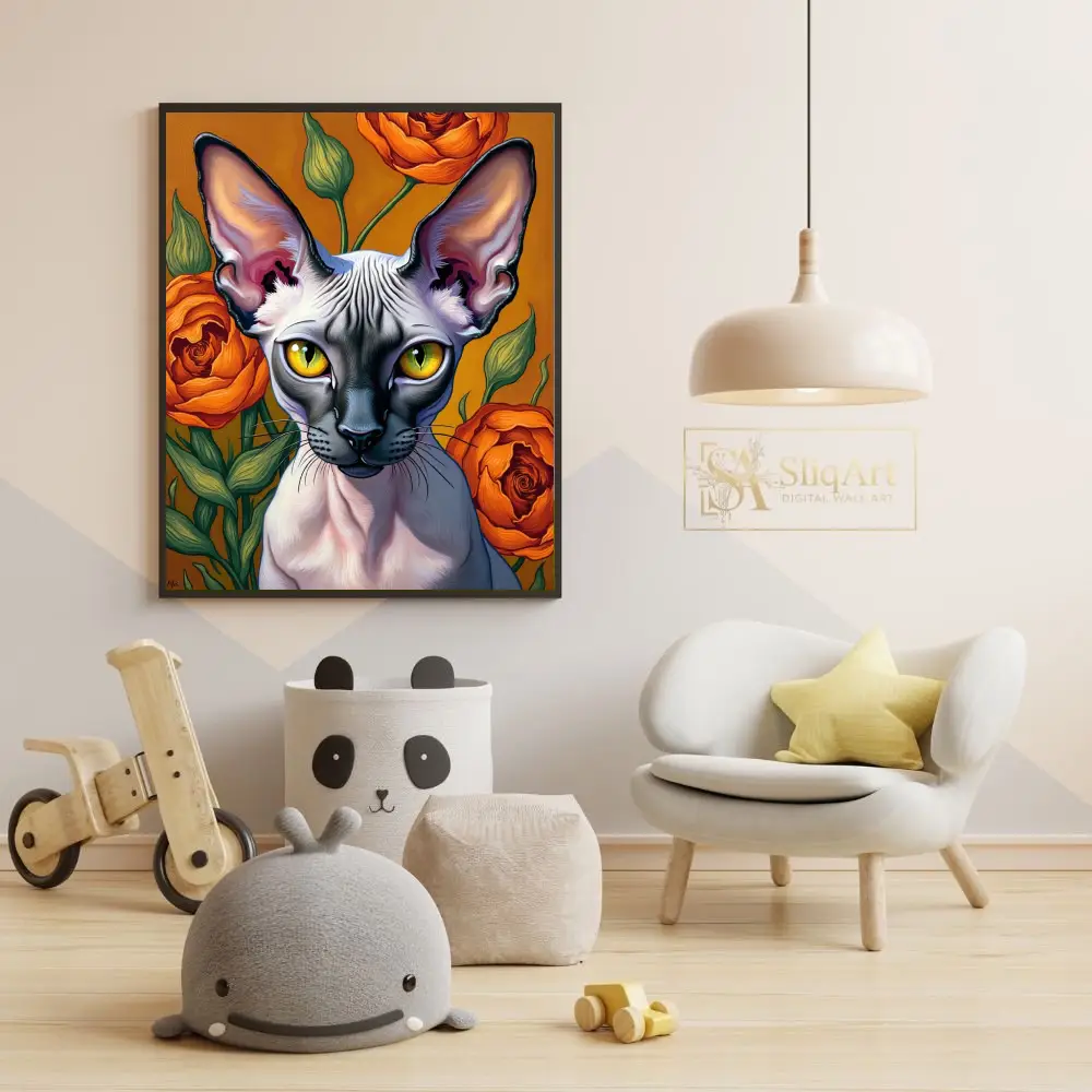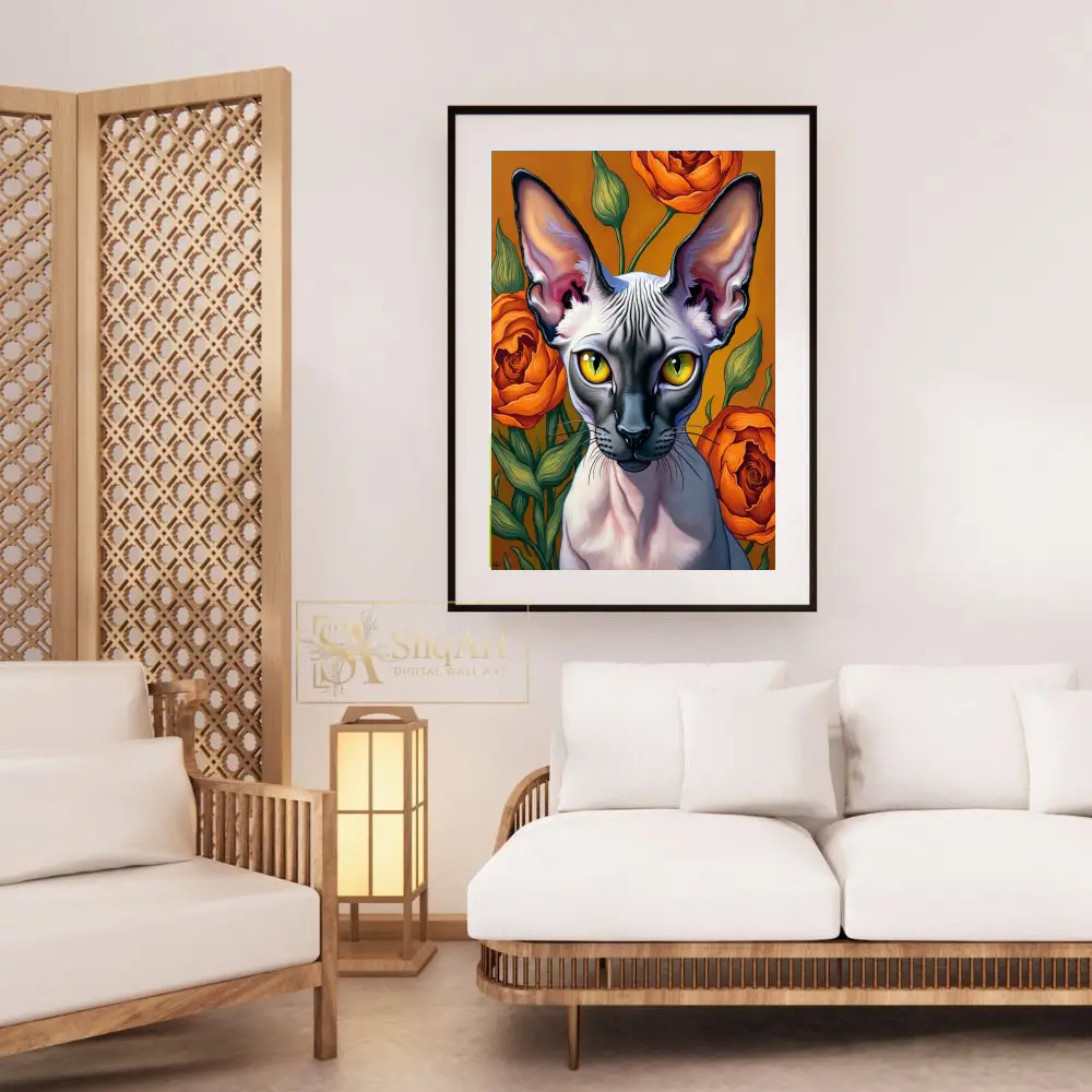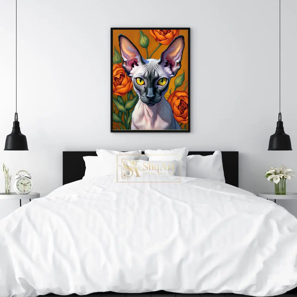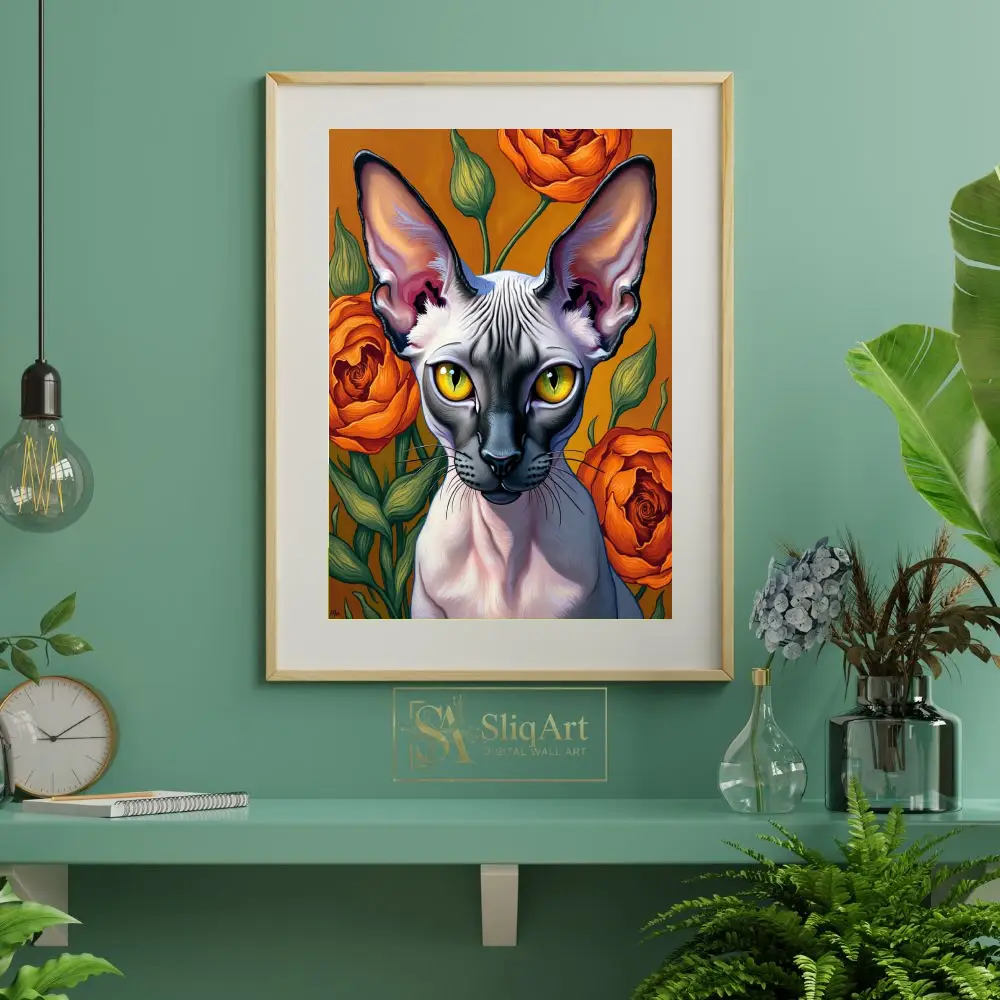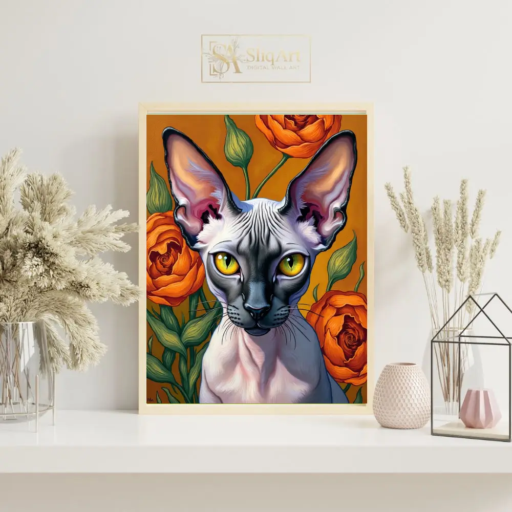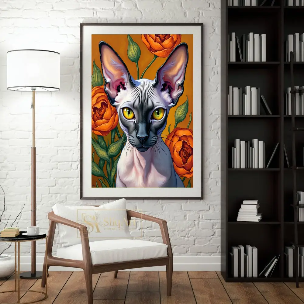 This captivating piece features a detailed portrait of a Sphynx cat set against a backdrop of lush, blooming orange roses. The artist masterfully captures the unique texture and elegant lines of the hairless cat, emphasizing its large, expressive ears and piercing yellow eyes.