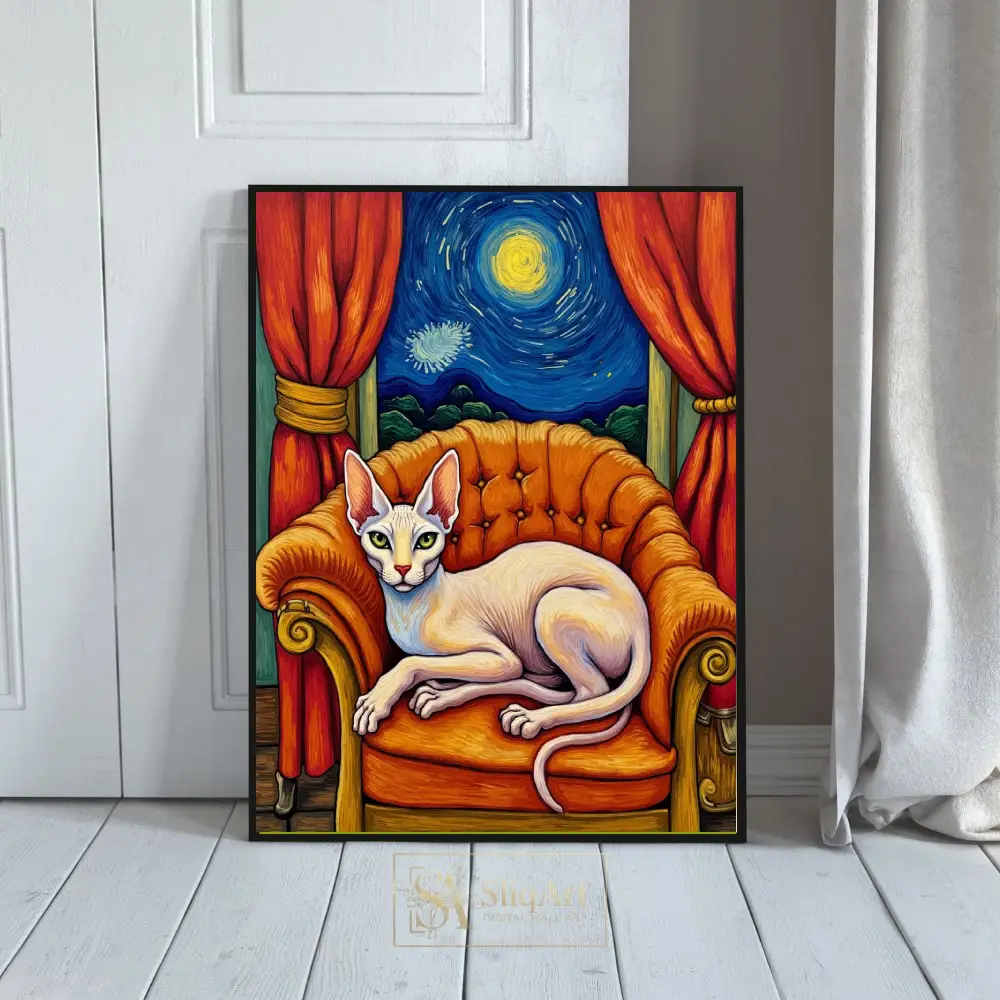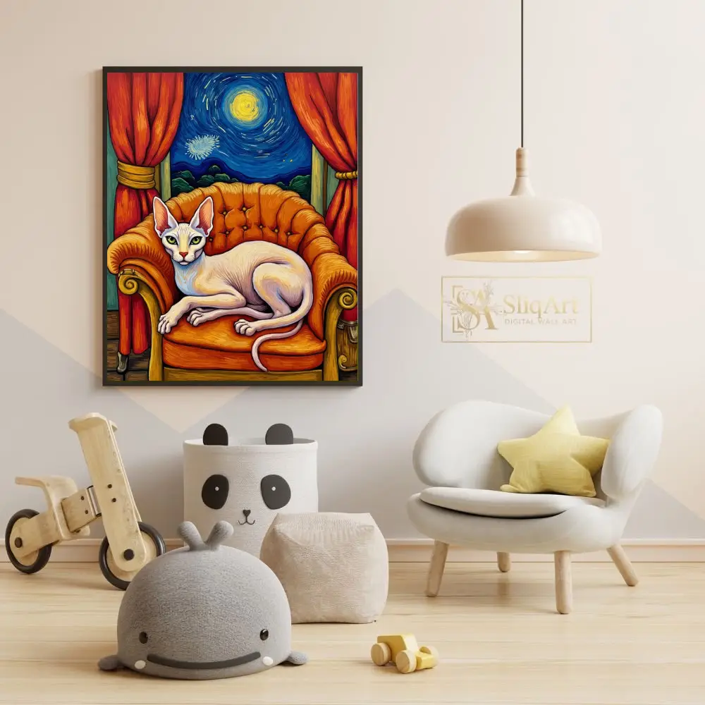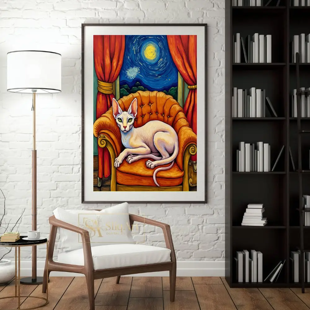Step into a world of vibrant color and artistic homage with this unique Sphynx cat portrait. Set in a cozy interior, a pale Sphynx cat lounges on a tufted orange armchair, framed by heavy red curtains.