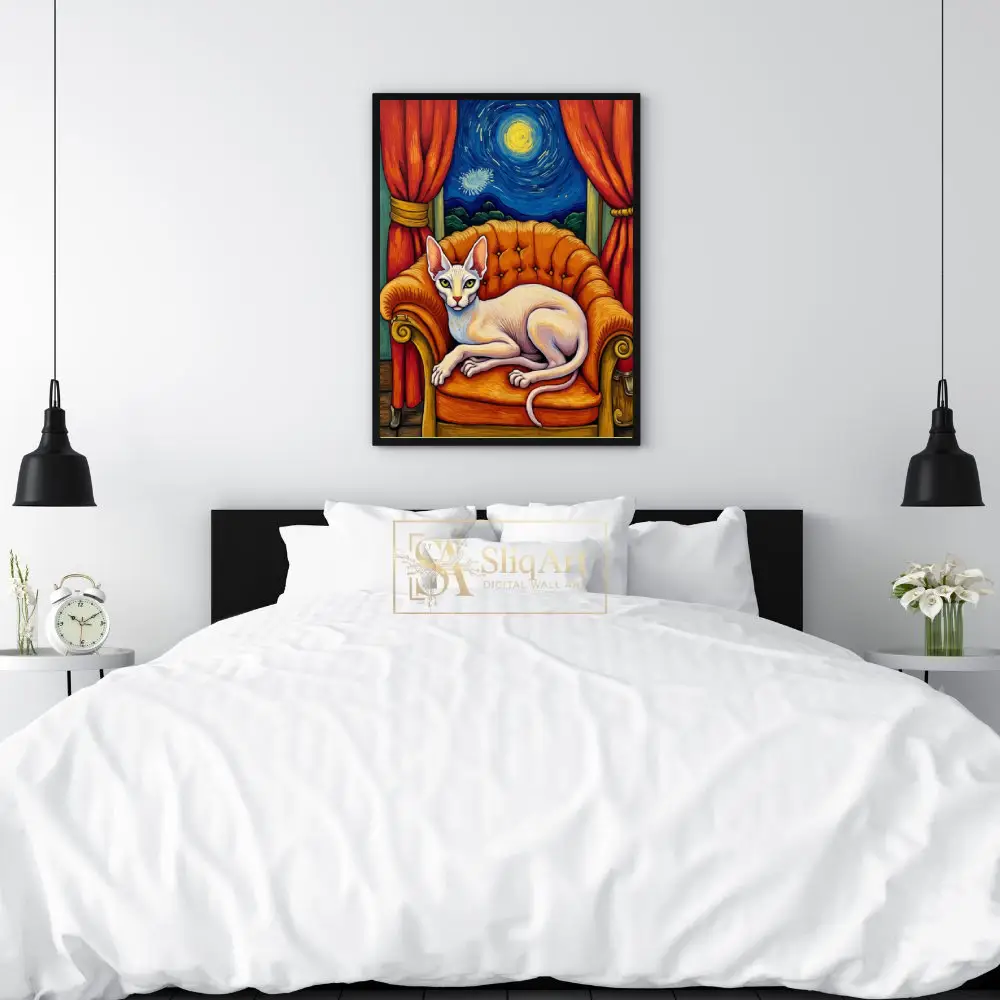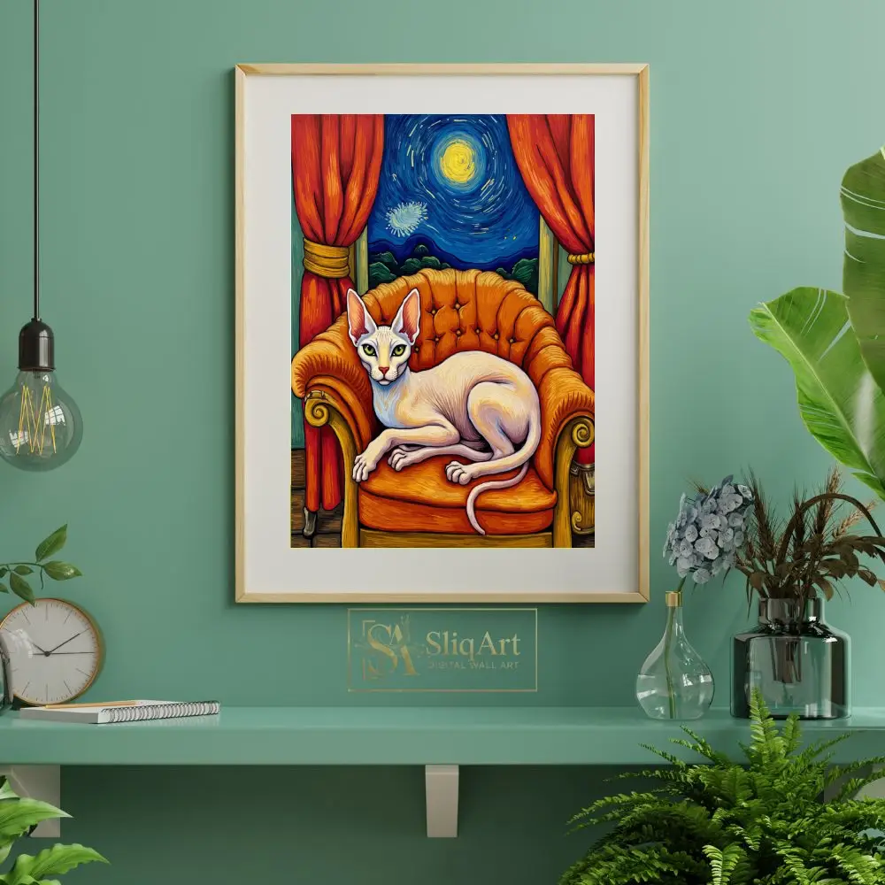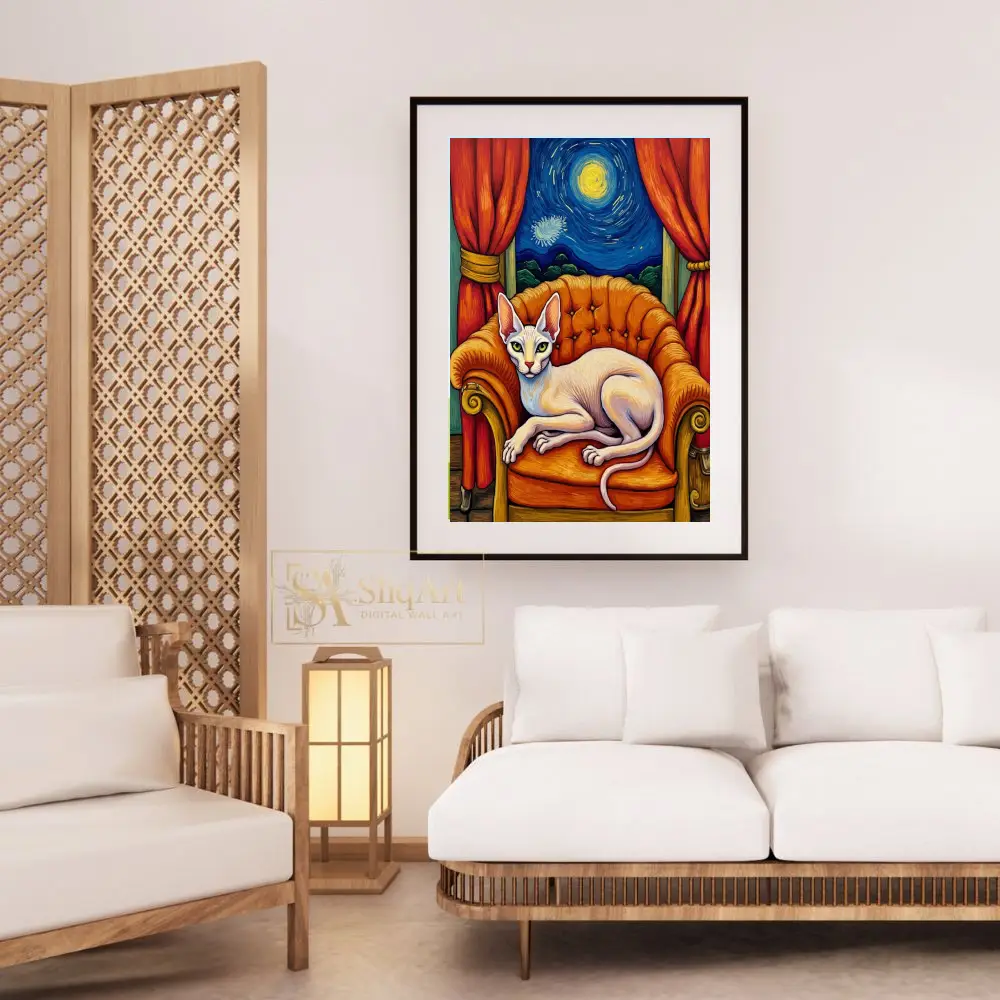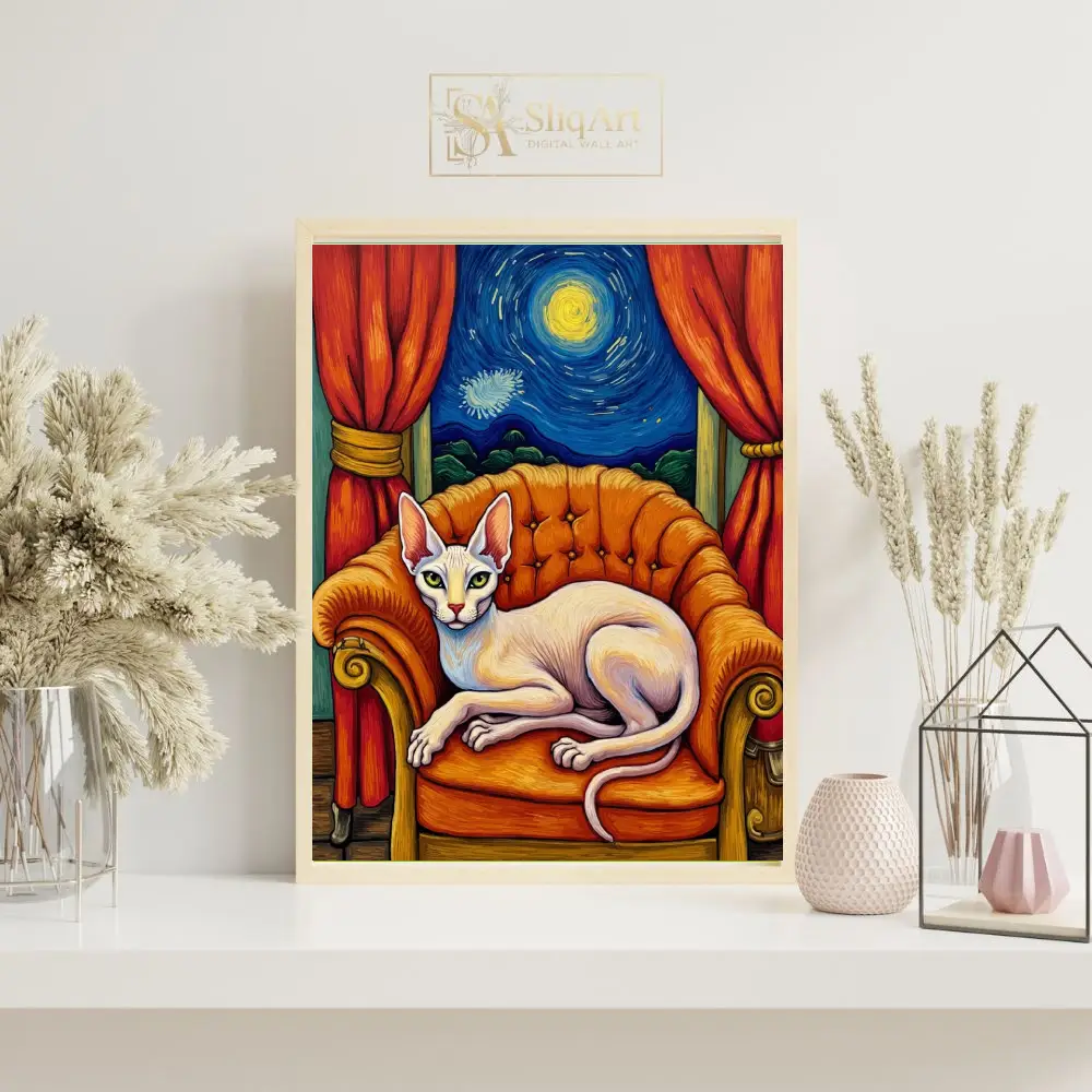 Step into a world of vibrant color and artistic homage with this unique Sphynx cat portrait. Set in a cozy interior, a pale Sphynx cat lounges on a tufted orange armchair, framed by heavy red curtains.
