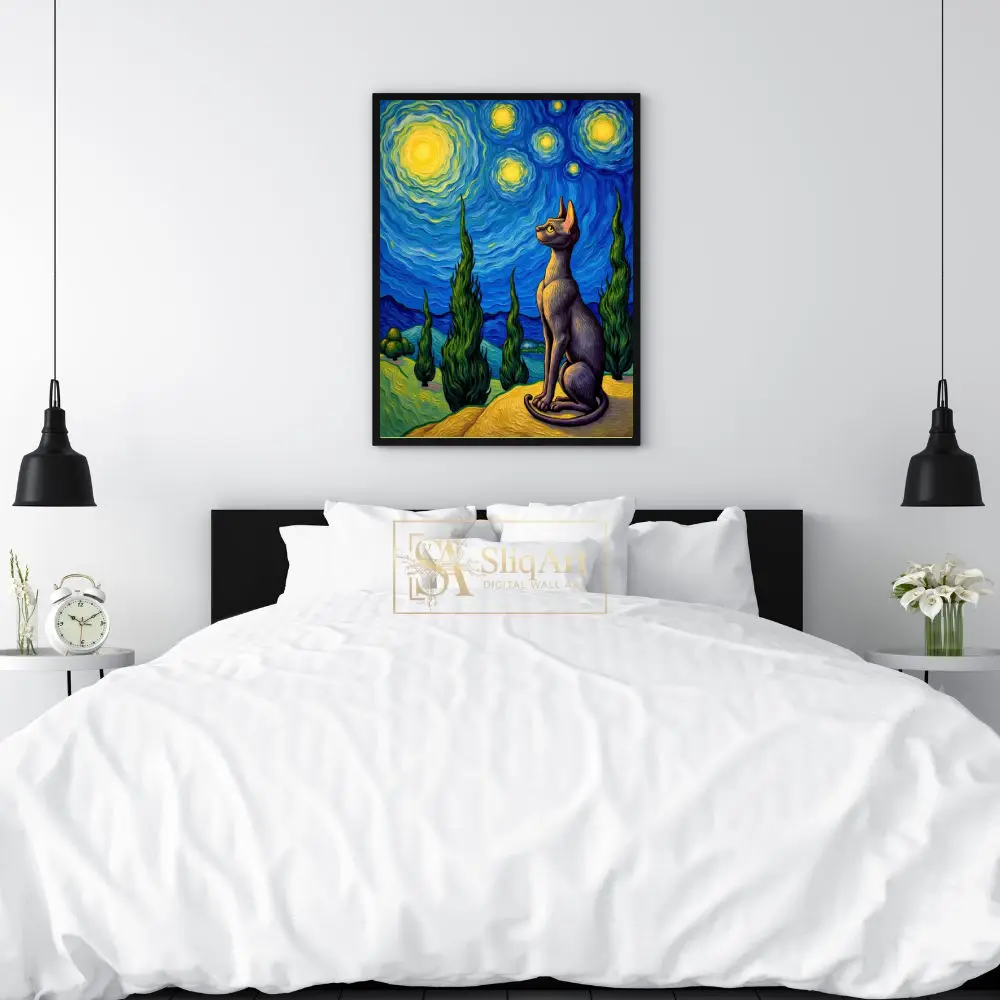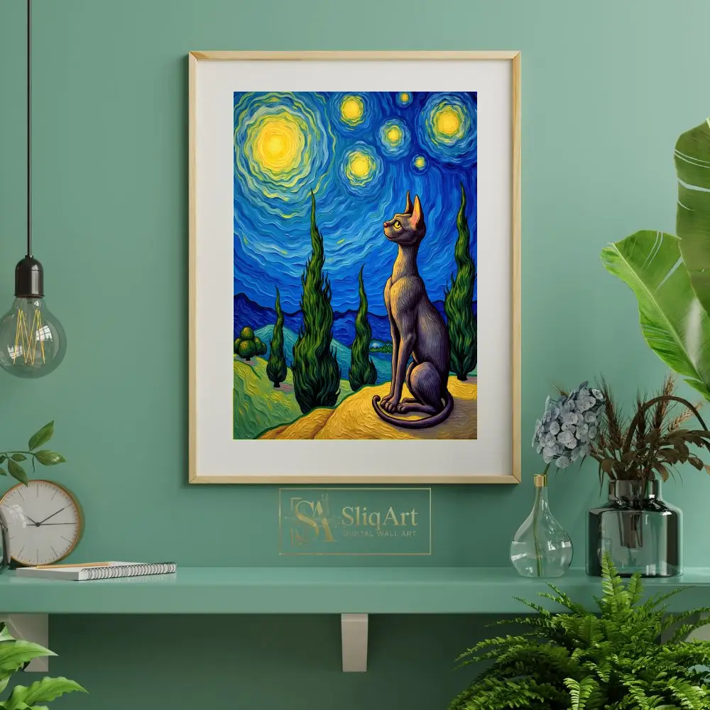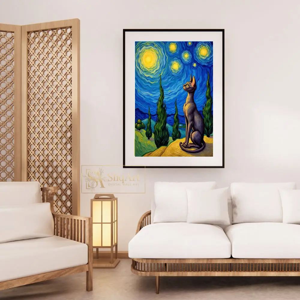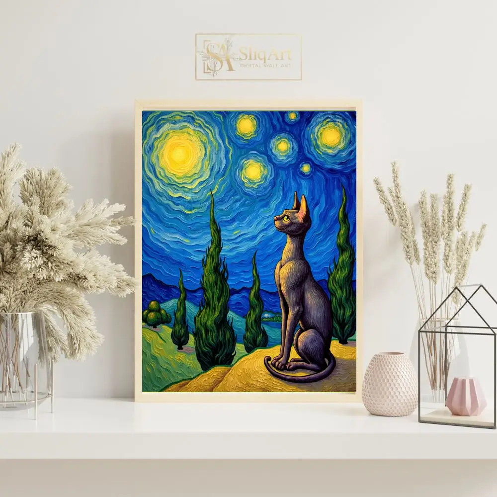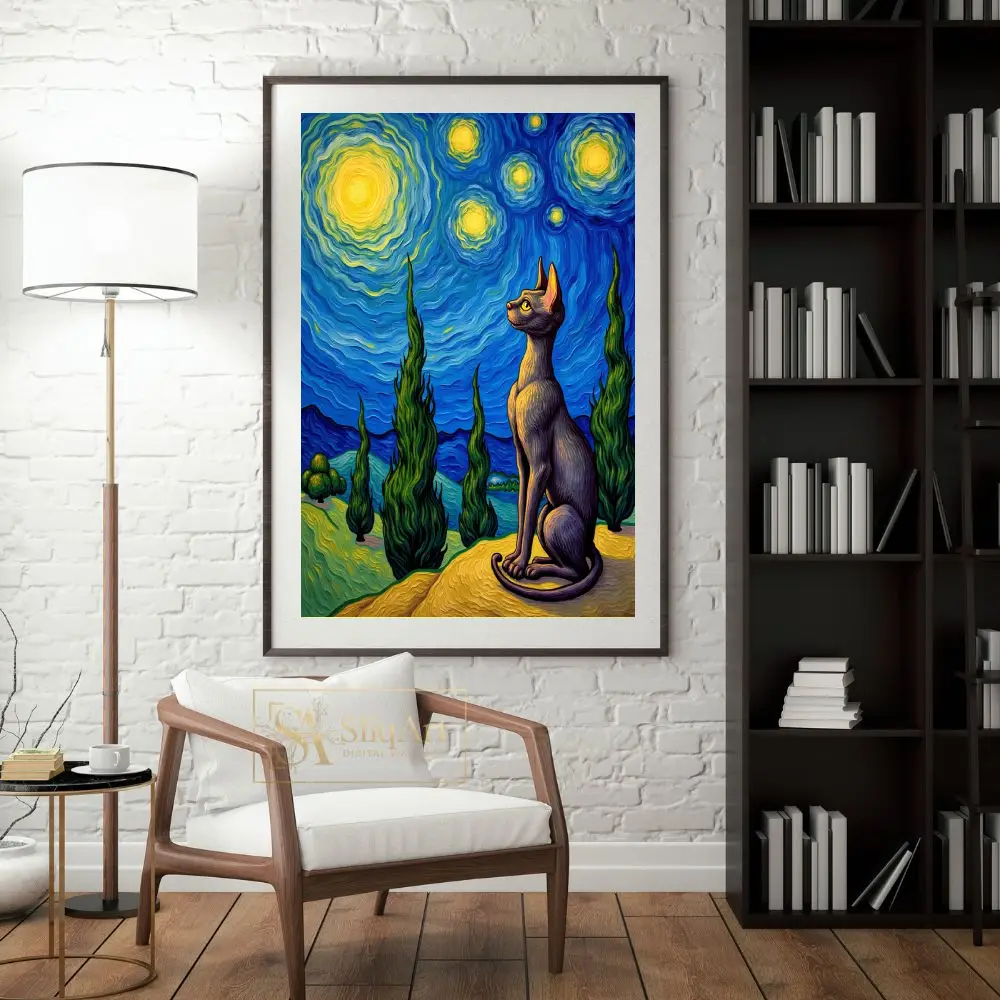Elevate your interior design with a whimsical tribute to one of art history’s greatest masterpieces. This stunning canvas print features a regal Sphynx cat contemplating a vibrant, swirling night sky, reimagined in the iconic post-impressionist style of Vincent van Gogh.