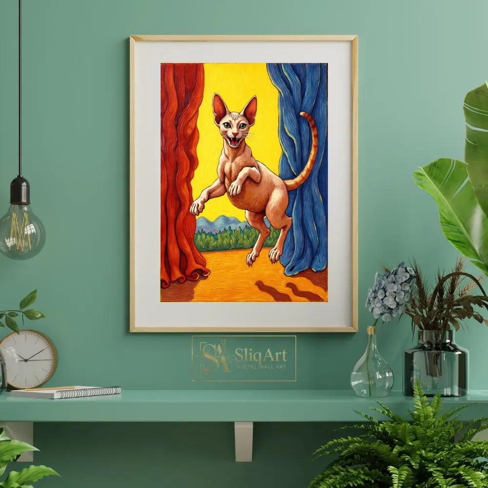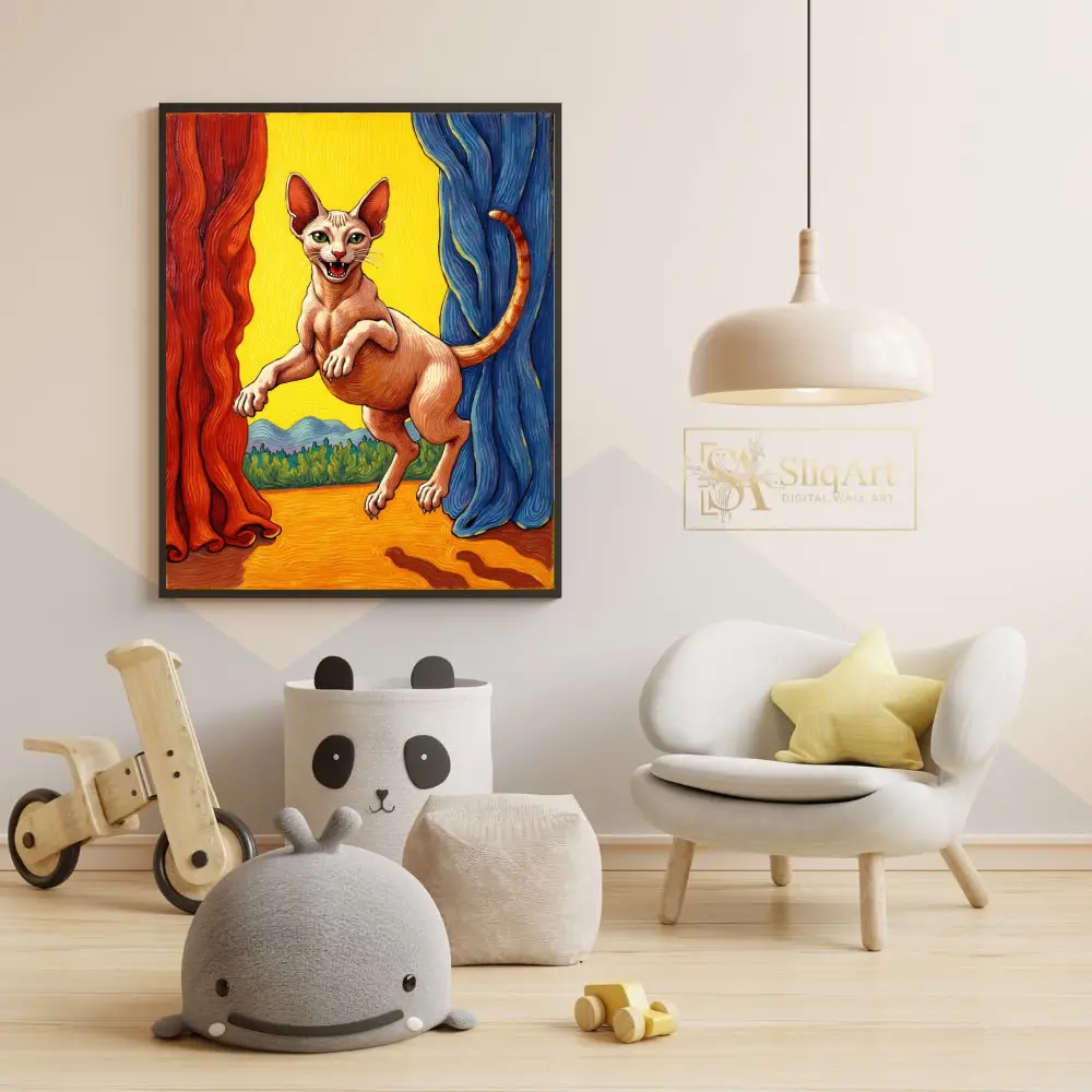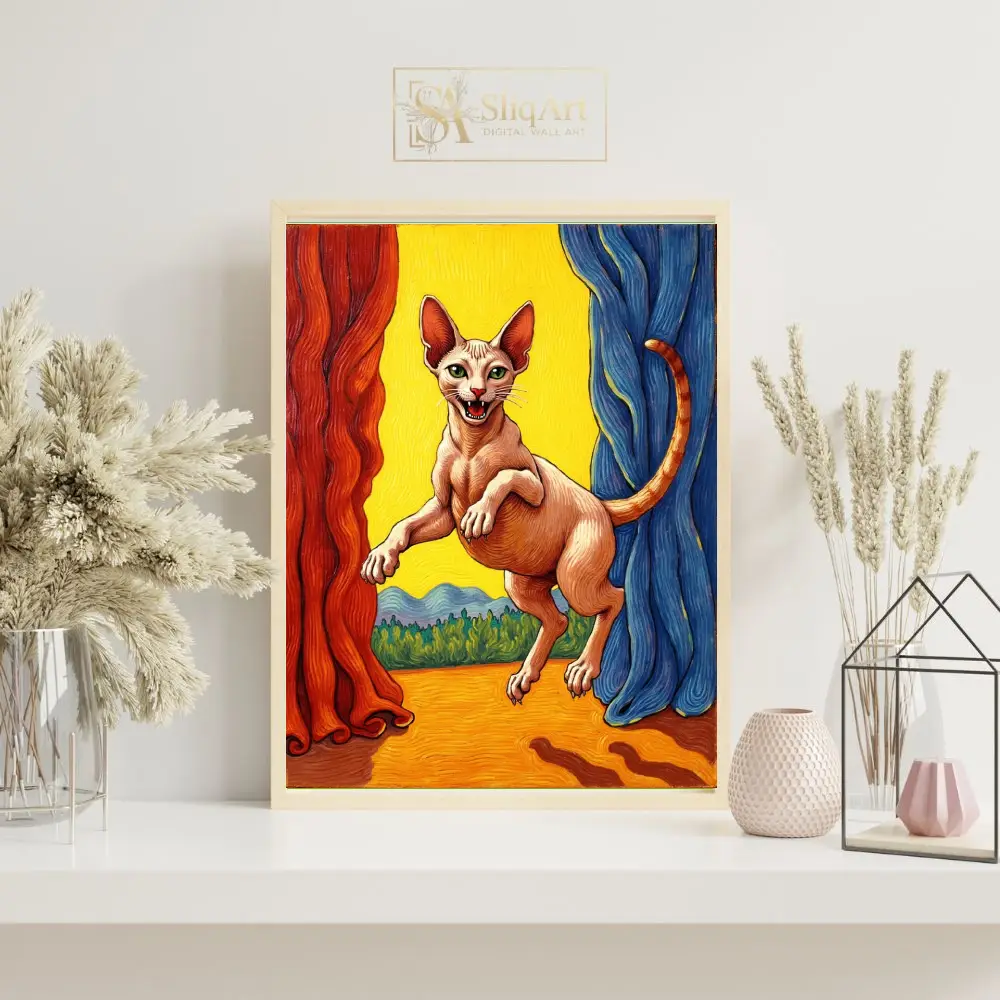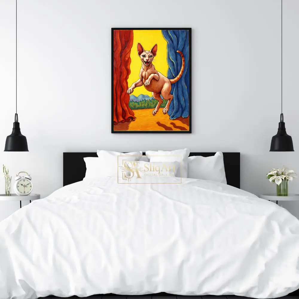The piece captures a playful Sphynx in mid-air, framed by theatrical red and blue curtains against a glowing yellow horizon. With its rich textures and bold primary colors, this artwork blends a sense of drama with whimsical feline charm, making it a perfect conversation starter for any modern interior.