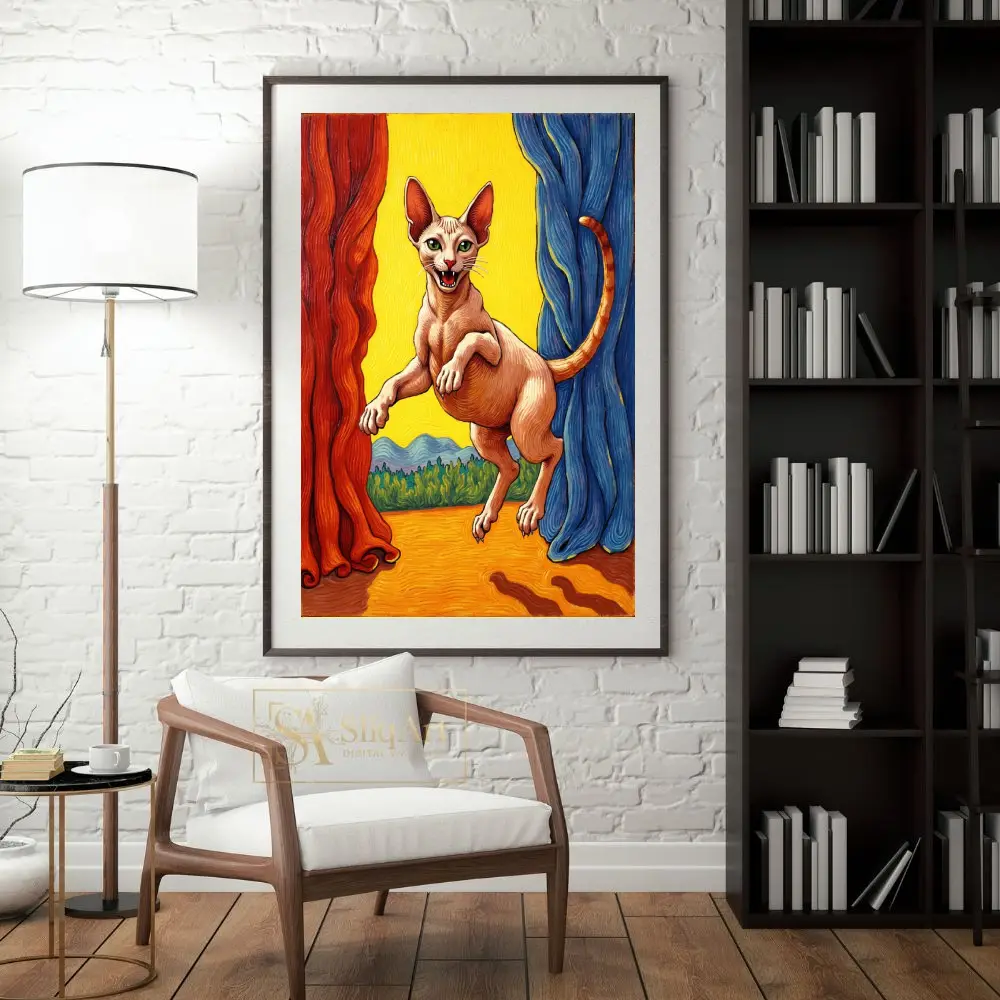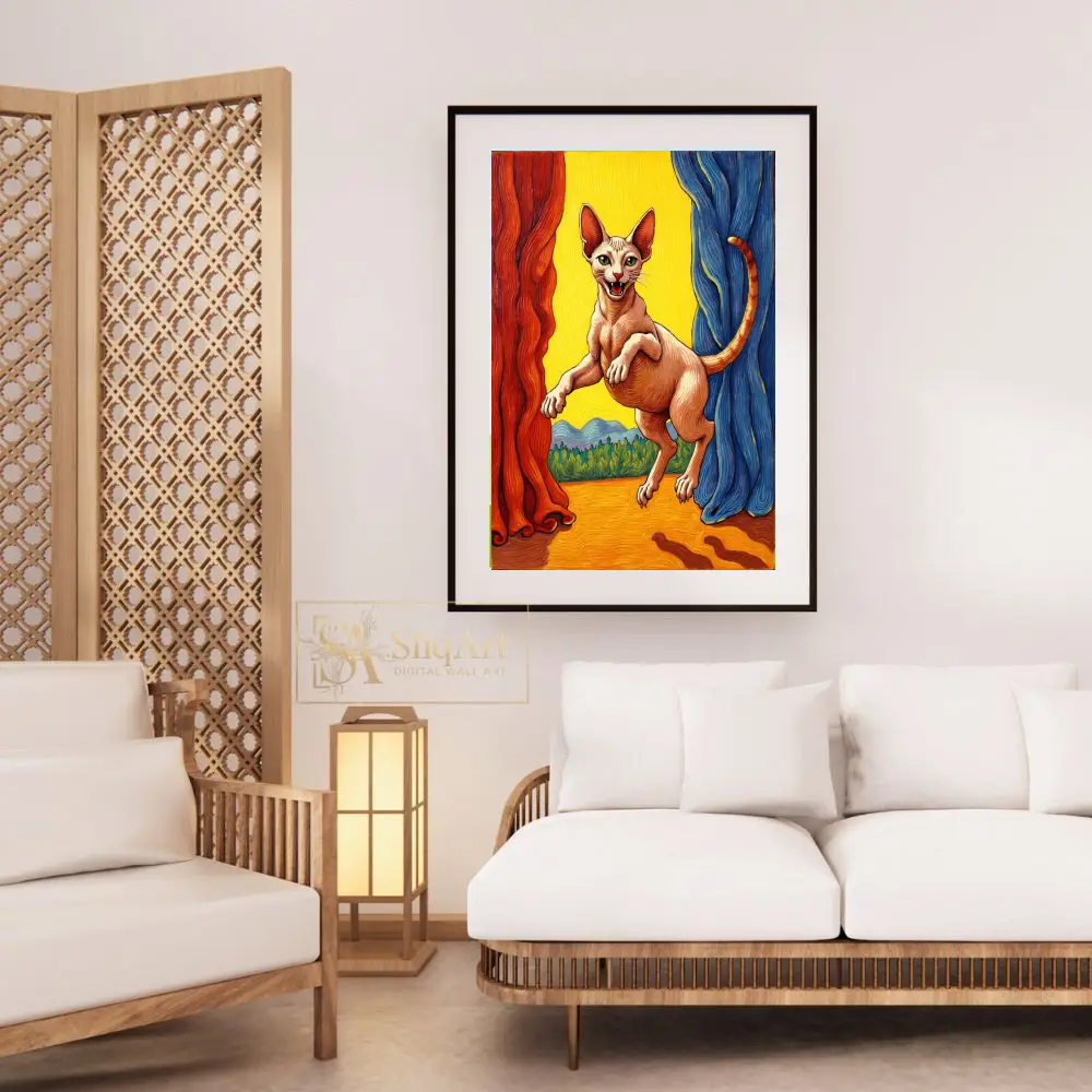 Add a burst of energy and personality to your home with this striking hairless cat illustration.