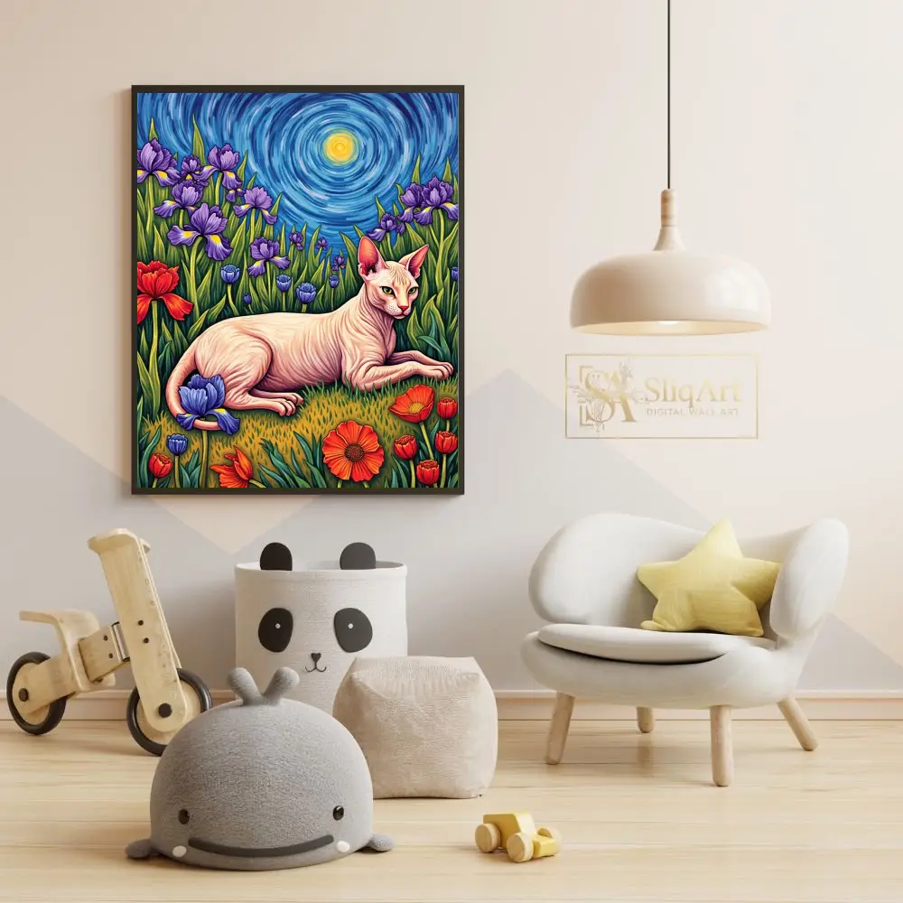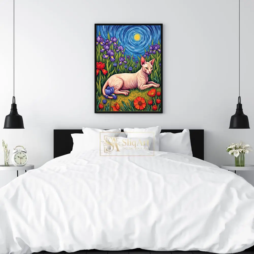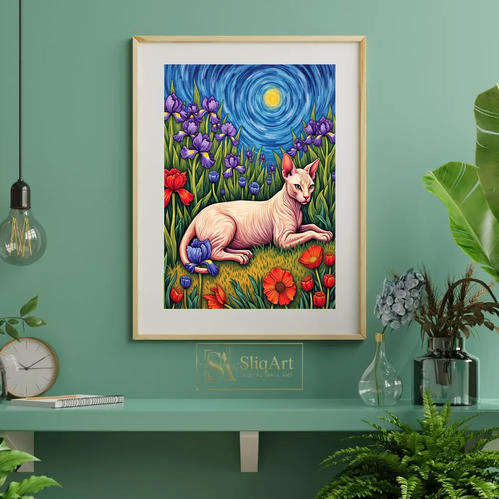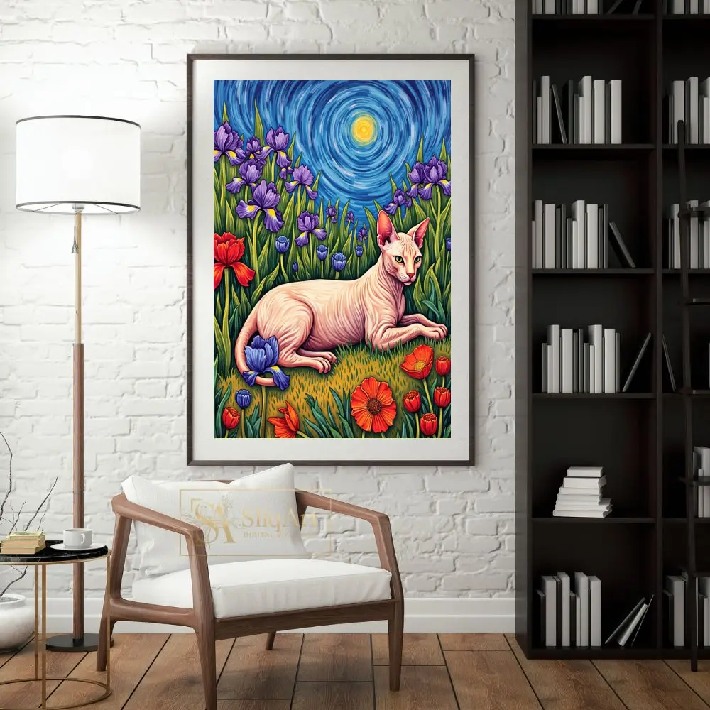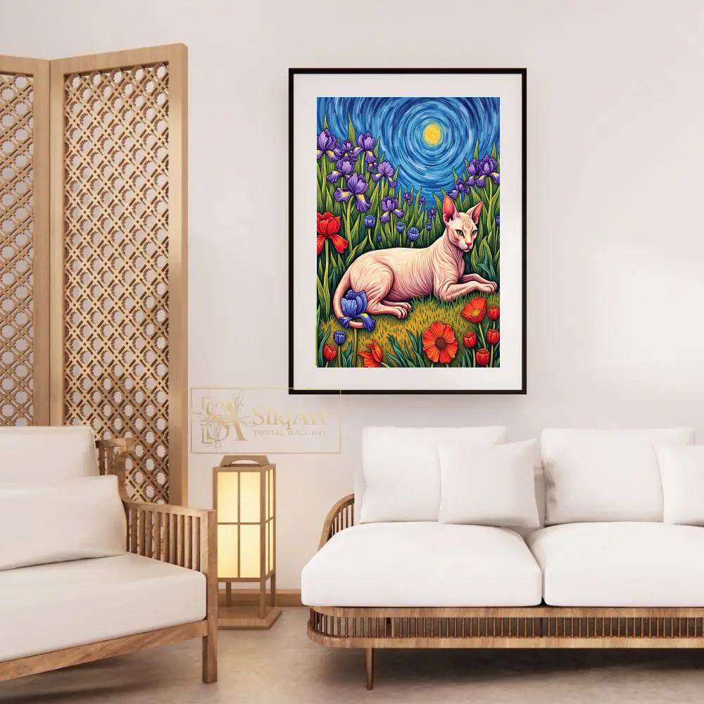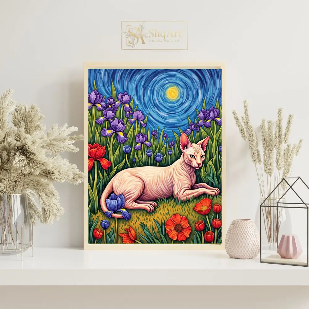 Enhance your interior with a masterpiece that blends classical art inspiration with feline charm. This Sphynx cat wall art pays homage to the iconic Post-Impressionist style of Vincent van Gogh, featuring a graceful hairless cat lounging in a field of vivid purple irises and bold red tulips.