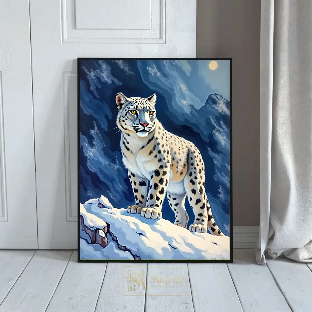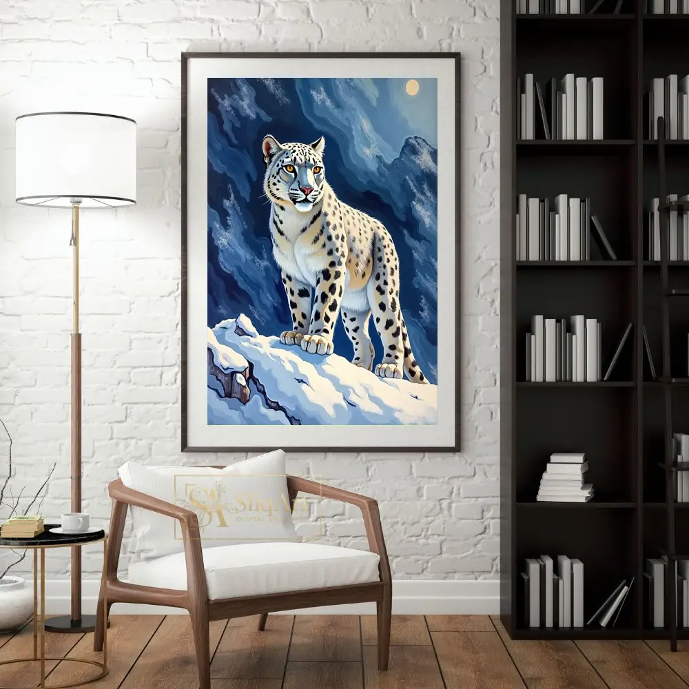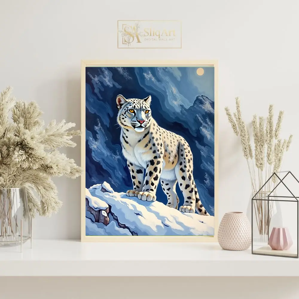 Capture the silent power and ethereal beauty of the high mountains with this stunning snow leopard art piece. Featuring a majestic leopard perched upon a snowy ridge, the artwork uses swirling blue patterns to depict a mystical sky under the glow of a full moon.