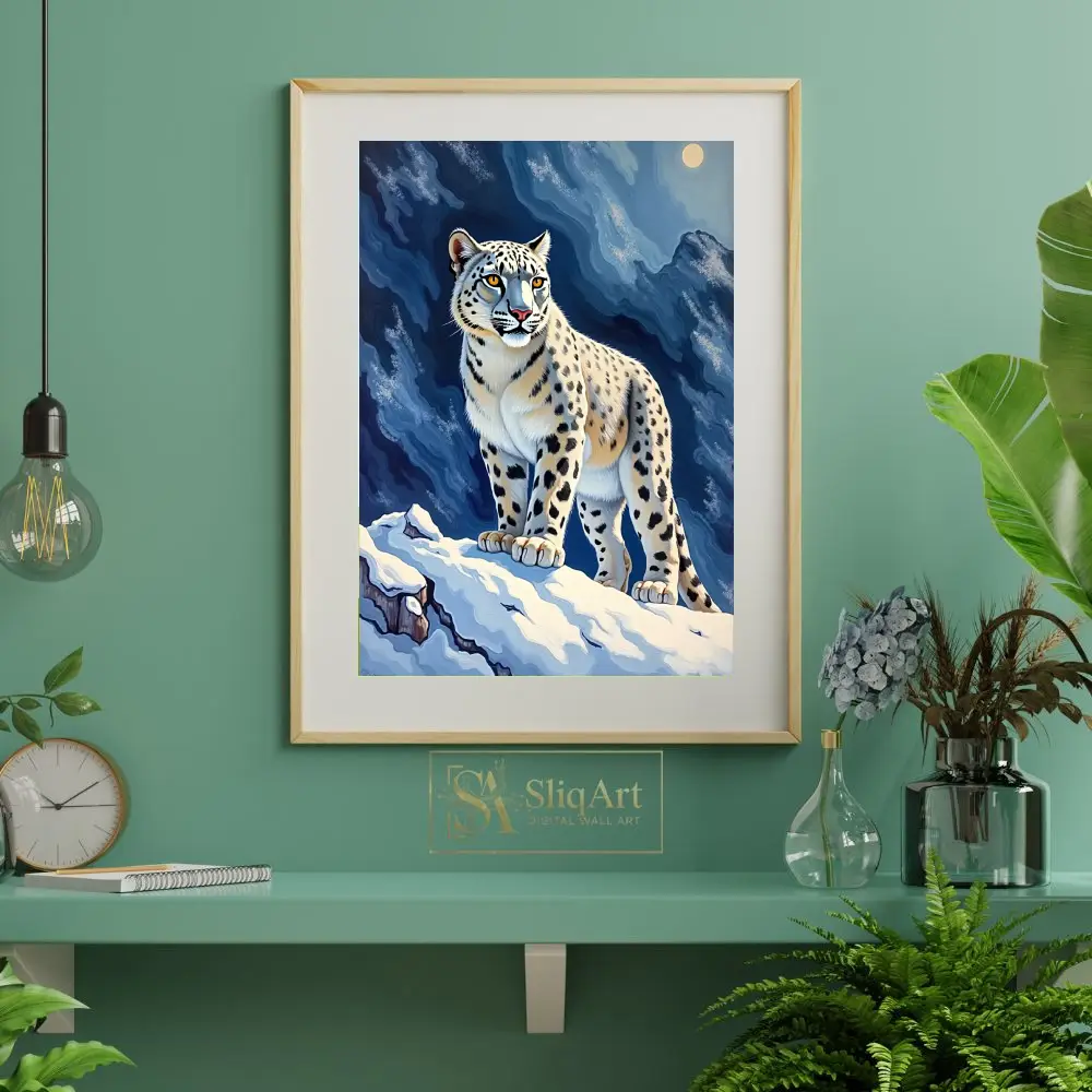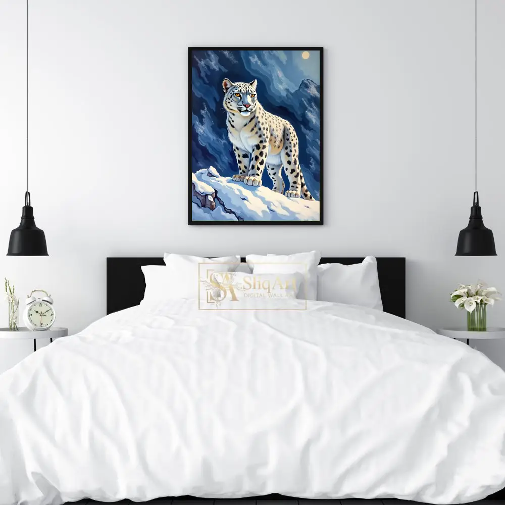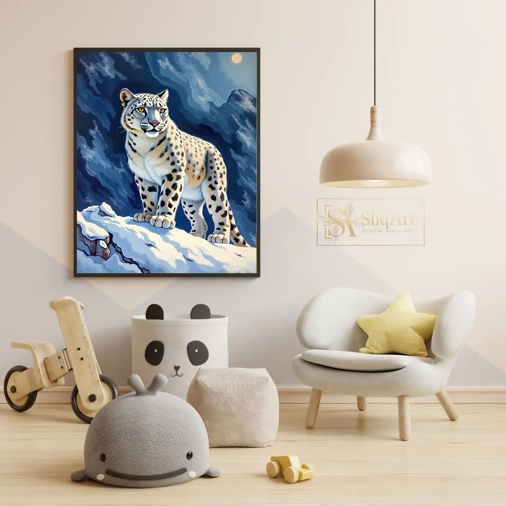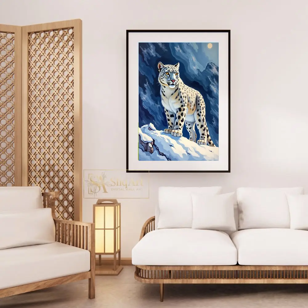 Capture the silent power and ethereal beauty of the high mountains with this stunning snow leopard art piece. Featuring a majestic leopard perched upon a snowy ridge, the artwork uses swirling blue patterns to depict a mystical sky under the glow of a full moon.