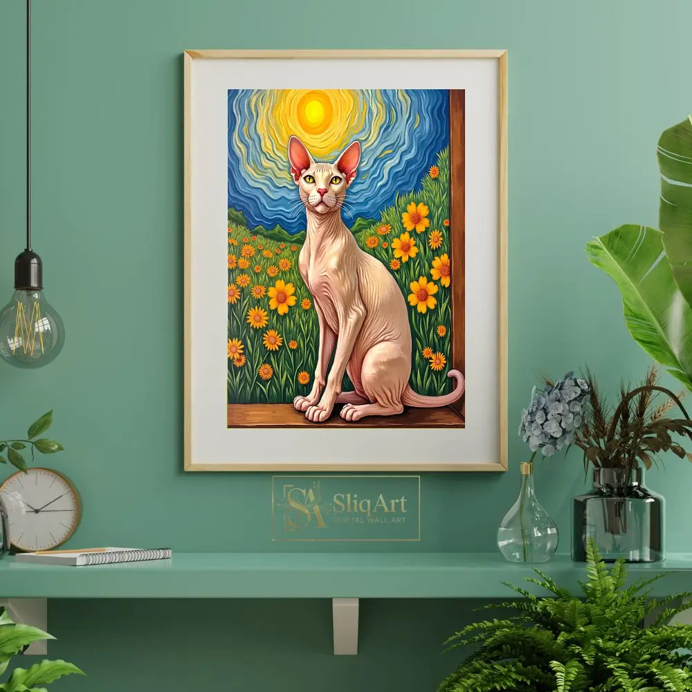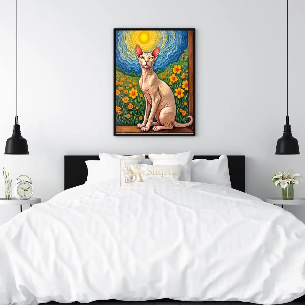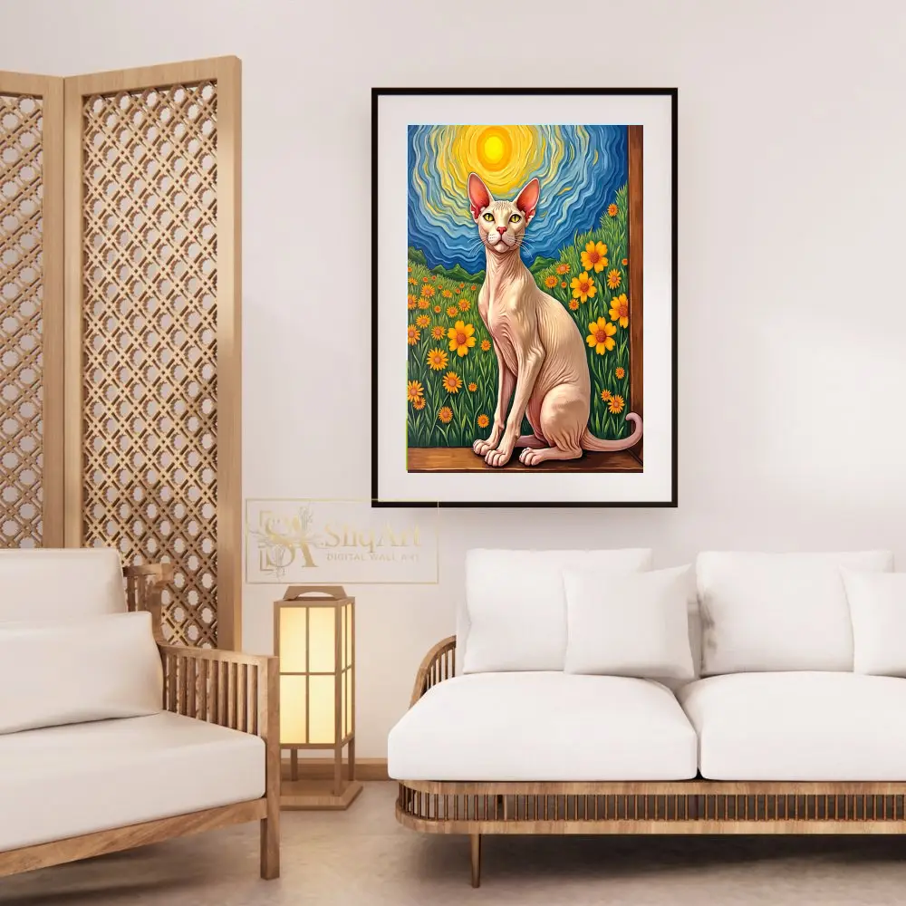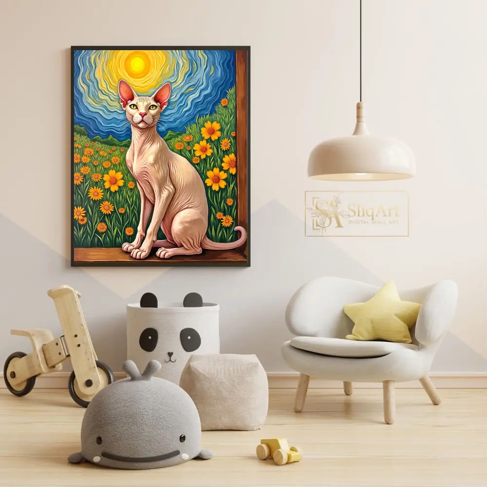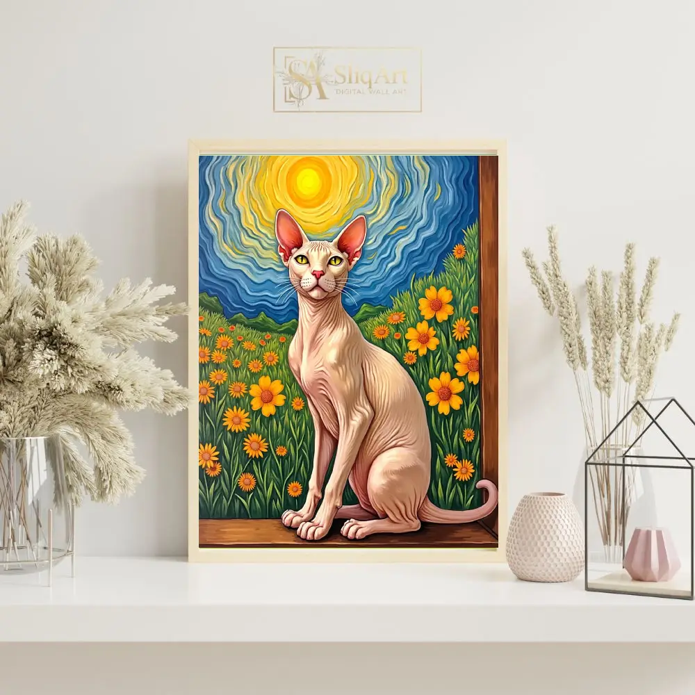 Above, a radiant sun swirls with energetic brushstrokes in shades of yellow and deep blue, echoing the iconic movement of Vincent van Gogh. This piece combines the elegance of the Sphynx breed with the bold, emotional texture of classic impressionism, making it a sophisticated conversation starter for any modern home decor.