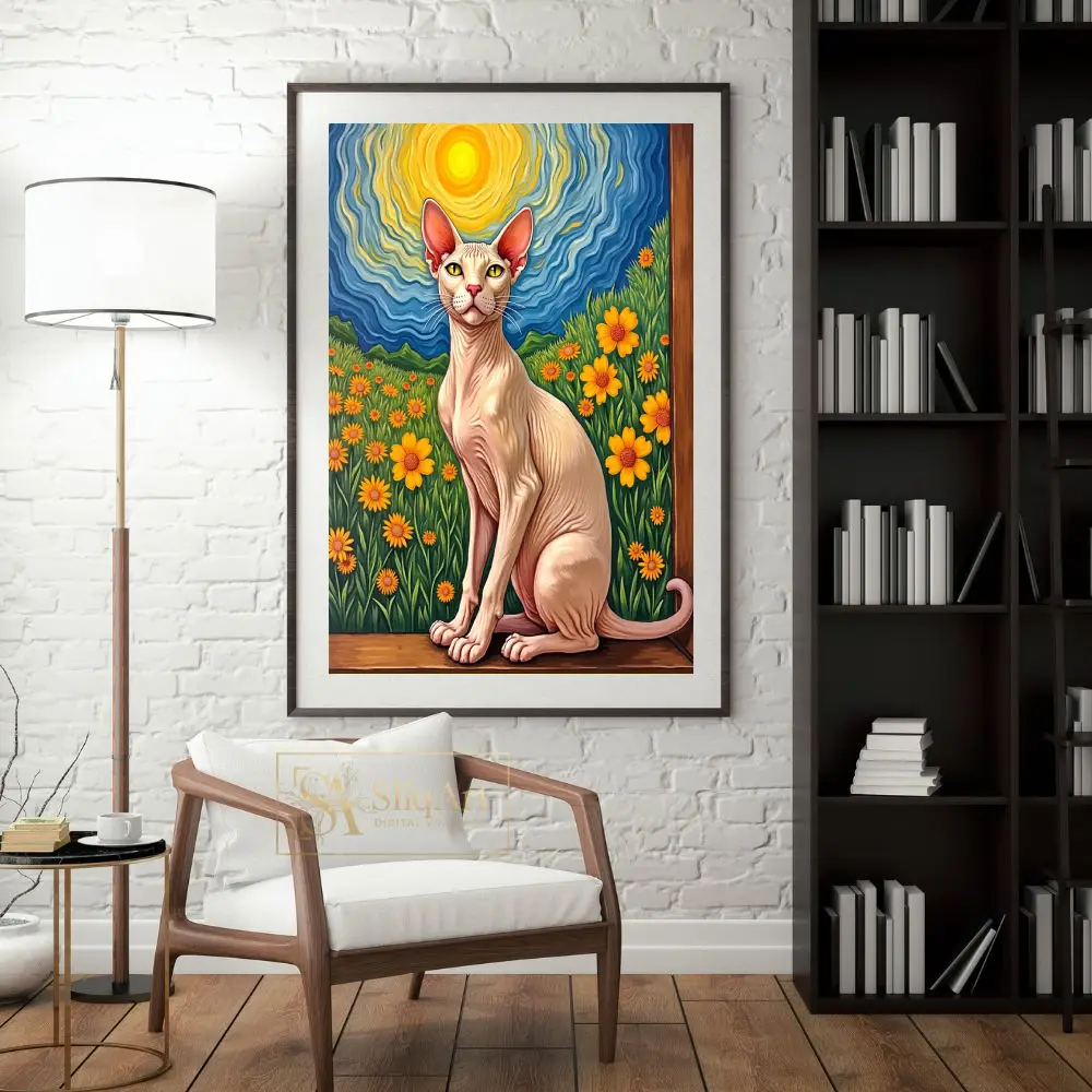 Experience the unique beauty of this Sphynx cat portrait, rendered in a mesmerizing Post-Impressionist style. The artwork features a graceful, hairless cat seated majestically amidst a vibrant field of golden sunflowers.