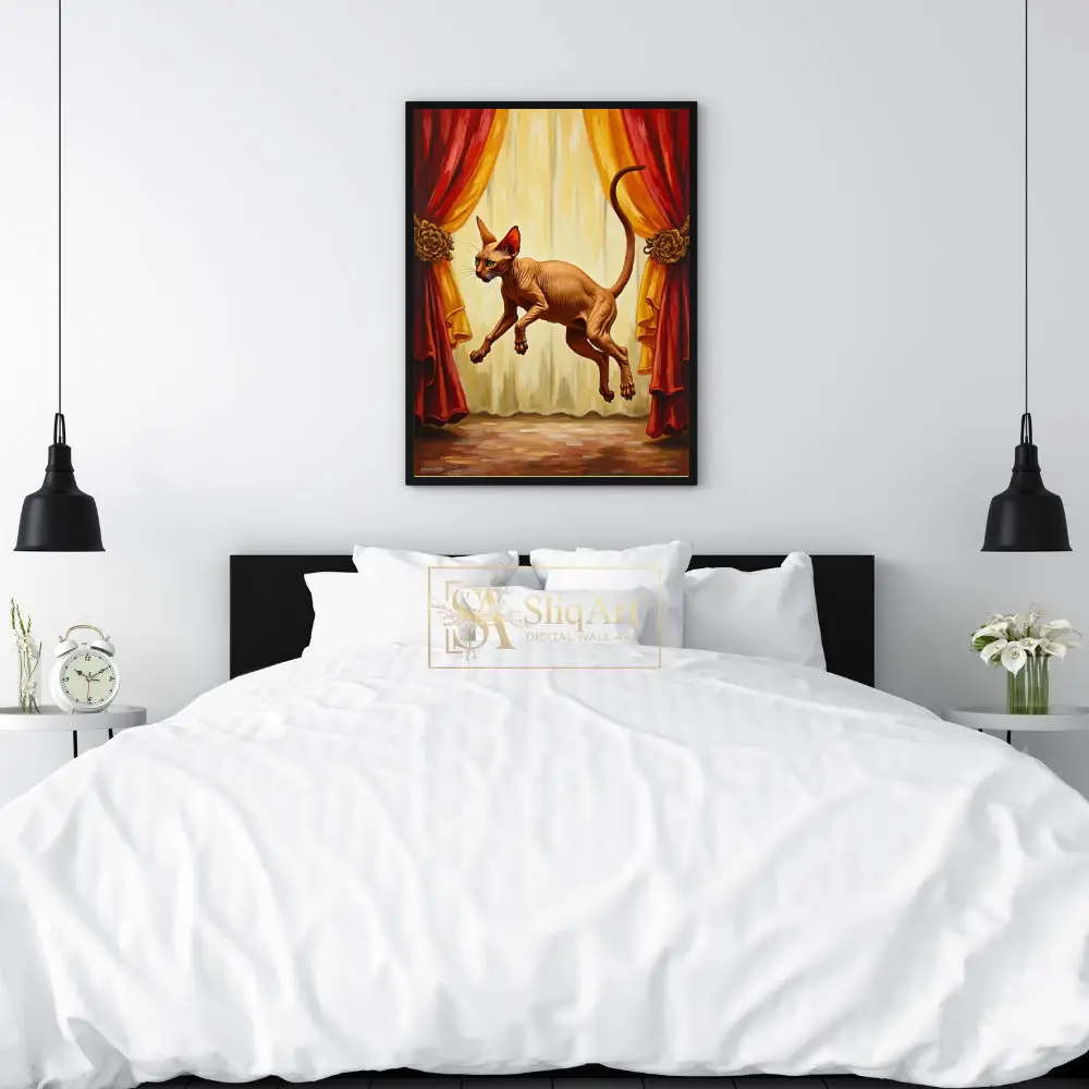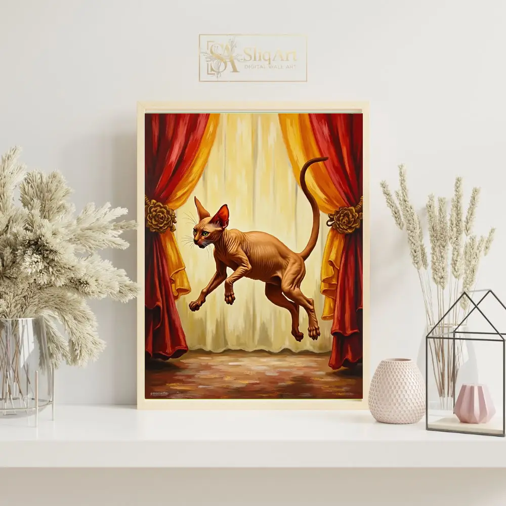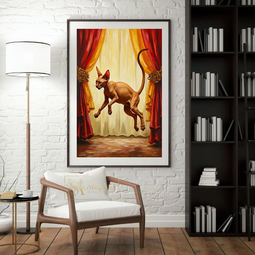 A dramatic and whimsical canvas print of a Sphynx cat leaping gracefully in front of elegant red and gold stage curtains.