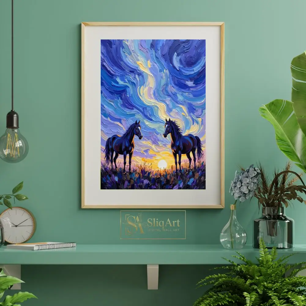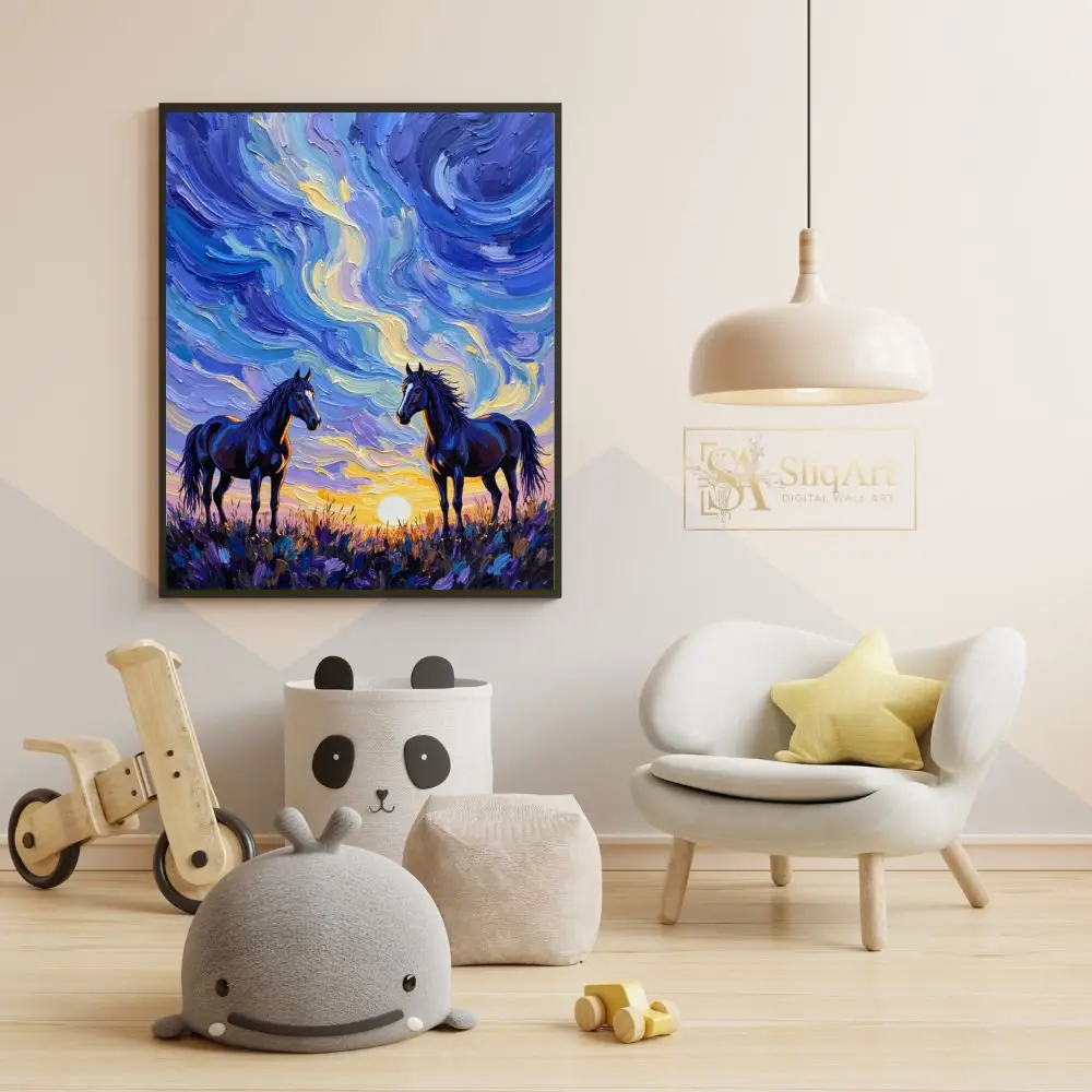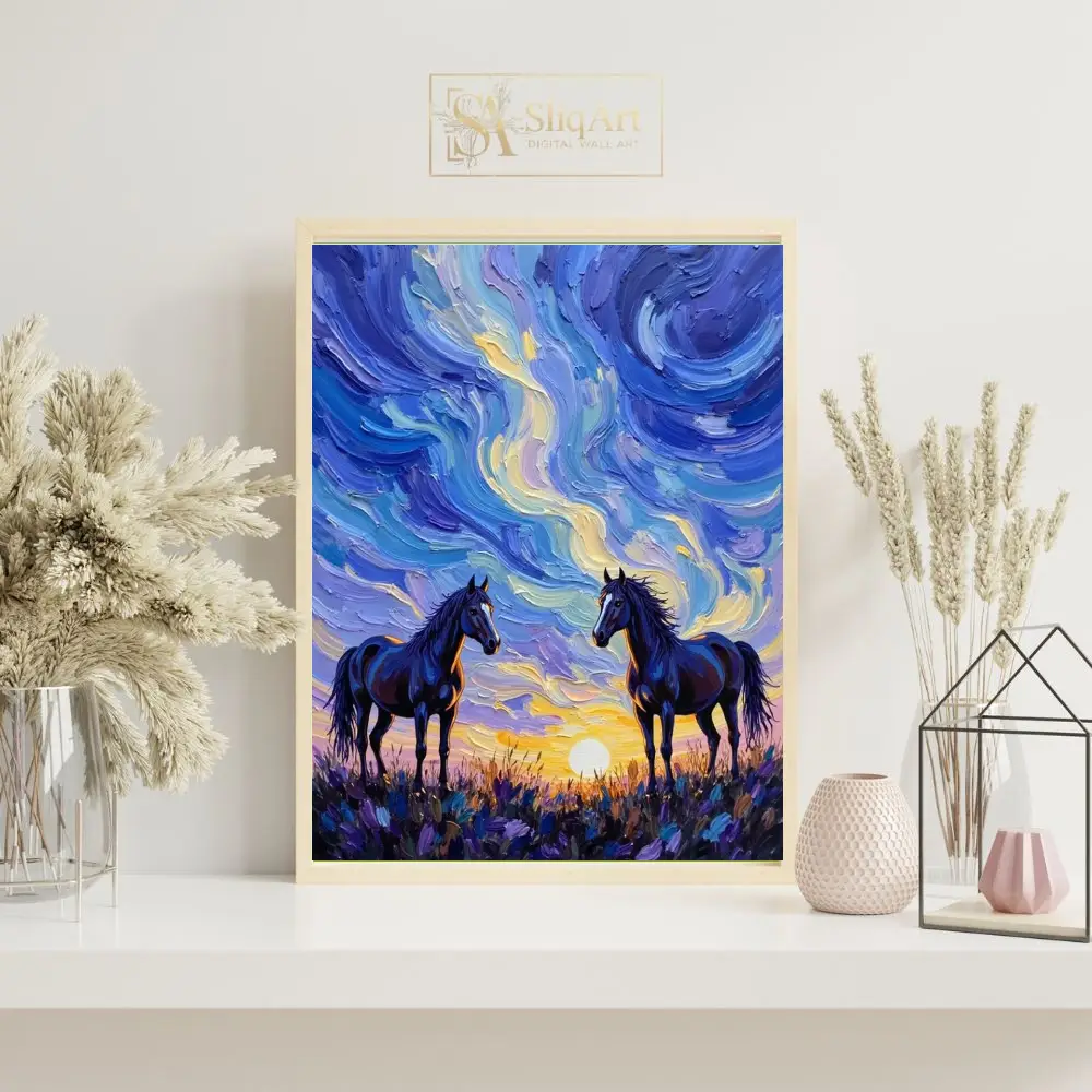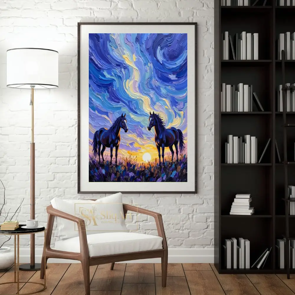 Capture the untamed spirit of the wild with ‘Celestial Sunset Horses.’ This striking canvas art features two majestic dark horses standing amidst a field of wildflowers, framed by a sky alive with swirling, thick-textured brushstrokes. The impasto technique creates a tactile depth that brings the movement of the clouds and the glow of the setting sun to life.