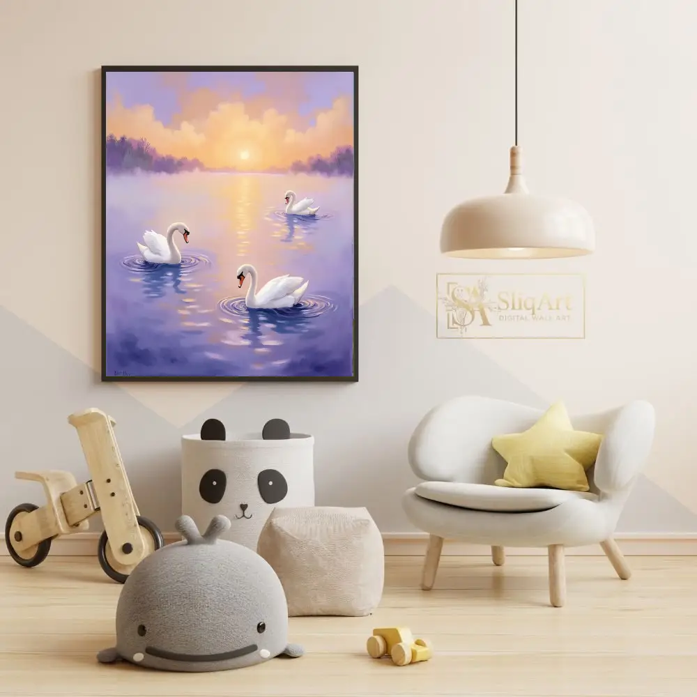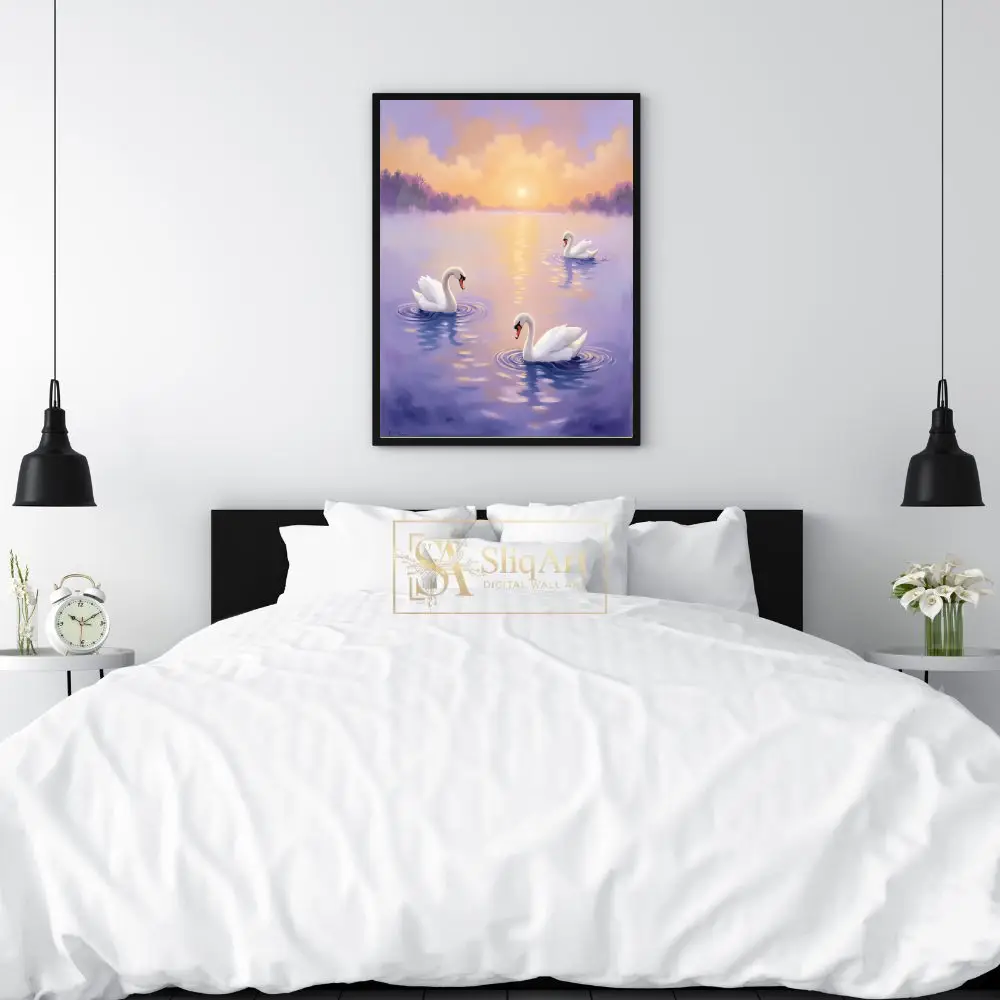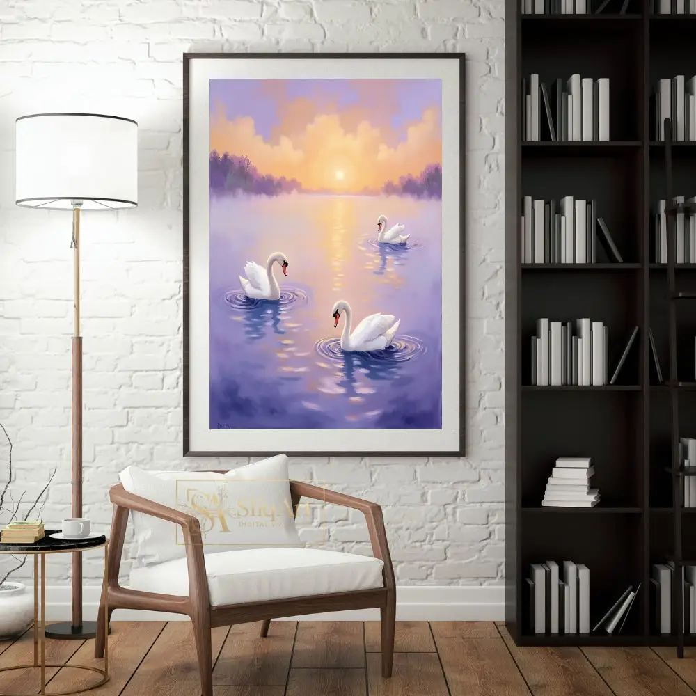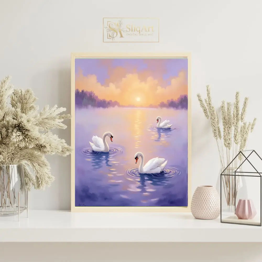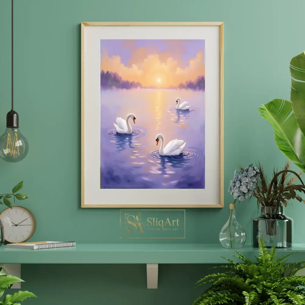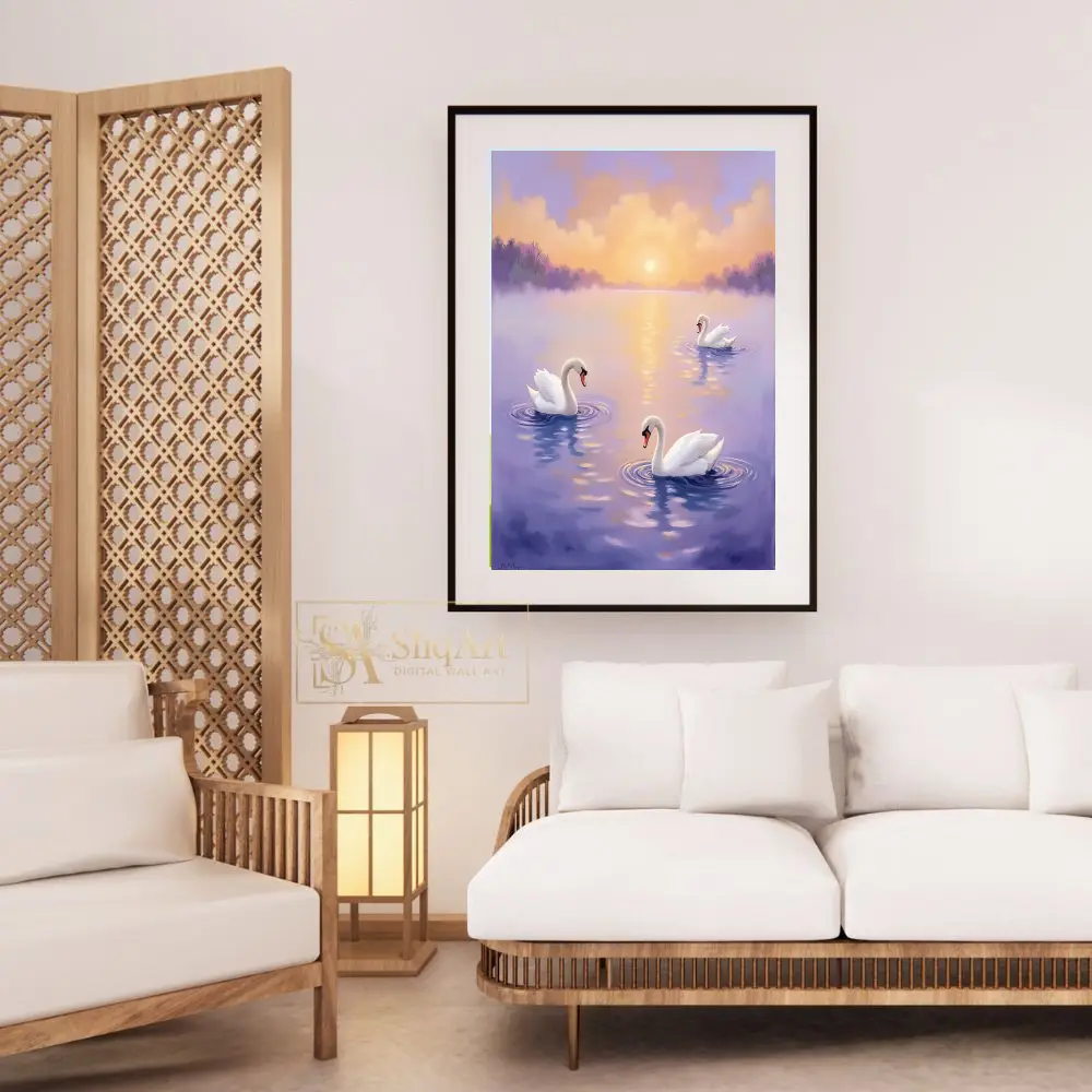 Graceful Swans at Sunset – Serene Lake Wall Art