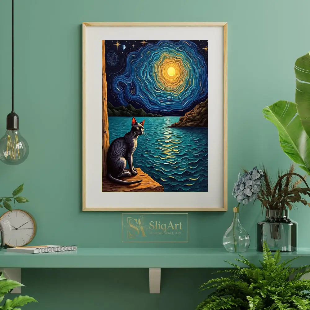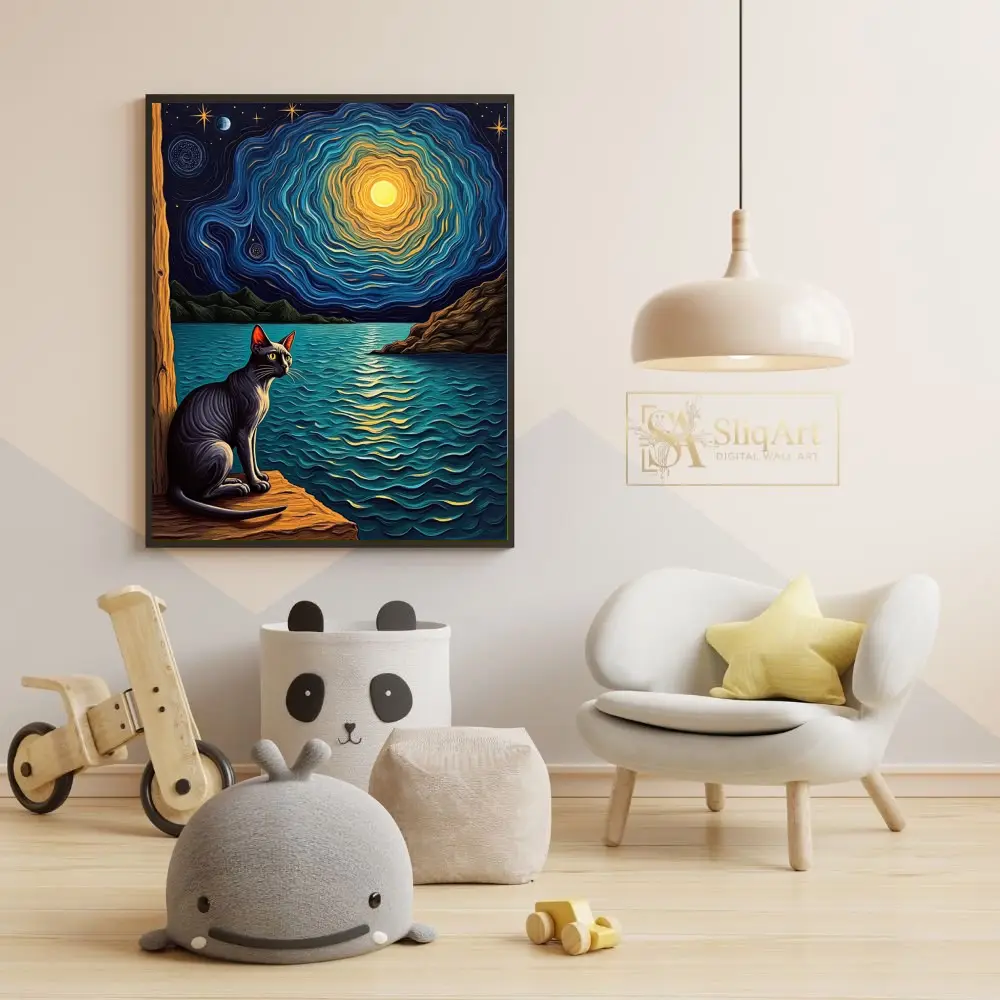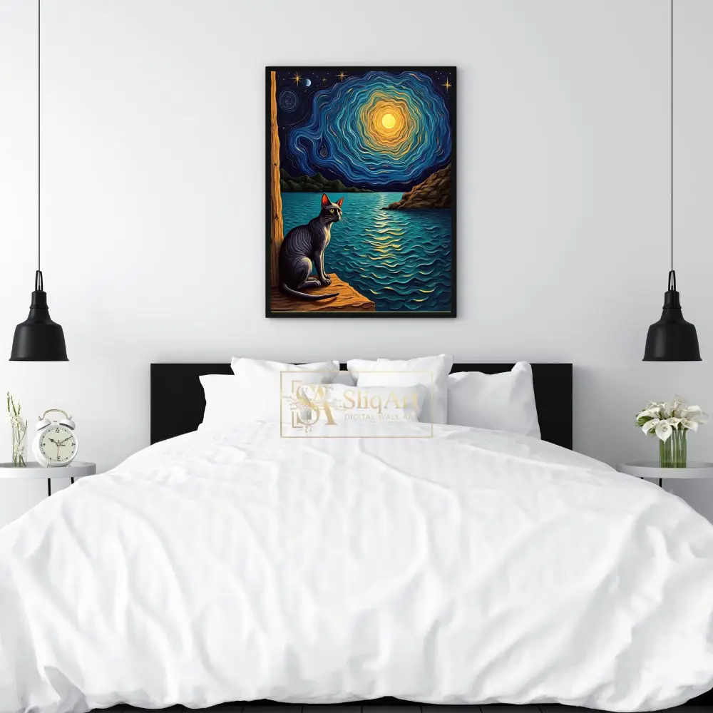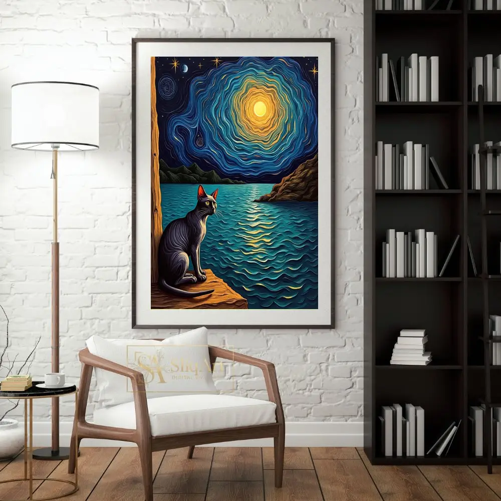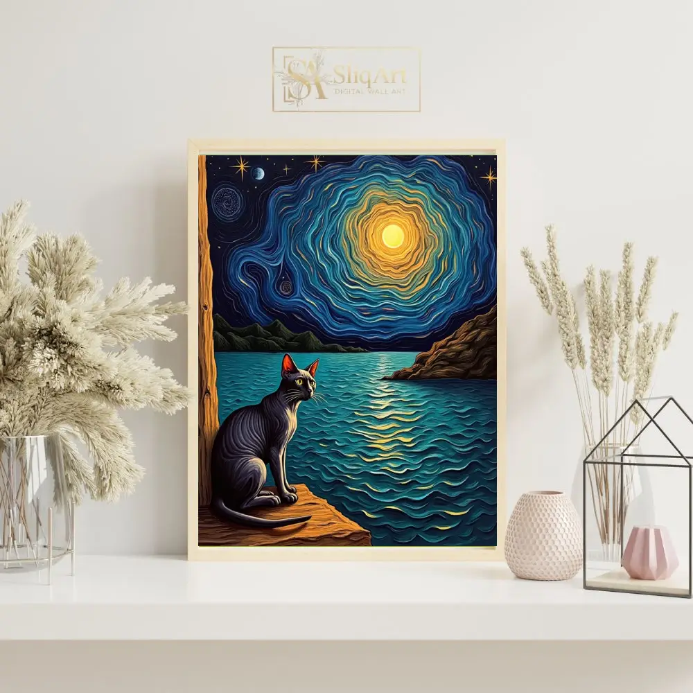 Featuring a sleek black cat gazing out over shimmering waters under a mesmerizing, swirling celestial sky, this piece blends the iconic post-impressionist style with a touch of whimsical mystery. The rich textures and vibrant play of deep indigo and golden light create a captivating focal point that sparks the imagination and brings a sense of wonder to any room.