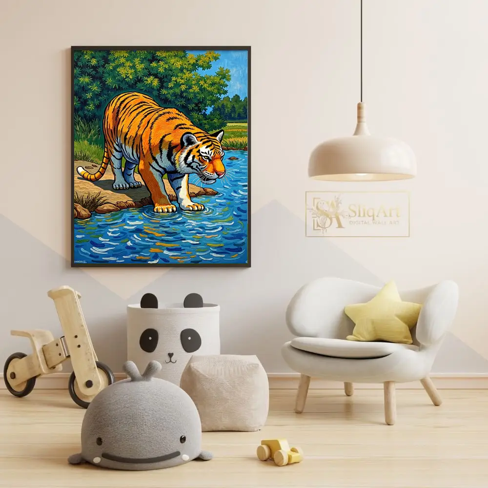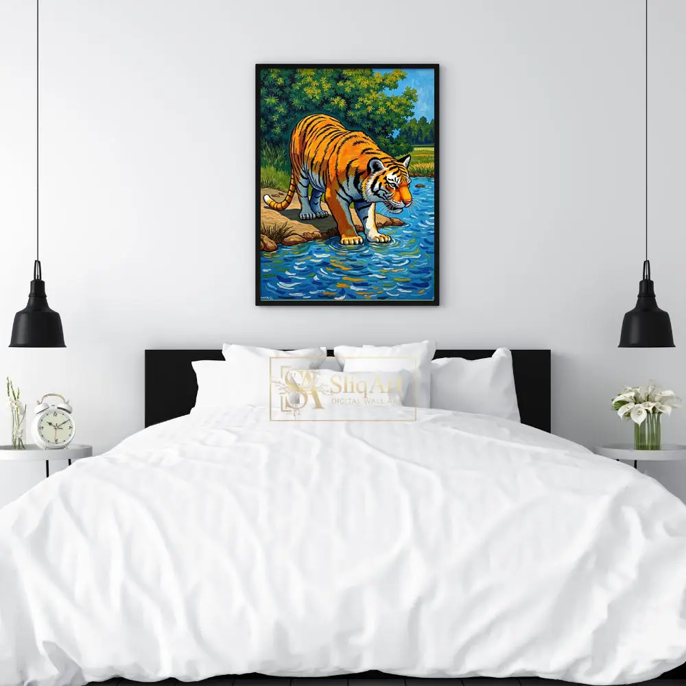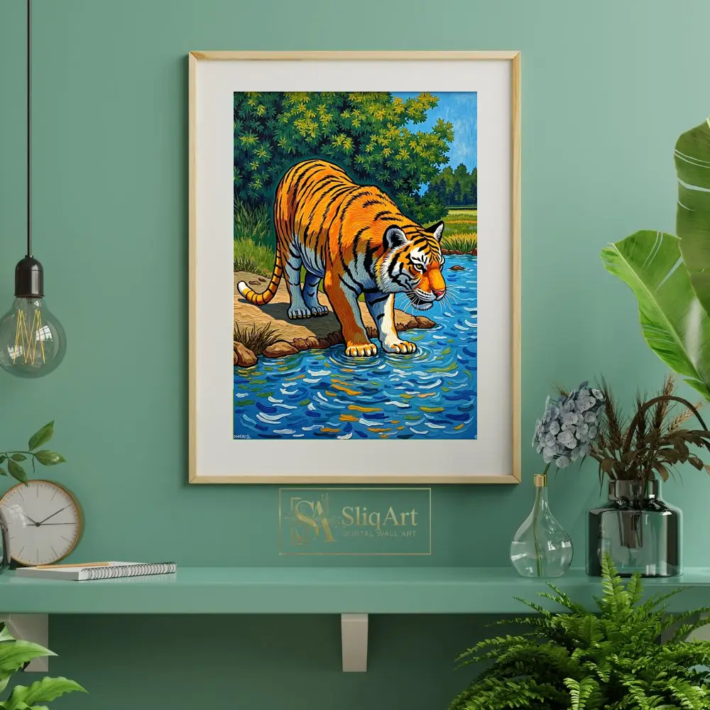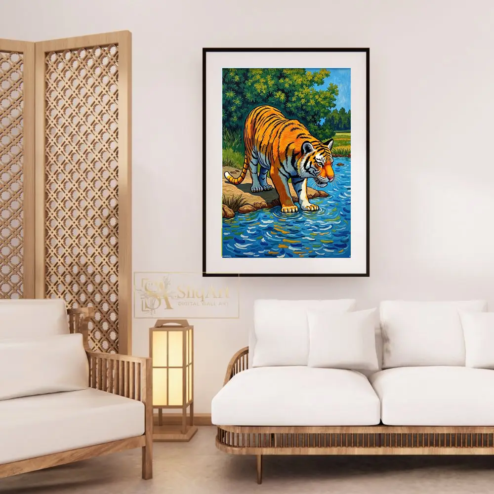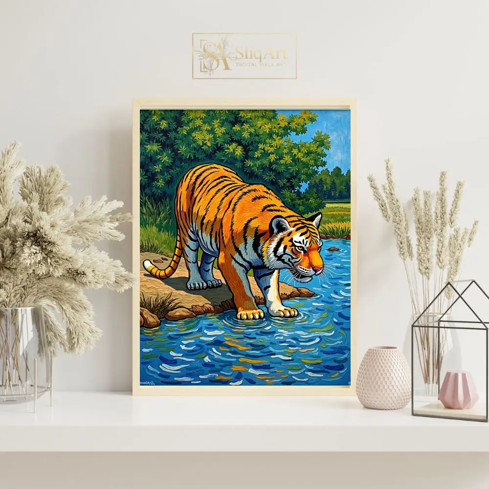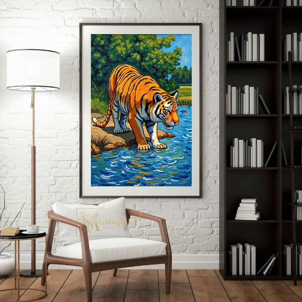 Add a touch of untamed elegance to your interior with this striking impressionistic painting of a majestic tiger. This piece captures the powerful predator in a moment of quiet intensity at the water’s edge.