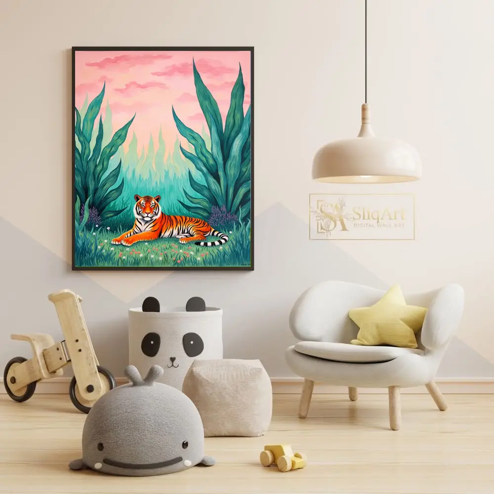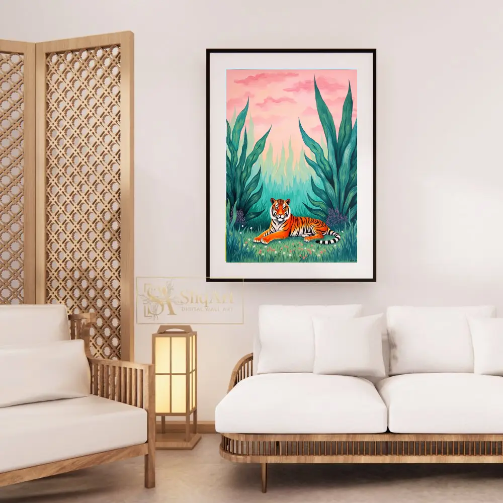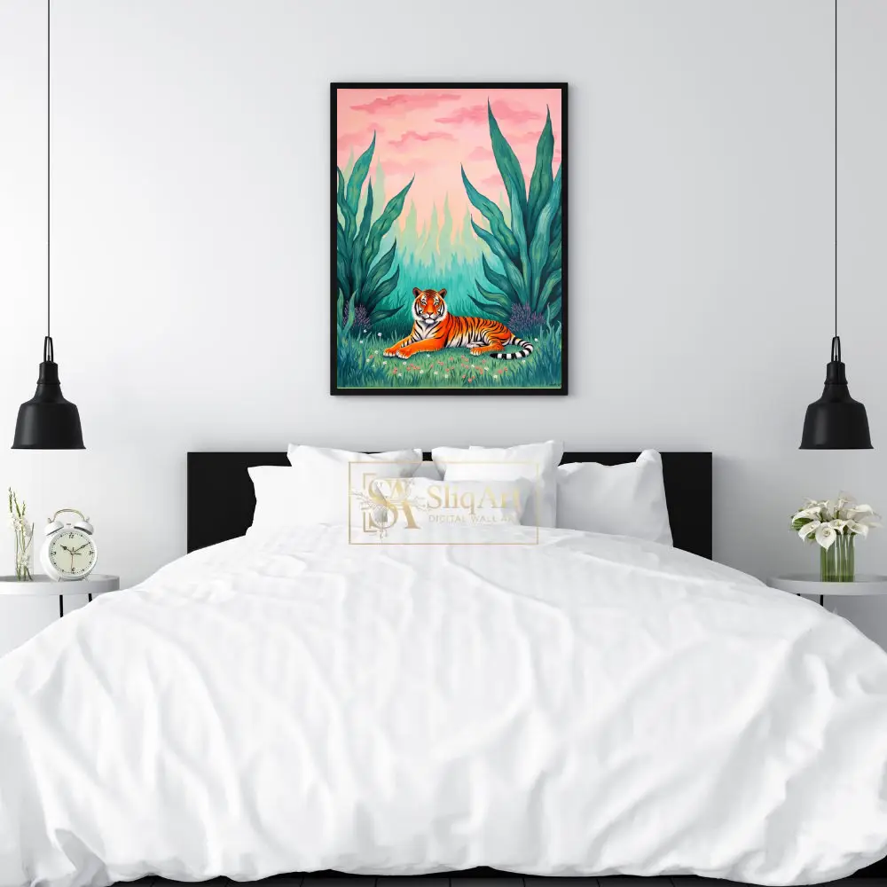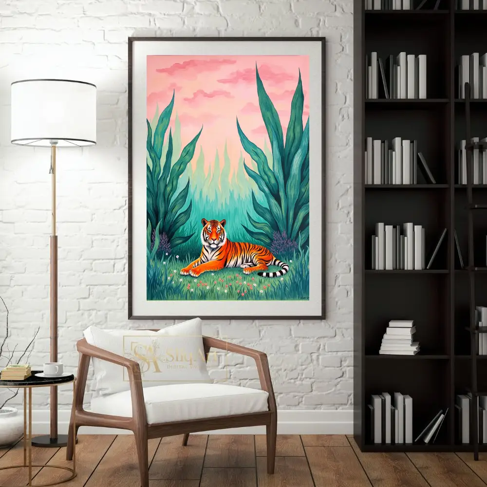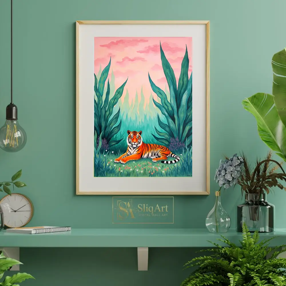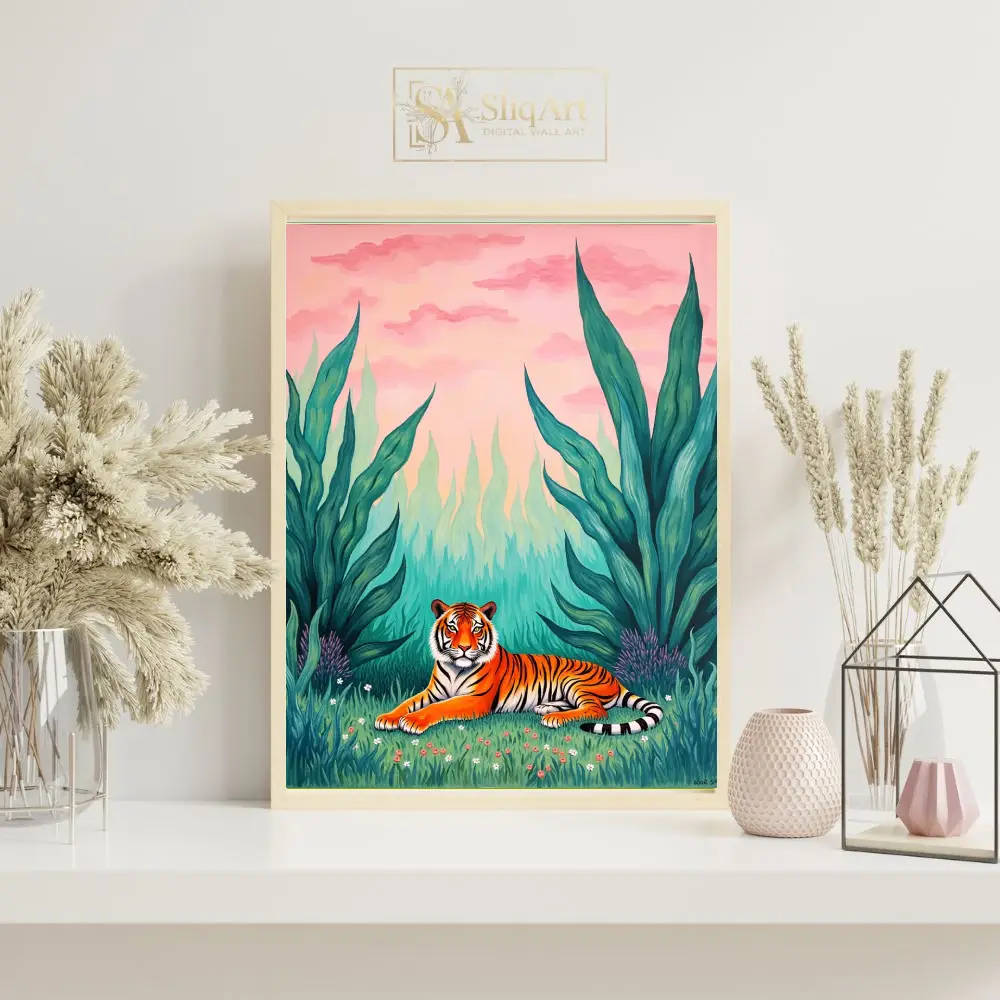 Bring the untamed beauty of the wild into your home with this stunning contemporary art piece featuring a majestic tiger. Nestled within a vibrant green thicket of oversized tropical leaves and delicate wildflowers, the tiger rests peacefully under a dreamlike pink and peach sunset sky.