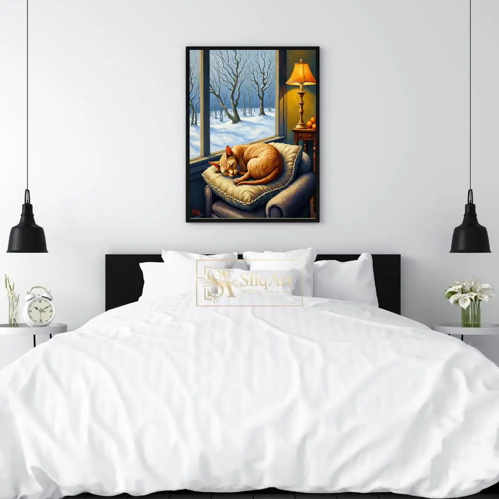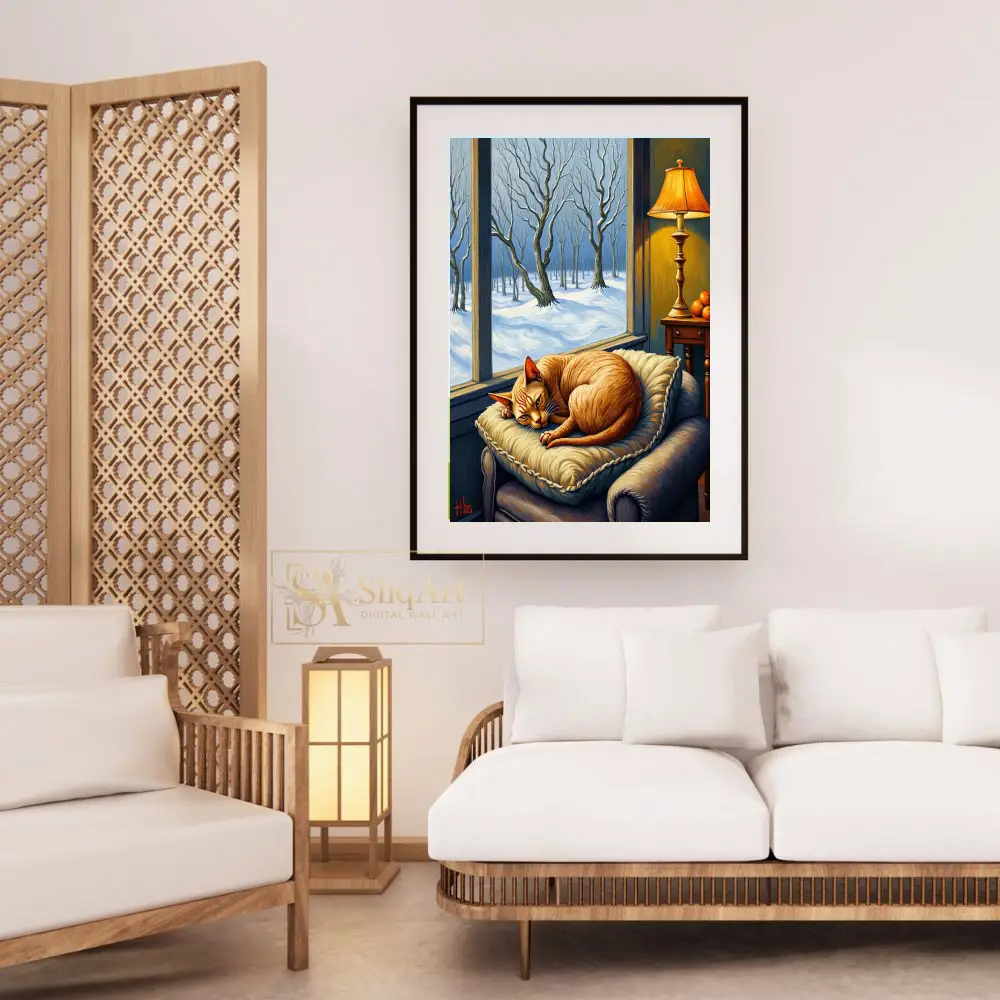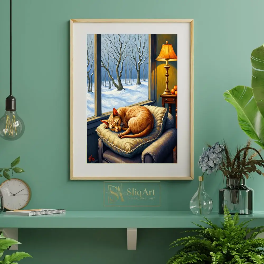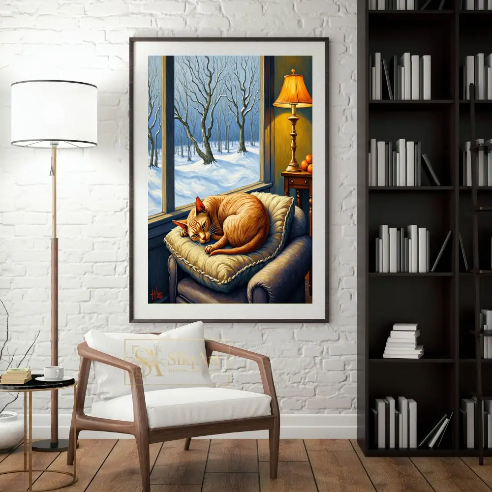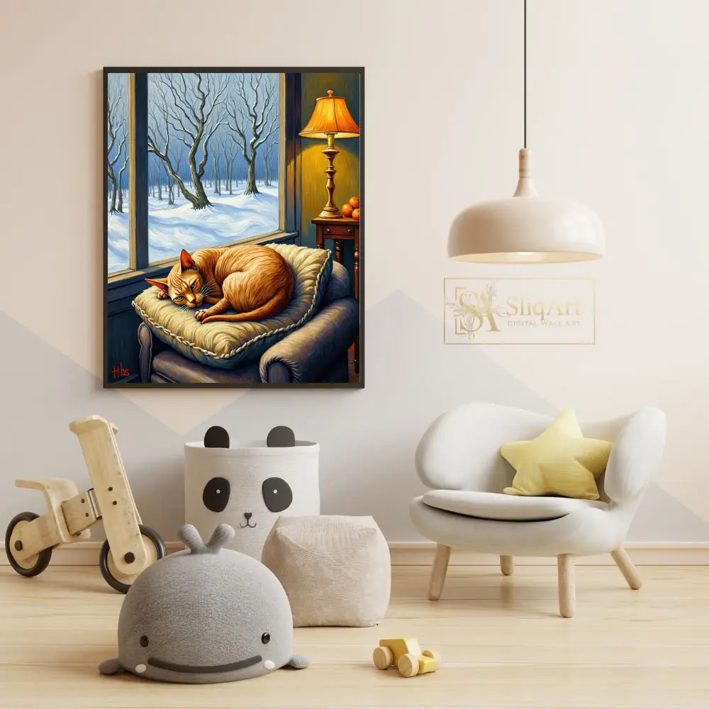 Experience the ultimate sense of winter hygge with this beautifully textured painting. A ginger cat is curled in a serene slumber upon a plush cushion, perfectly positioned by a window that reveals a stark, snowy forest.