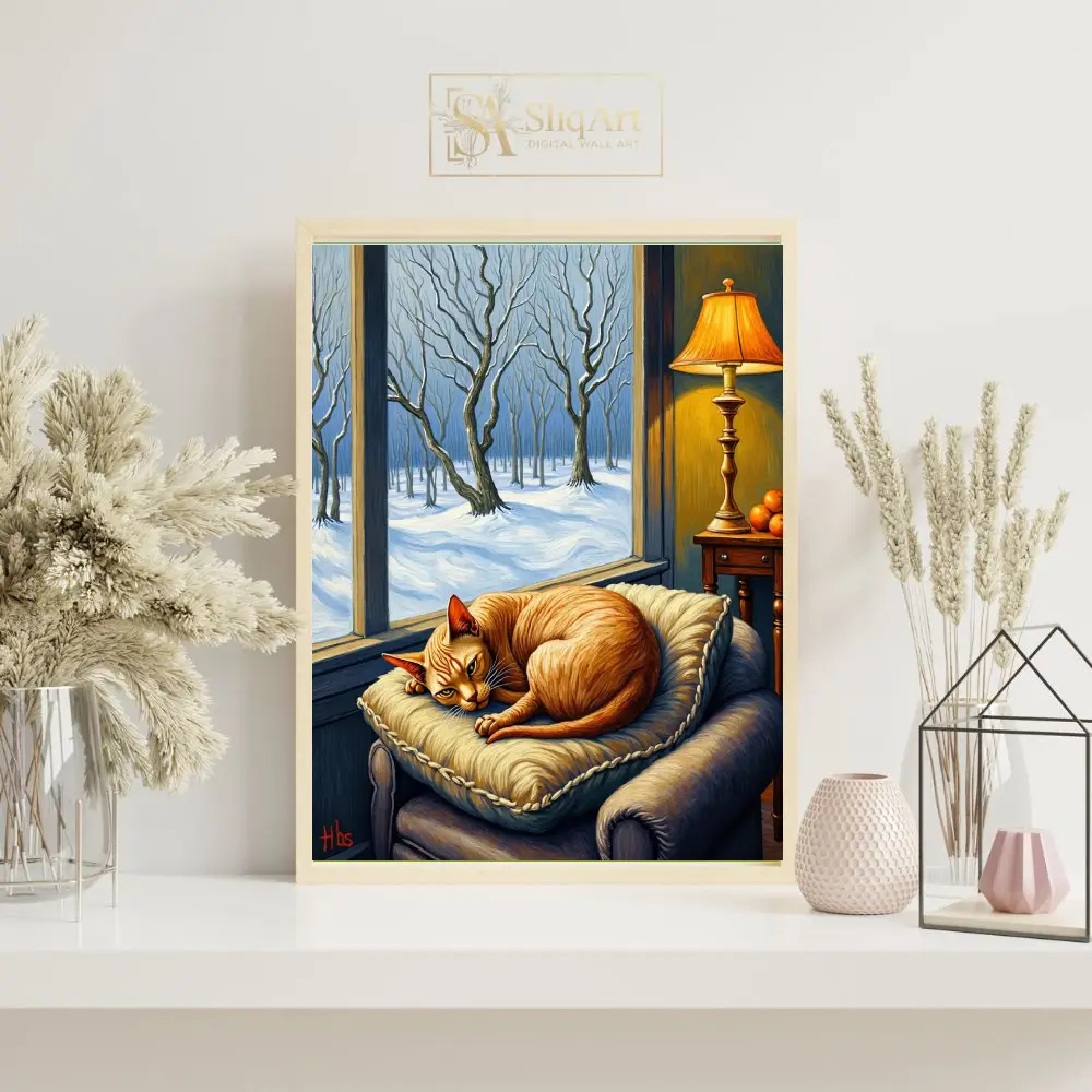 A charming painterly artwork featuring a ginger cat curled up by a window, contrasting a cold snowy forest with a warm, cozy interior glow.