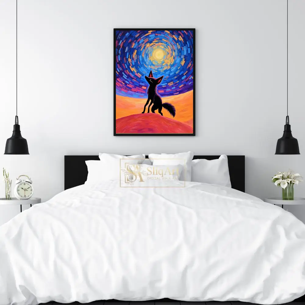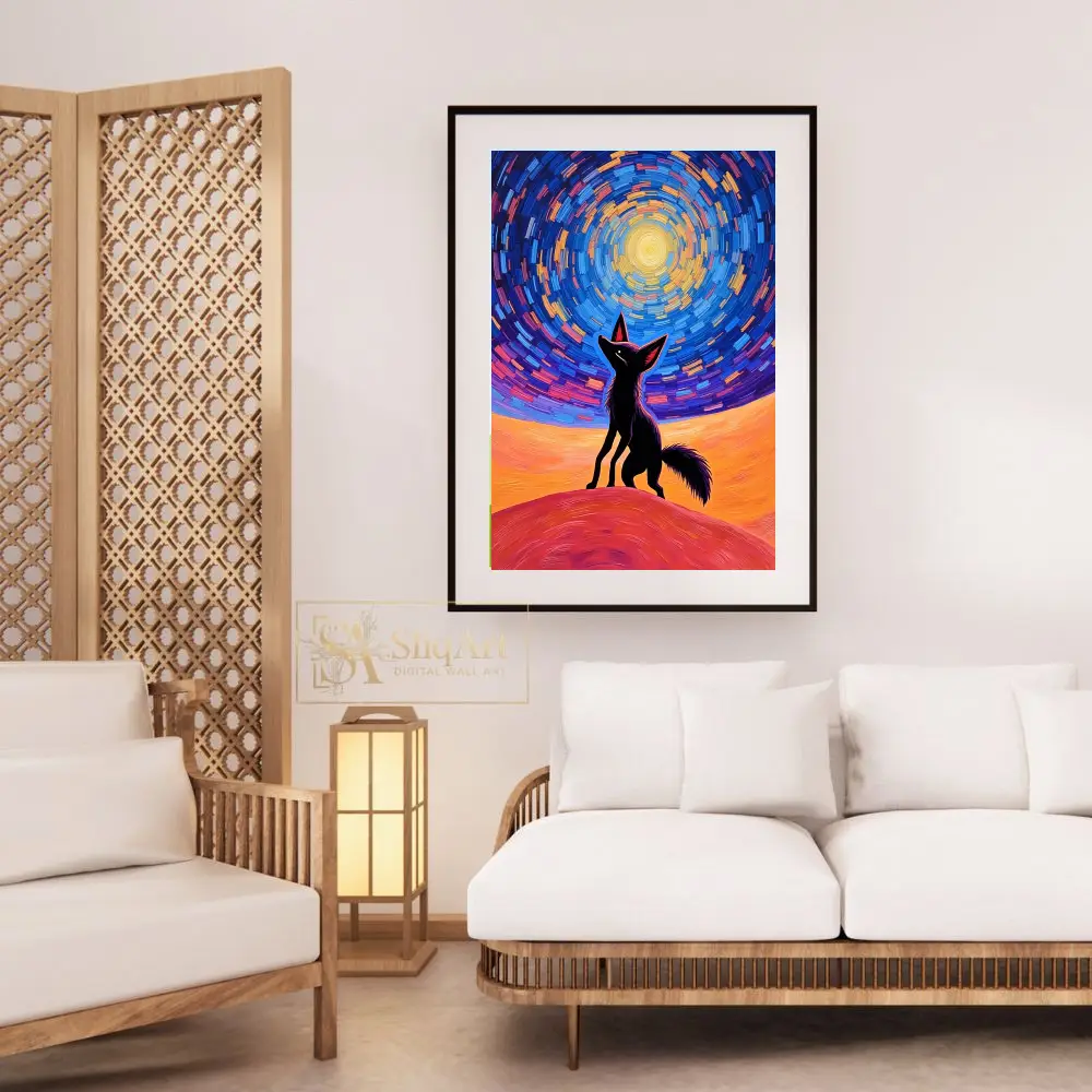 This captivating piece features a sleek silhouette of a fox gazing upward into a mesmerizing, swirling celestial sky. Inspired by the iconic Post-Impressionist style, the artwork utilizes bold, textured brushstrokes to create a sense of cosmic movement and energy.