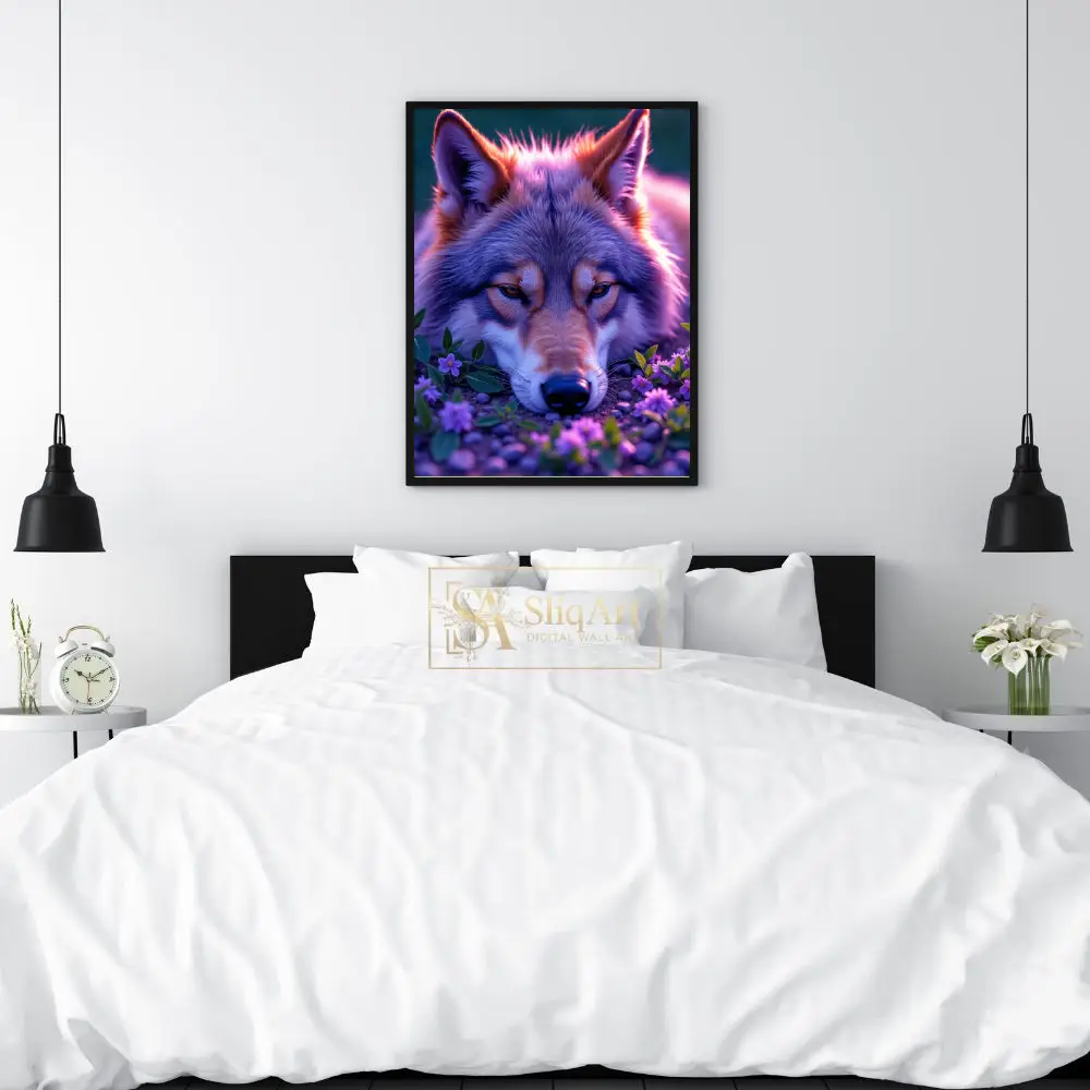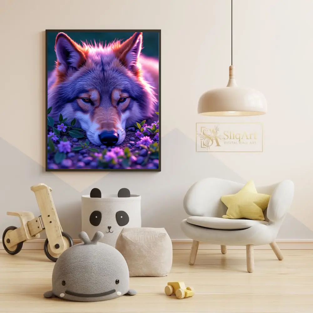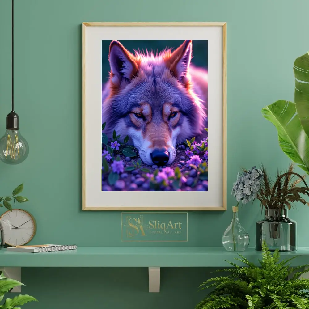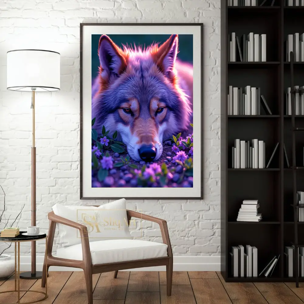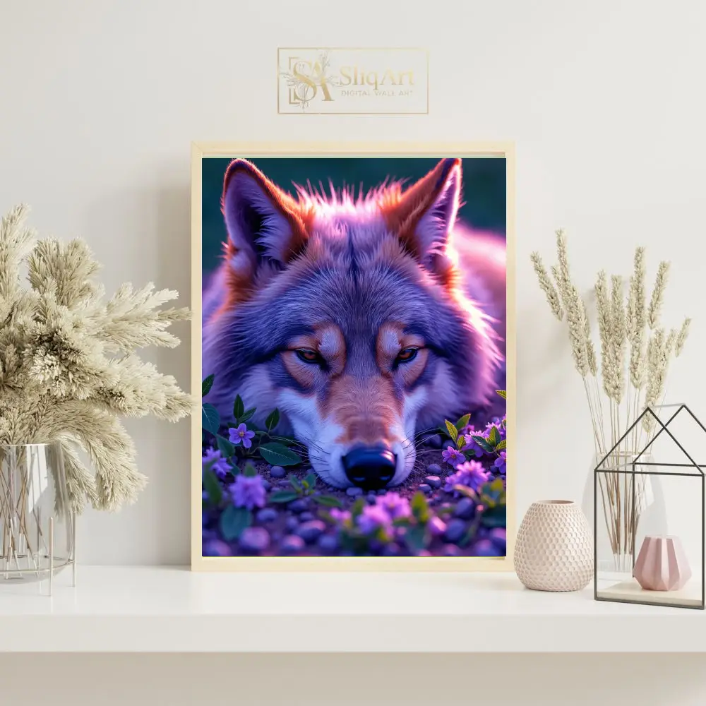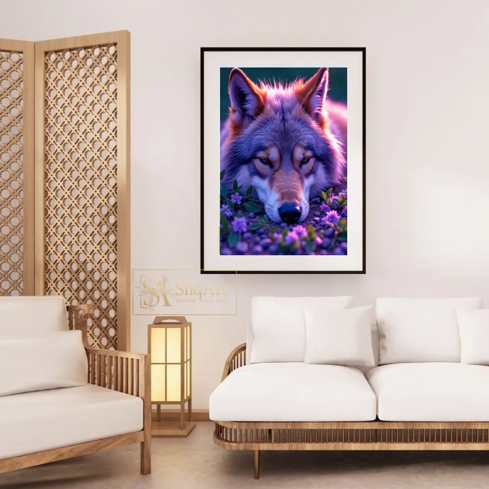 Immerse yourself in the serene beauty of the wild with this captivating digital art piece featuring a majestic wolf resting amidst a bed of vibrant purple wildflowers. This close-up composition highlights the soulful gaze and intricate textures of the wolf’s fur, illuminated by a soft, cinematic glow of pink and violet hues.