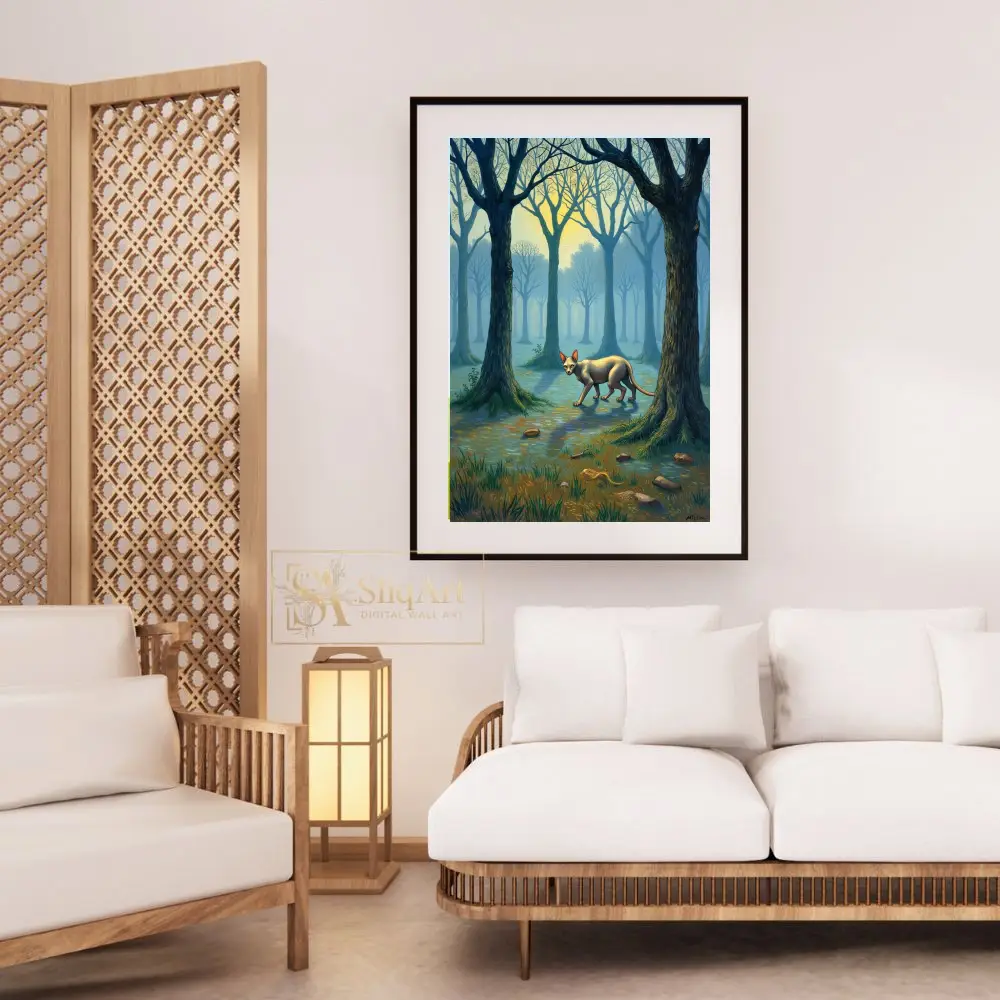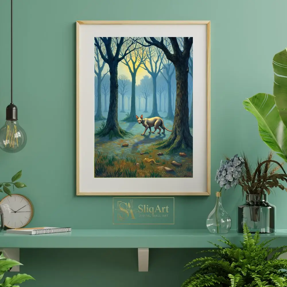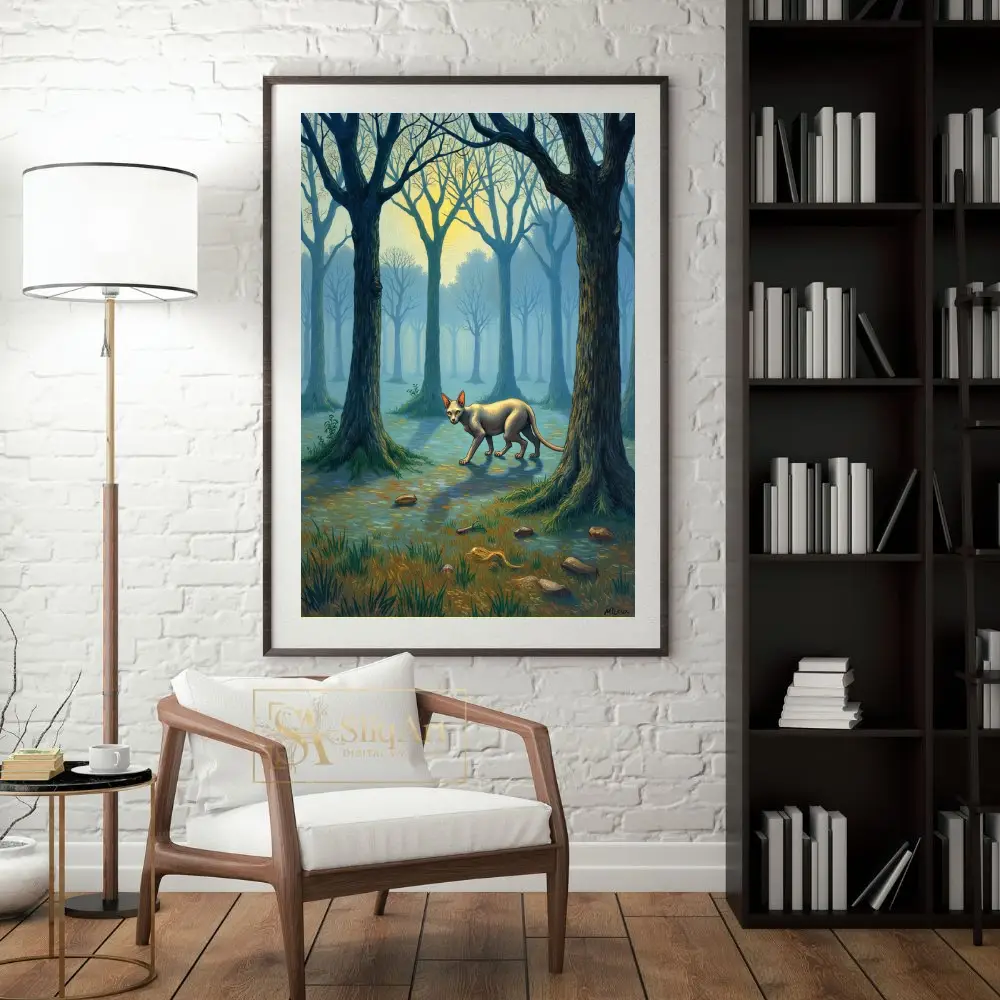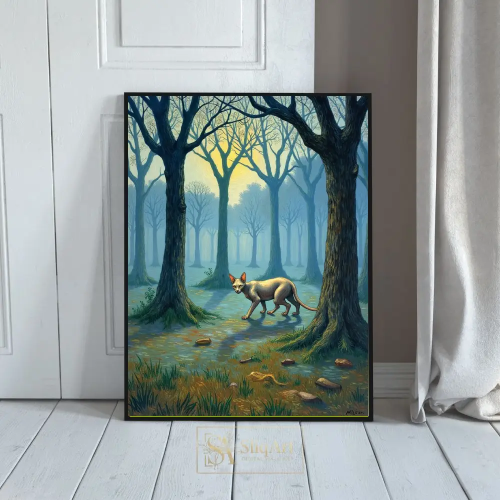 A hauntingly beautiful surrealist print of a Sphynx cat wandering through a glowing, misty woodland.