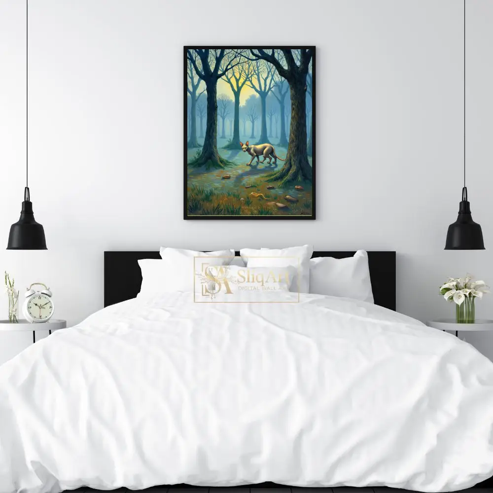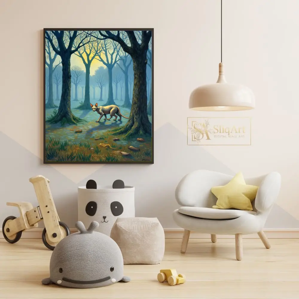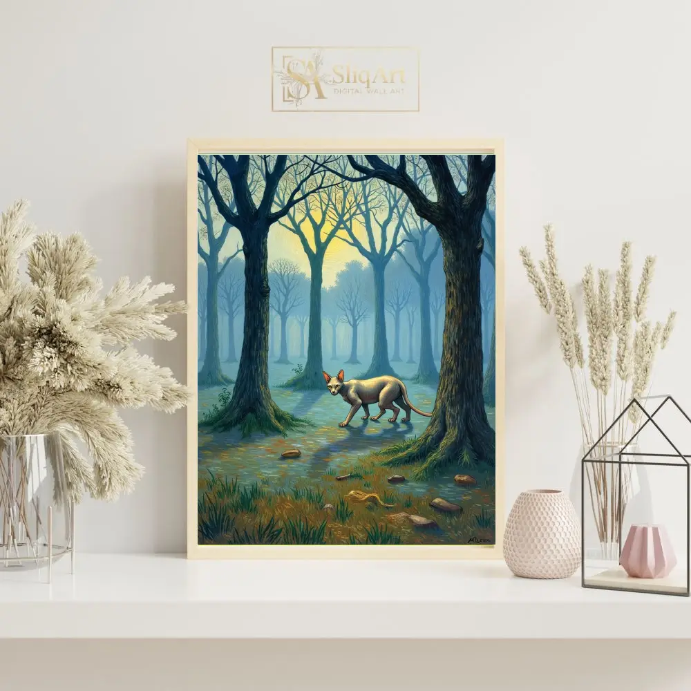The soft glow of light filtering through the branches creates a serene yet mysterious atmosphere, making it a perfect conversation piece for any modern home. Every detail, from the cat’s alert expression to the atmospheric depth of the misty background, is rendered with painterly precision to create a sense of quiet wonder.