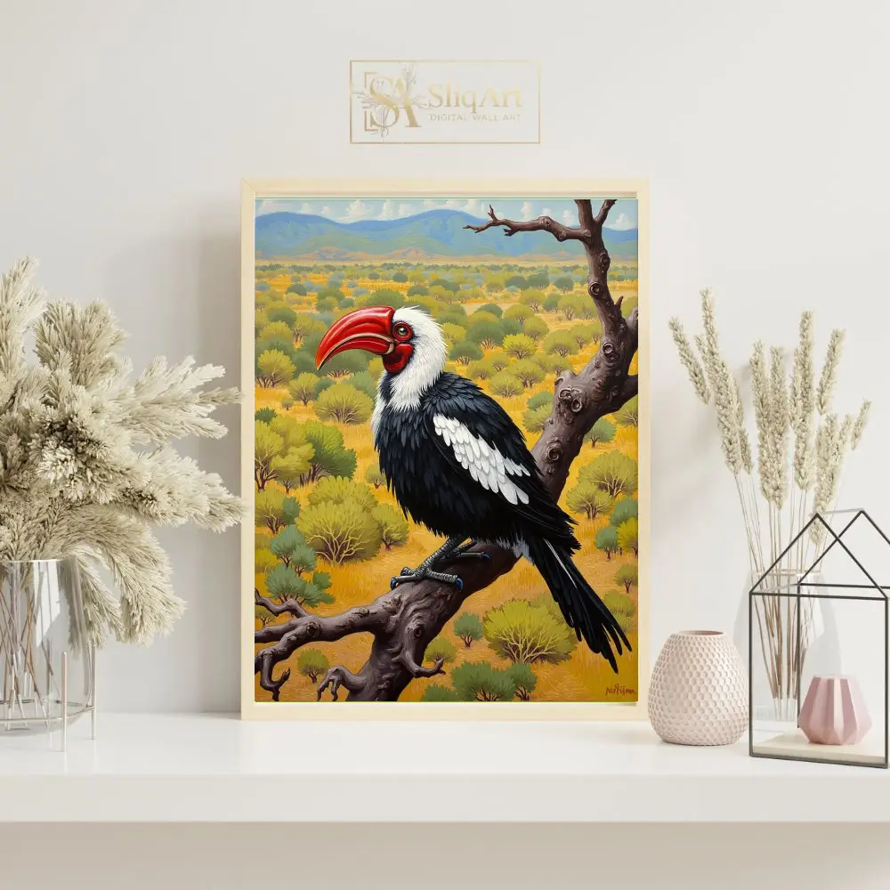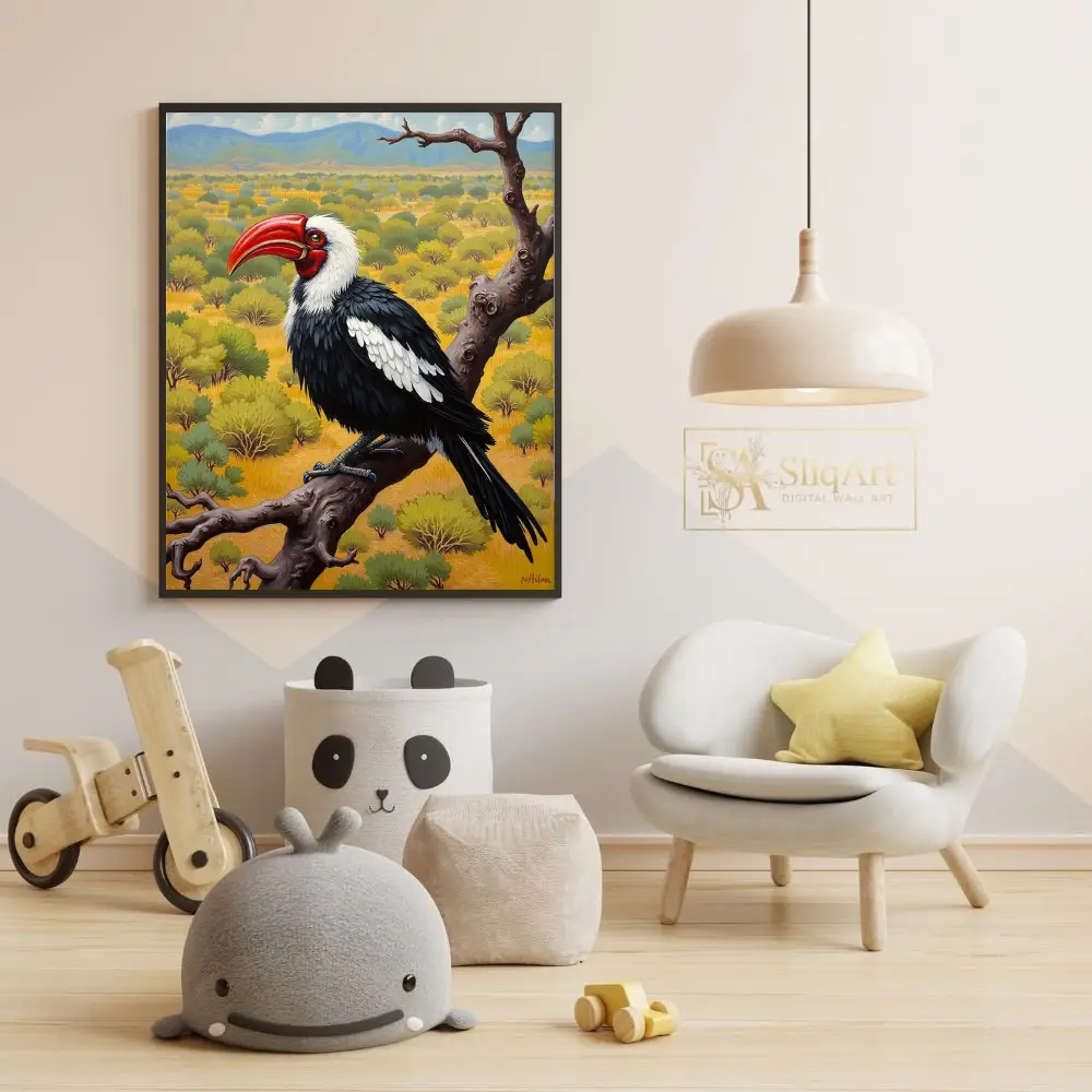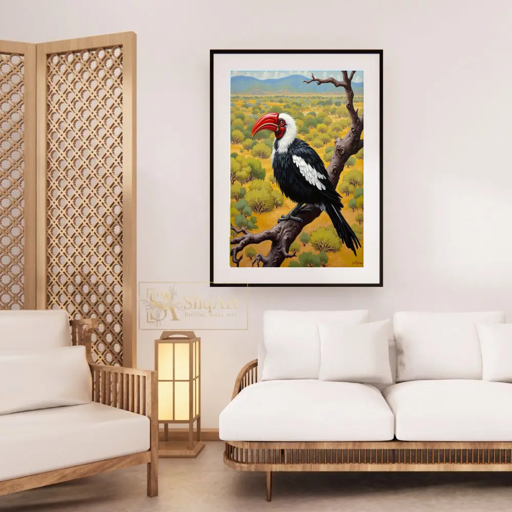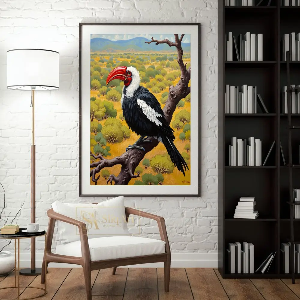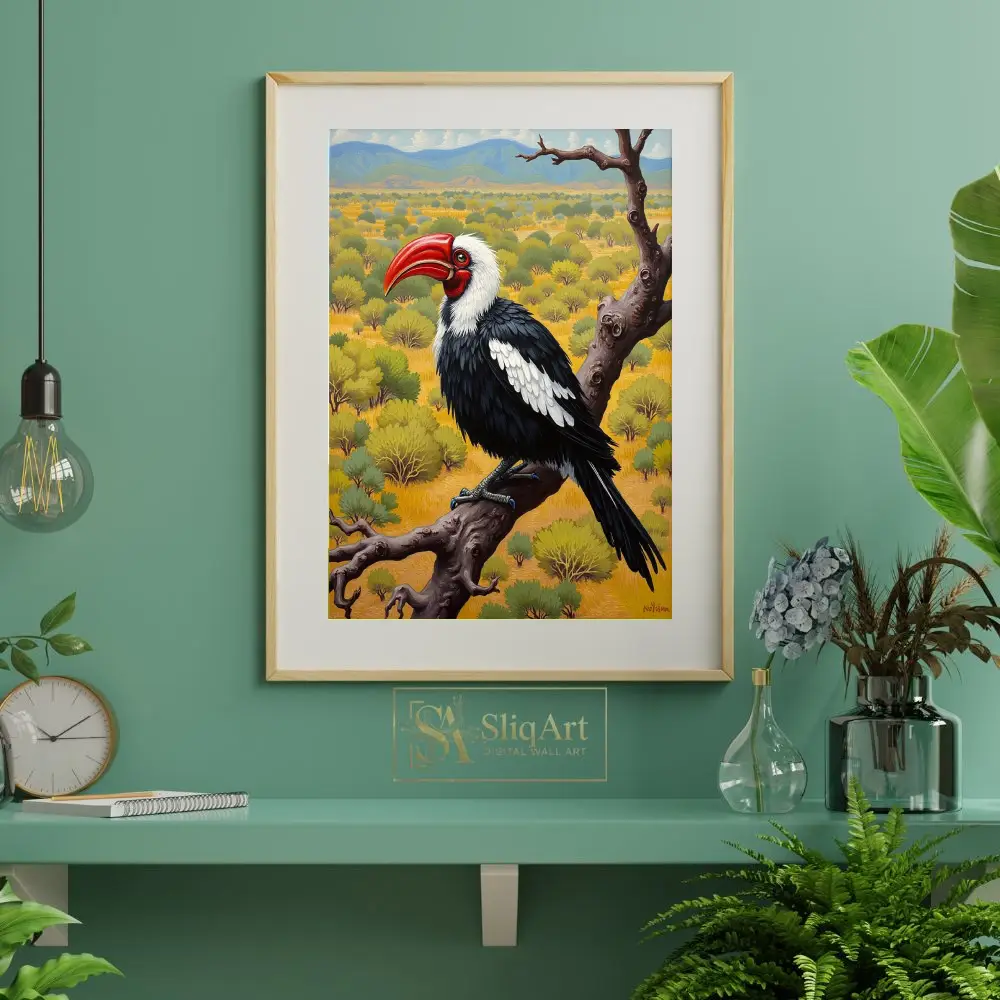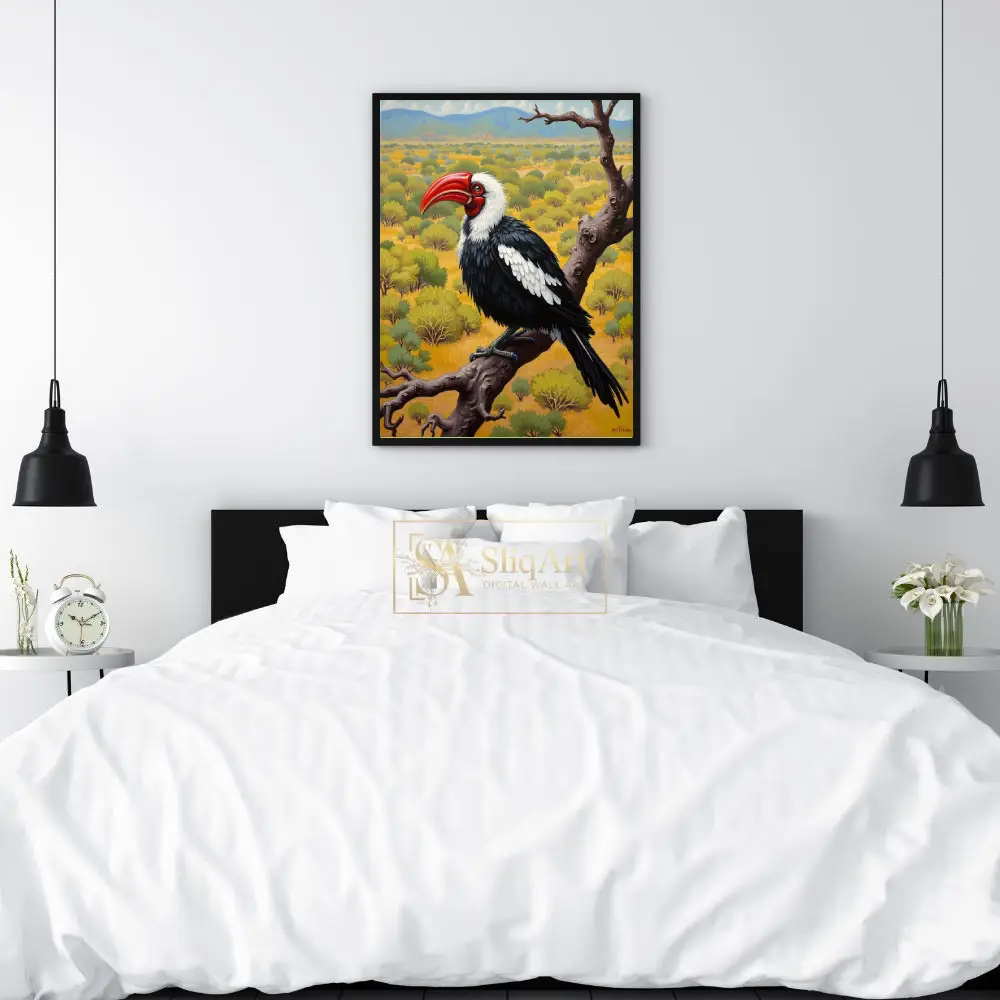 This stunning wildlife painting captures the striking profile of a hornbill perched majestically upon a gnarled, weathered branch. The bird features a vibrant crimson beak that serves as a brilliant focal point against its sleek black and white plumage.