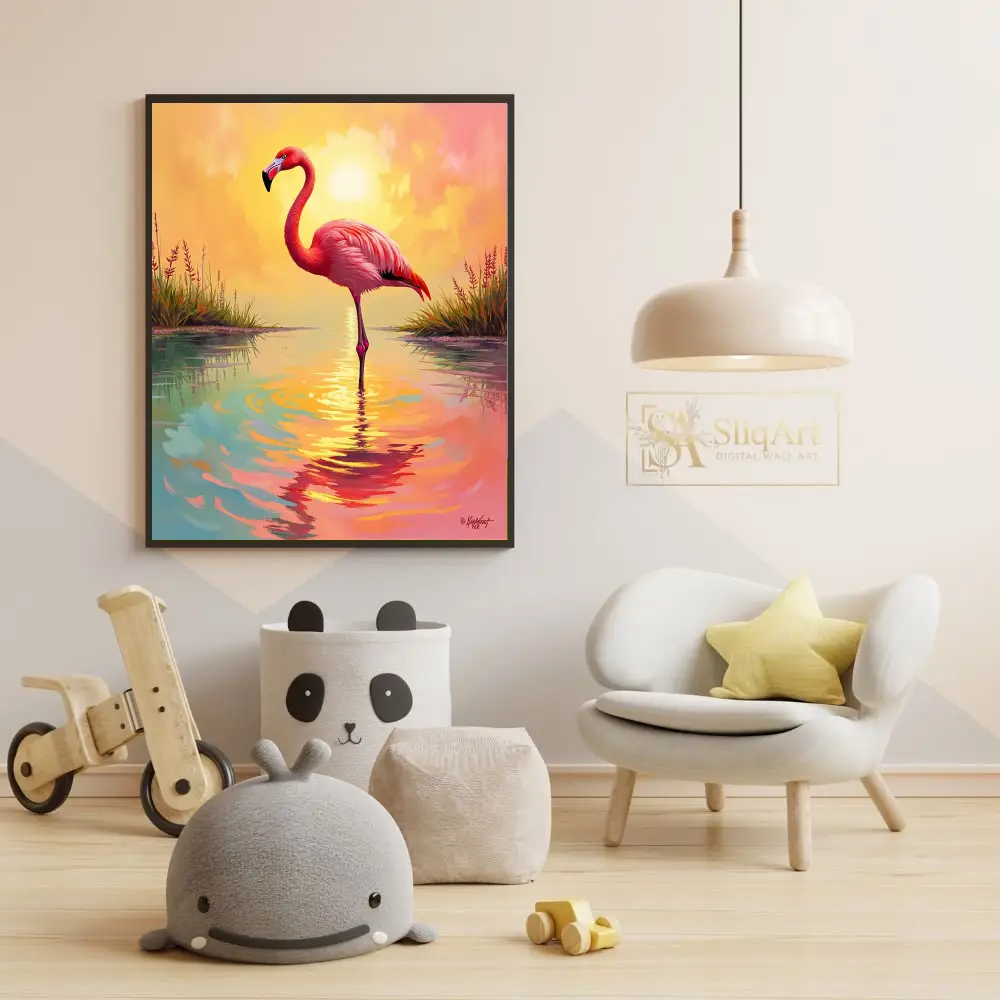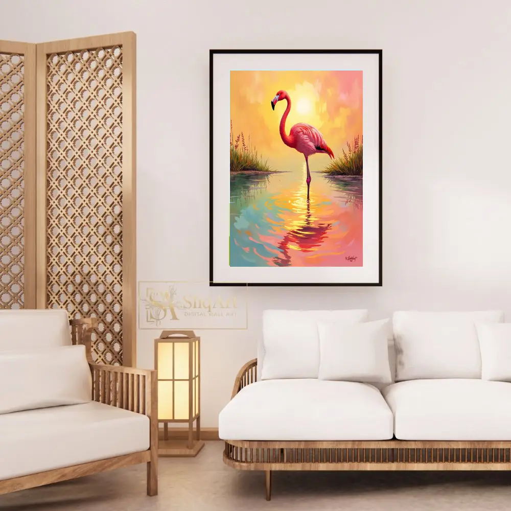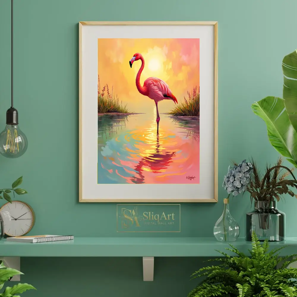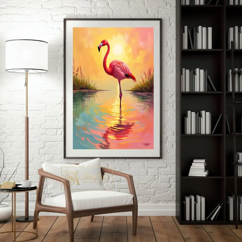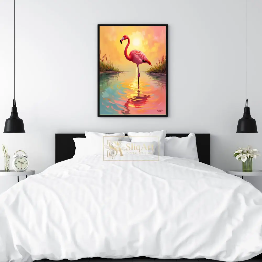 A vibrant, painterly canvas art featuring a pink flamingo standing in water during a golden sunset.