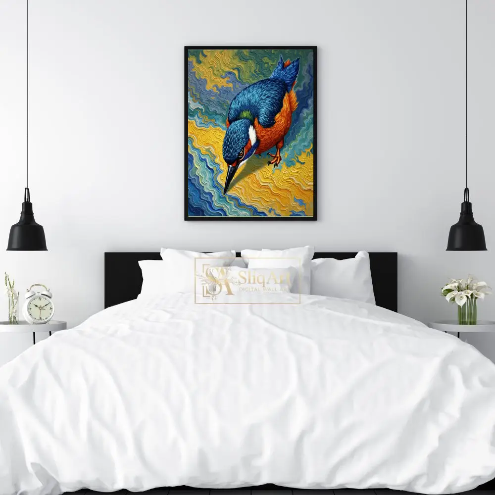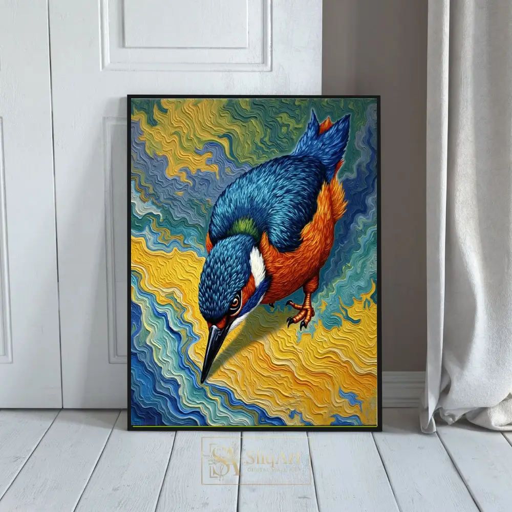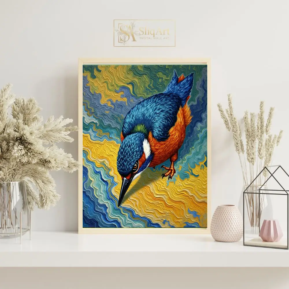Capture the electric energy of nature with this stunning Kingfisher canvas art. Featuring a unique downward perspective, this piece showcases a vibrant blue and orange kingfisher amidst a swirling, psychedelic background of rhythmic waves.