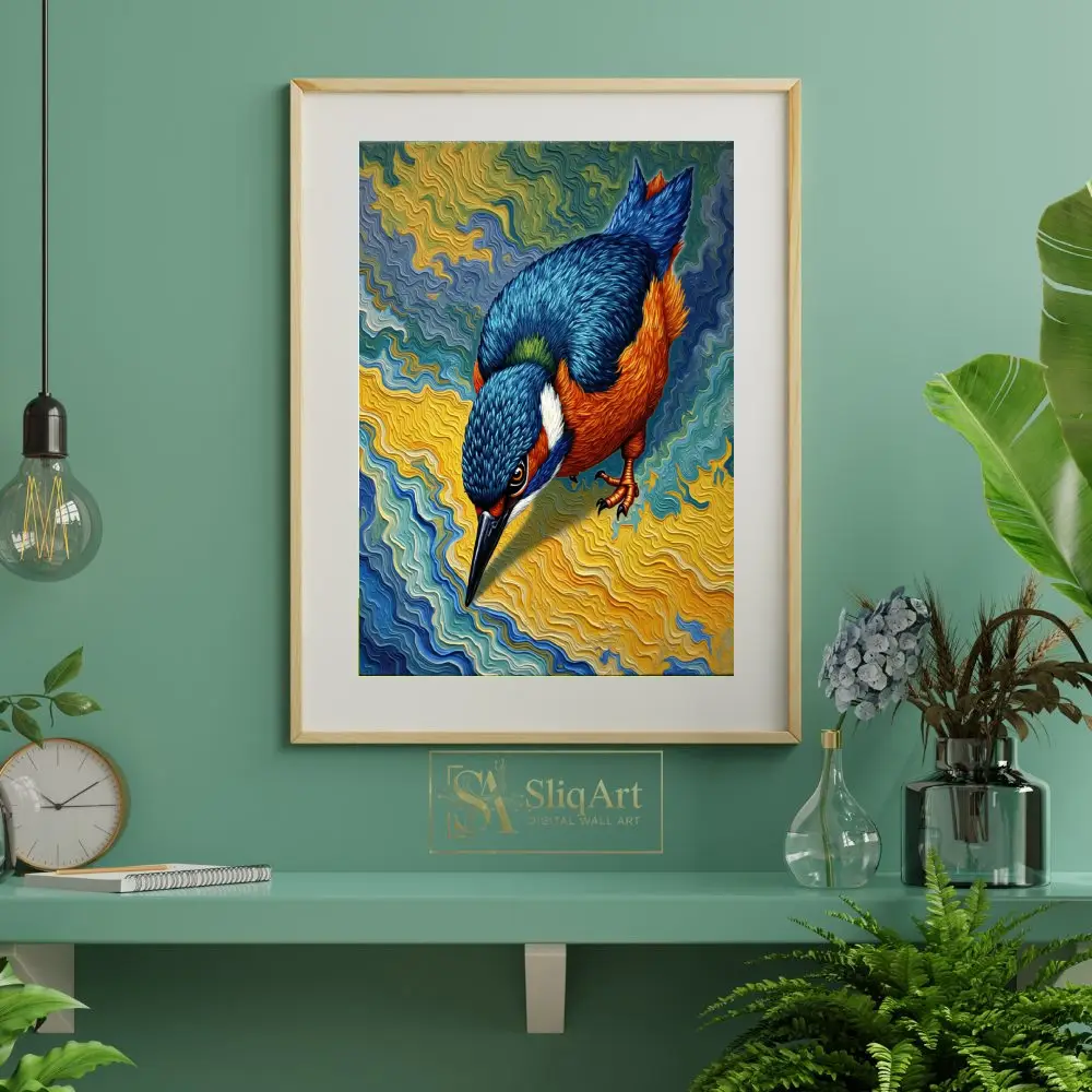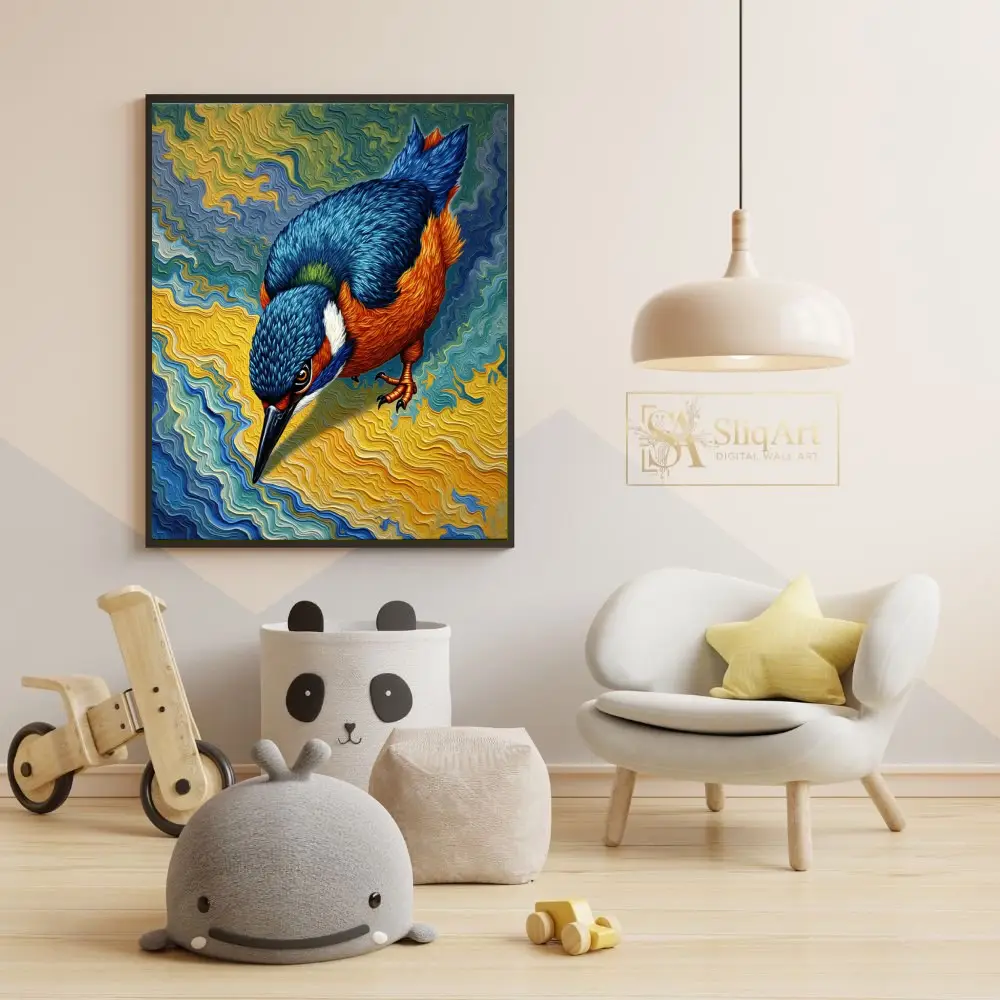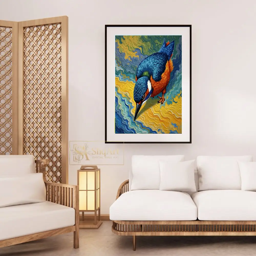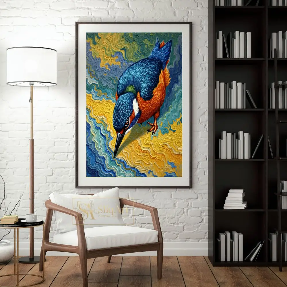 Capture the electric energy of nature with this stunning Kingfisher canvas art. Featuring a unique downward perspective, this piece showcases a vibrant blue and orange kingfisher amidst a swirling, psychedelic background of rhythmic waves.