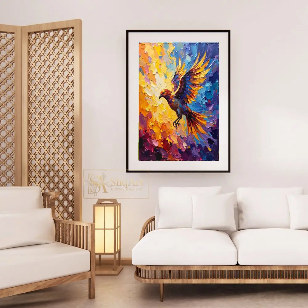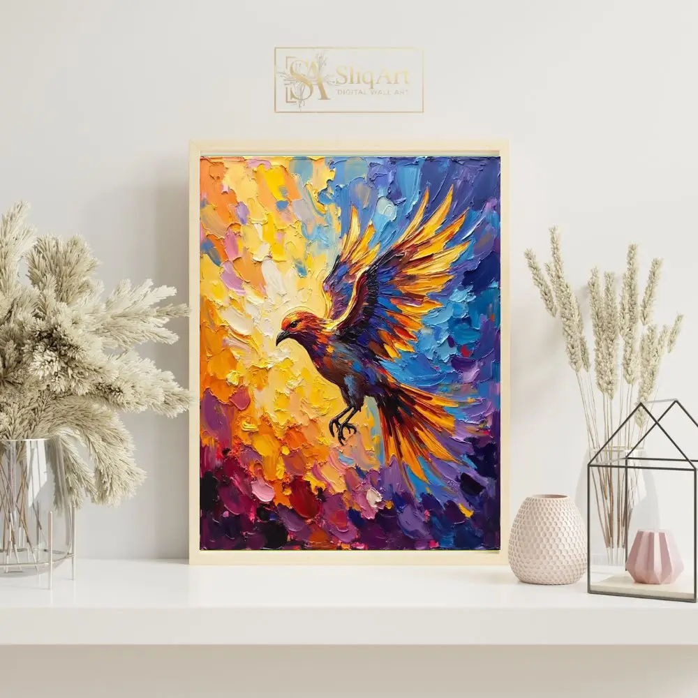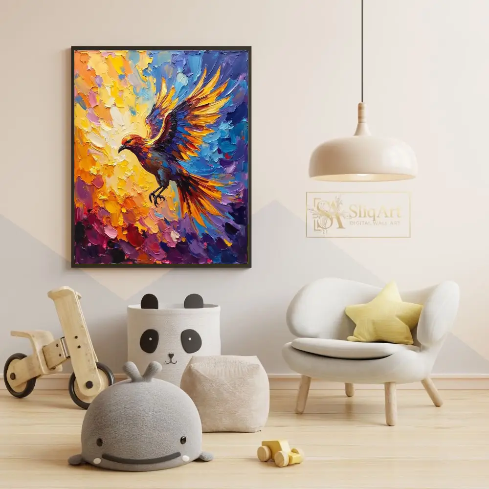 A kaleidoscopic explosion of sun-drenched yellows, fiery oranges, and deep indigo blues brings the subject to life, offering a tactile depth that transforms any wall into a gallery-worthy display. This piece serves as a powerful symbol of aspiration and the beauty of nature’s unbridled spirit.
