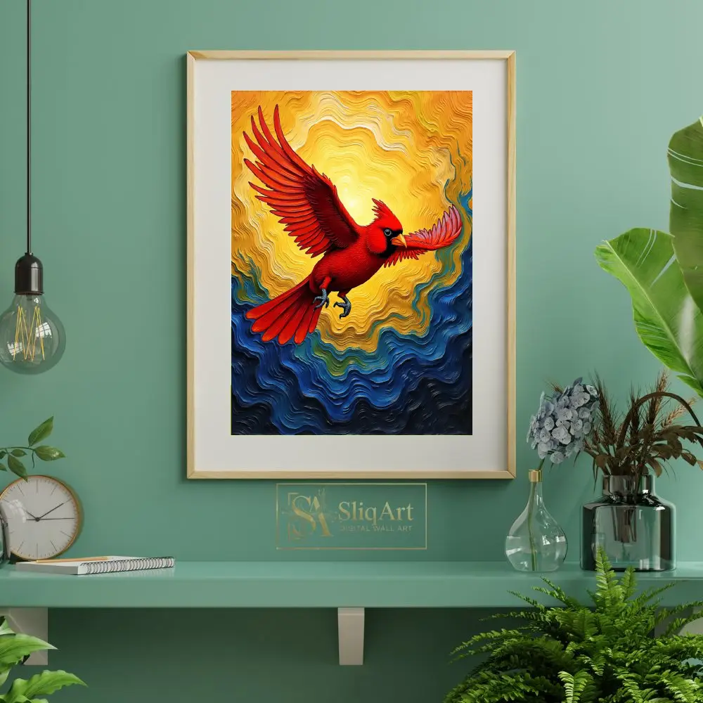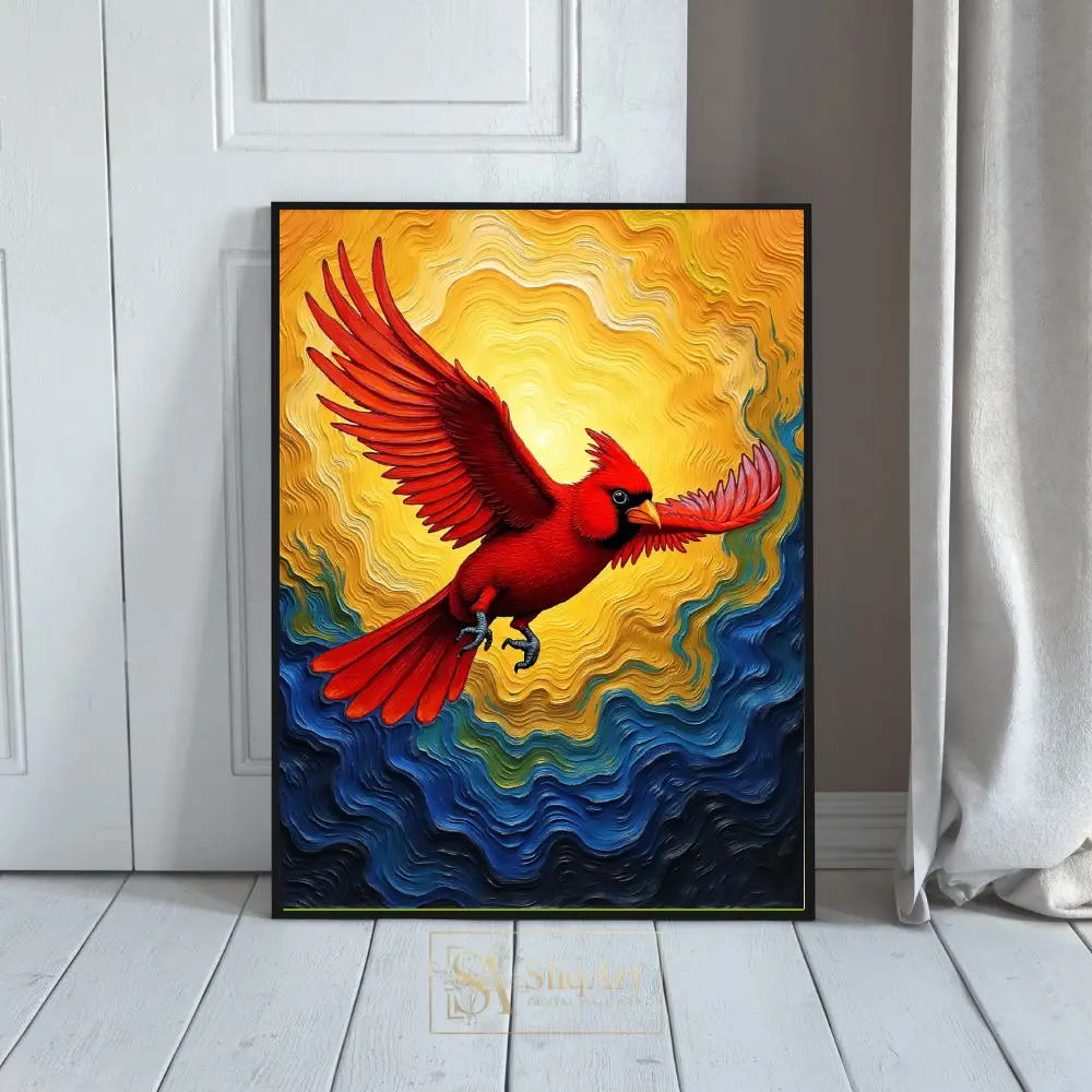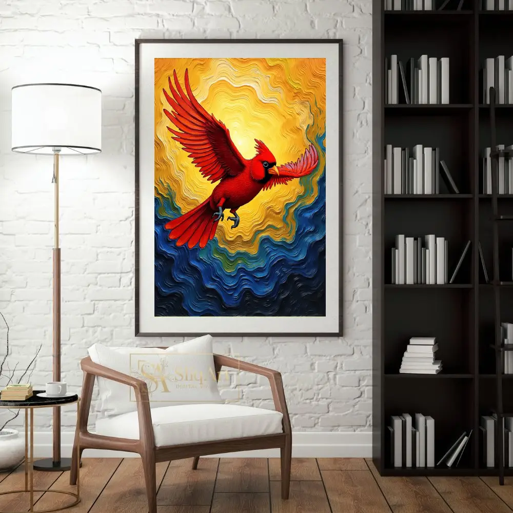 This piece captures a sense of freedom and spiritual hope, with the bird’s outstretched wings and determined gaze serving as a powerful focal point. The swirling patterns in the background mimic the movement of wind and waves, adding a layer of abstract expressionism to the detailed avian subject. Ideal for adding a pop of color and a sense of movement to any contemporary interior, this cardinal artwork is both a visual feast and a symbol of resilience.
