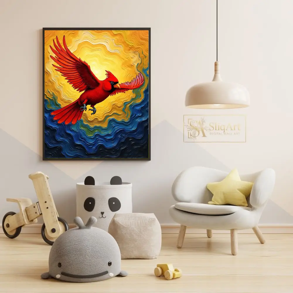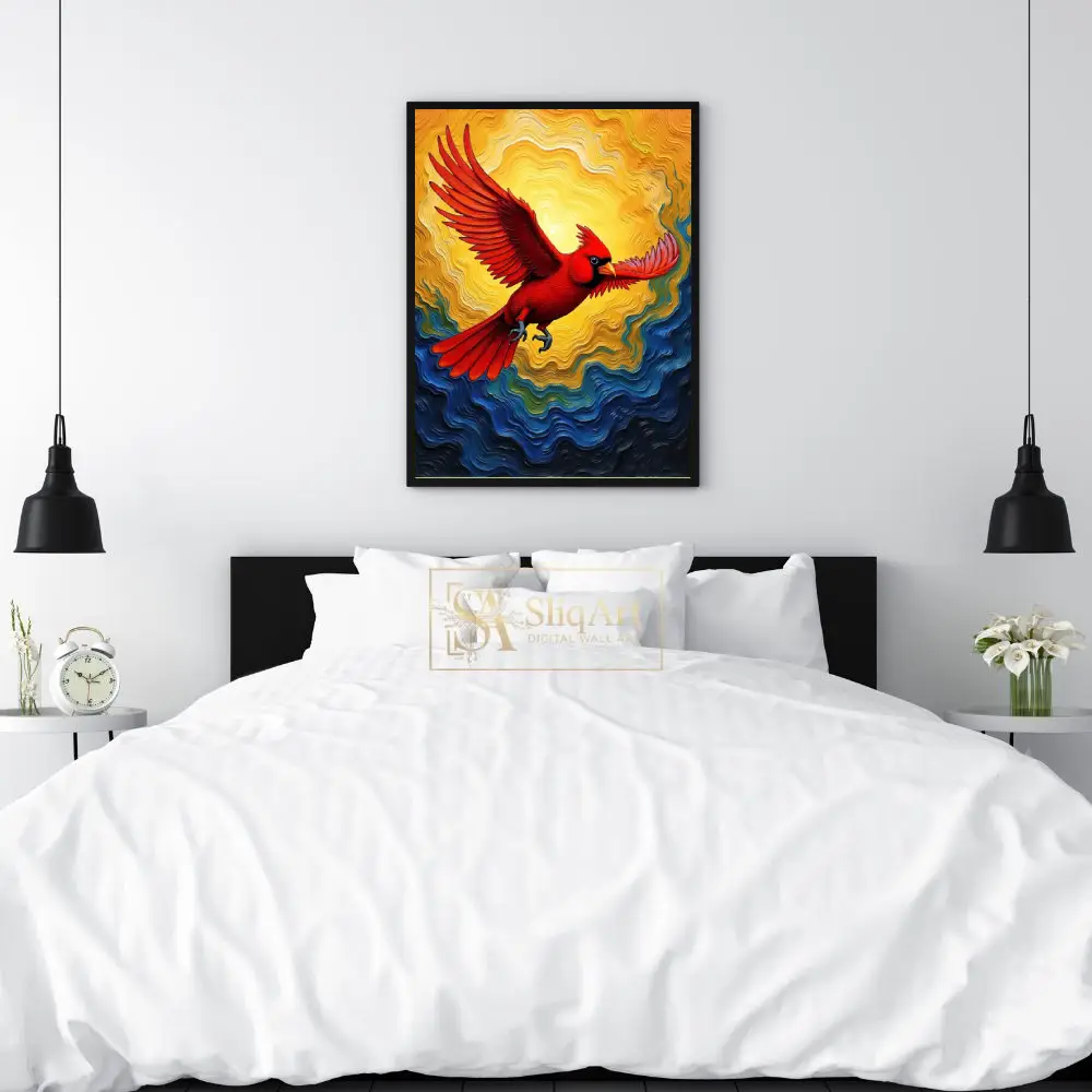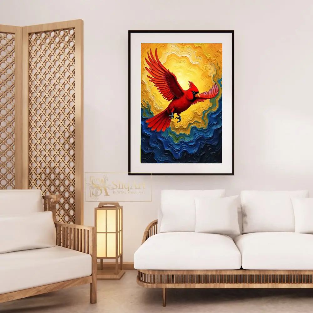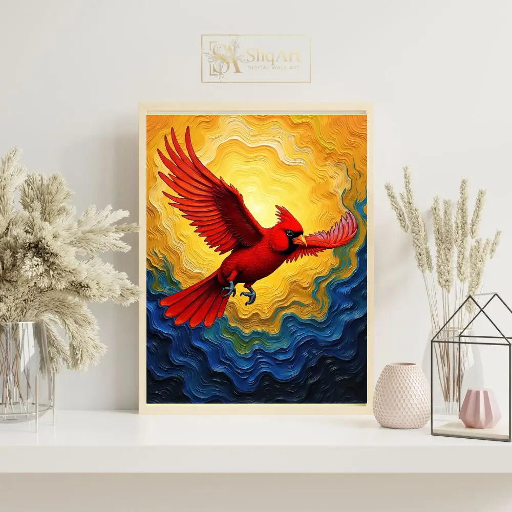 This piece captures a sense of freedom and spiritual hope, with the bird’s outstretched wings and determined gaze serving as a powerful focal point. The swirling patterns in the background mimic the movement of wind and waves, adding a layer of abstract expressionism to the detailed avian subject. Ideal for adding a pop of color and a sense of movement to any contemporary interior, this cardinal artwork is both a visual feast and a symbol of resilience.