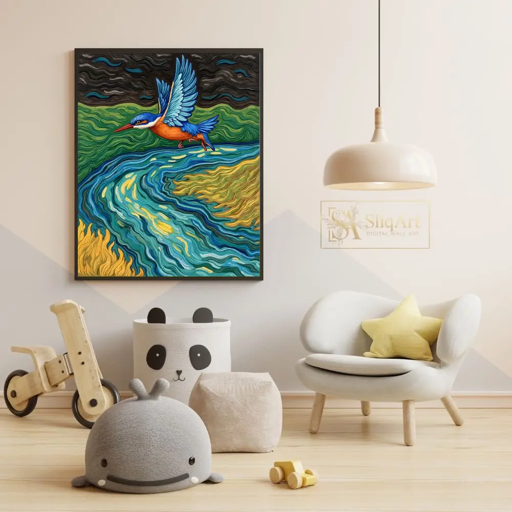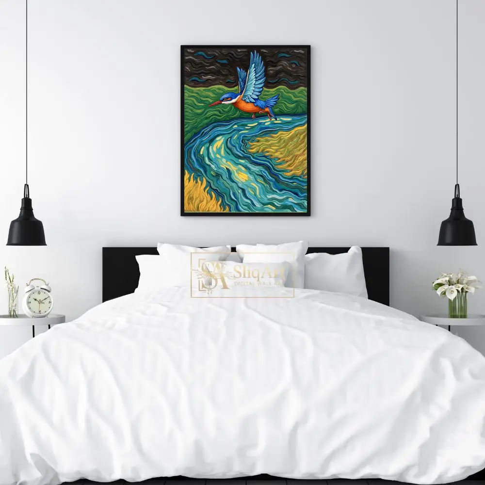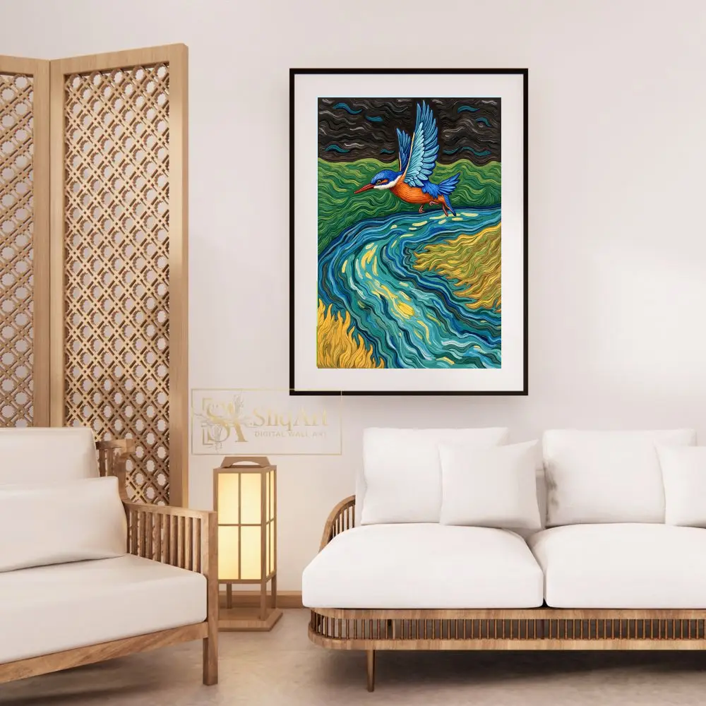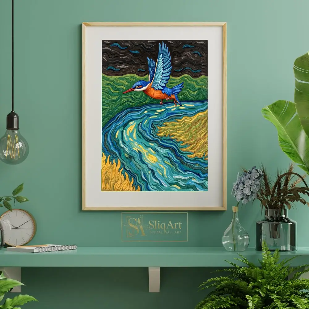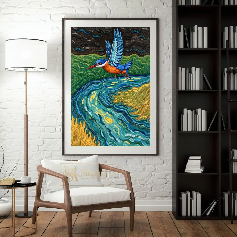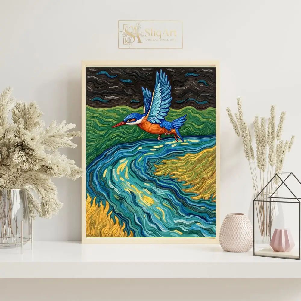 Capture the dynamic energy of nature with this stunning kingfisher canvas art. Inspired by the expressive, rhythmic brushwork of post-impressionism, this piece features a brilliant blue and orange kingfisher gliding over a swirling river of teal, gold, and emerald.