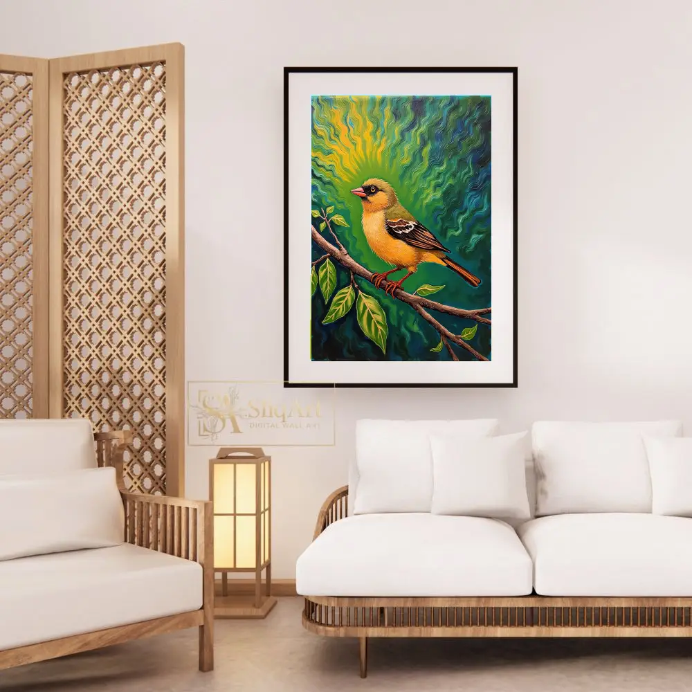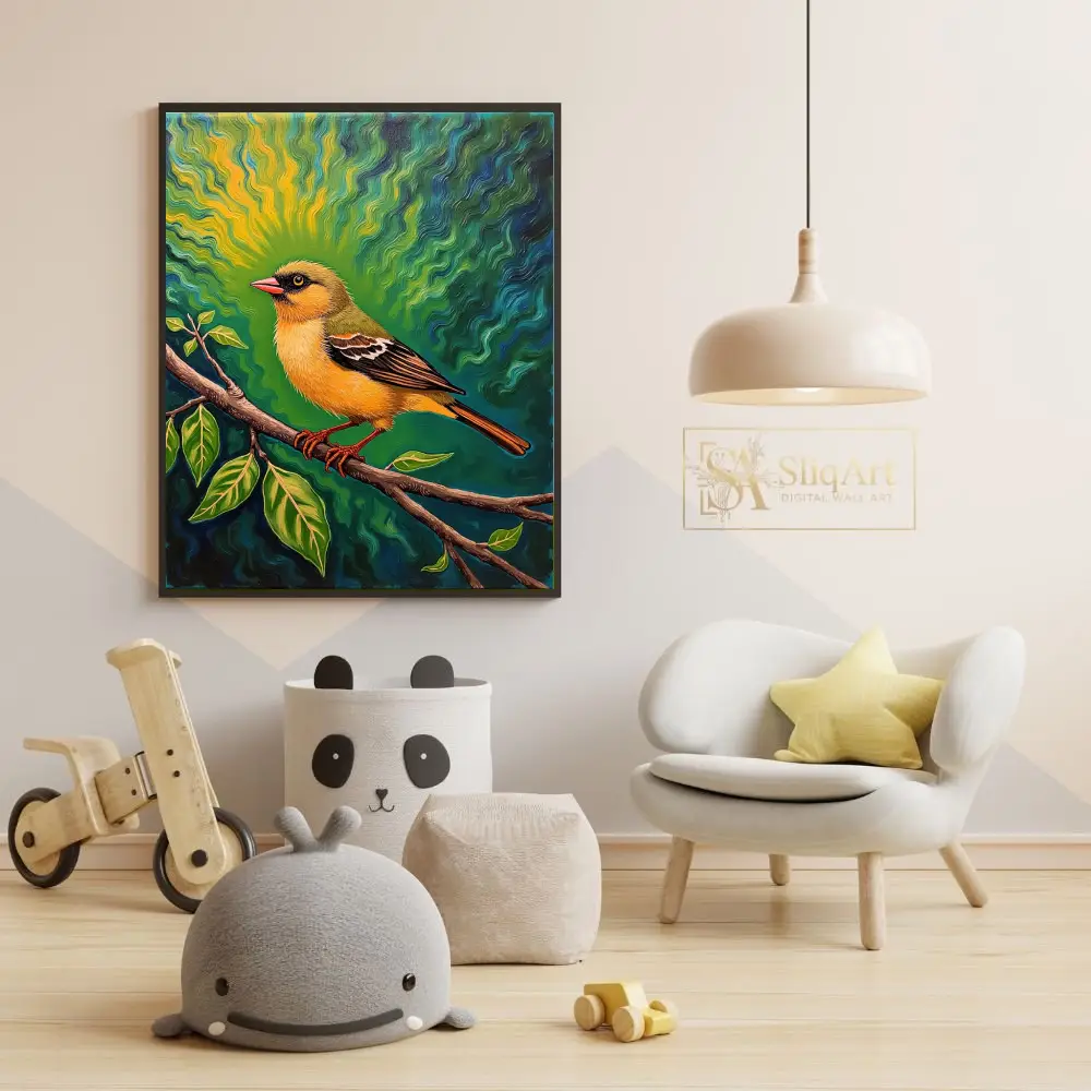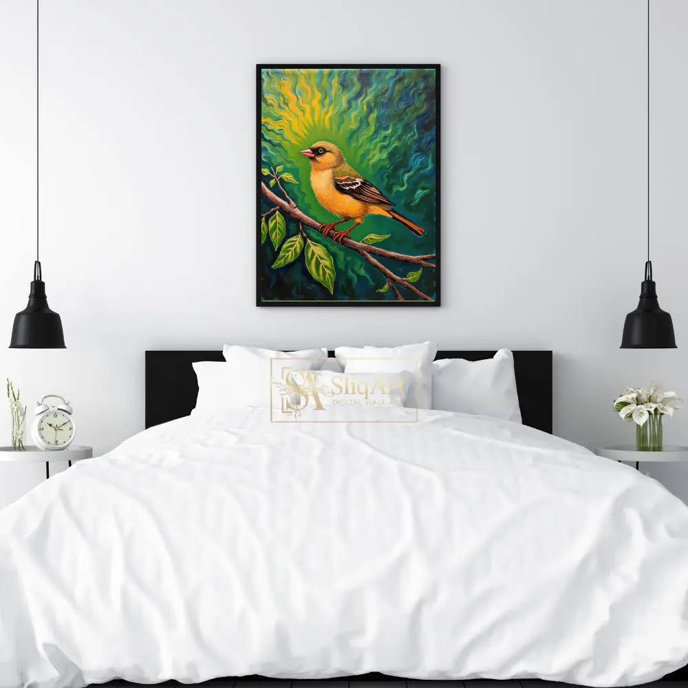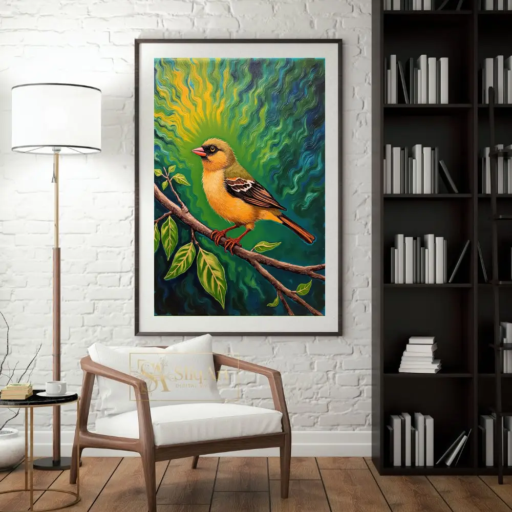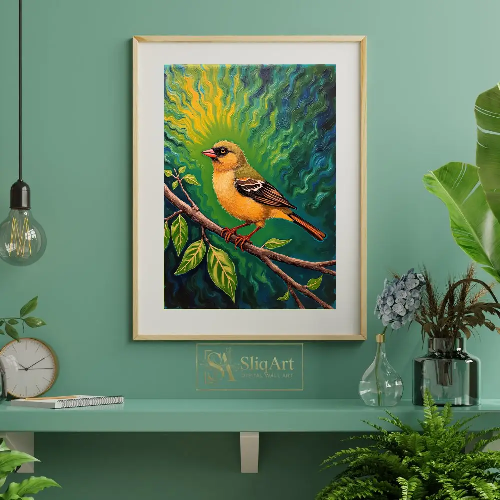 This captivating artwork features a brilliantly colored yellow songbird perched calmly on a budding branch. What sets this piece apart is its mesmerizing background—a psychedelic sunburst of swirling emerald, teal, and gold waves that seem to radiate energy from the bird itself.