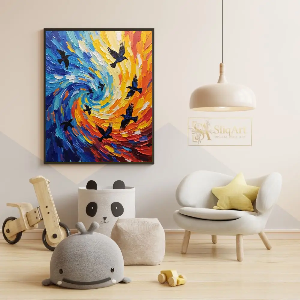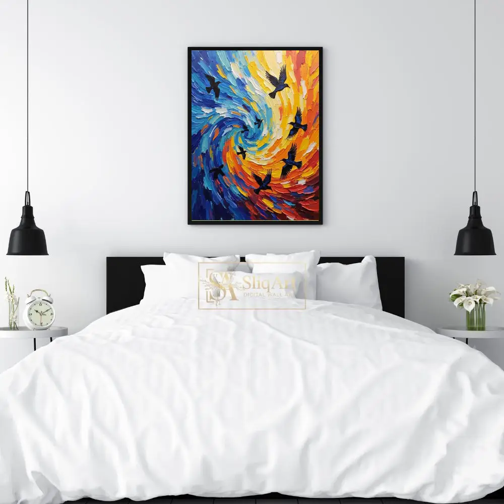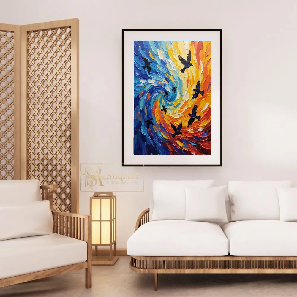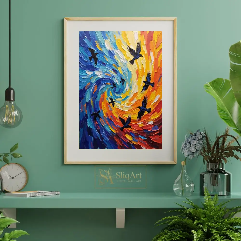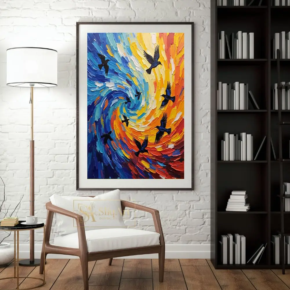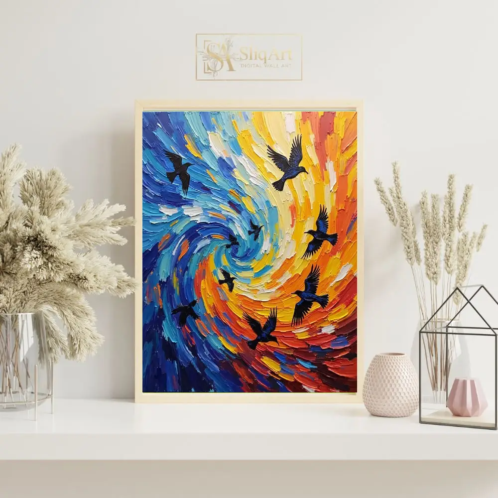 Capture the raw energy of nature with this breathtaking impasto painting. Featuring a flock of black birds caught in a swirling celestial vortex, this piece uses thick, tactile brushstrokes to create a sense of movement and depth.