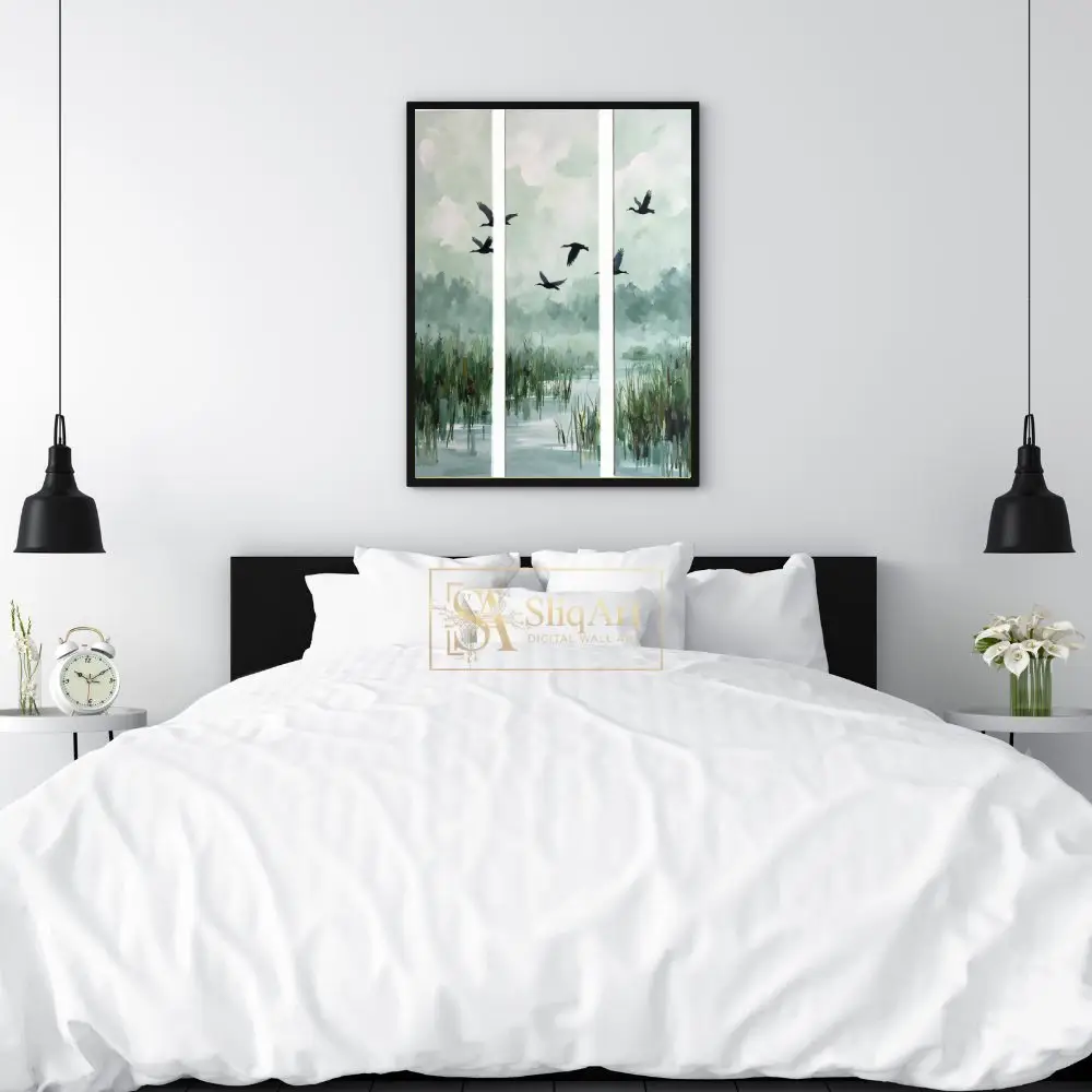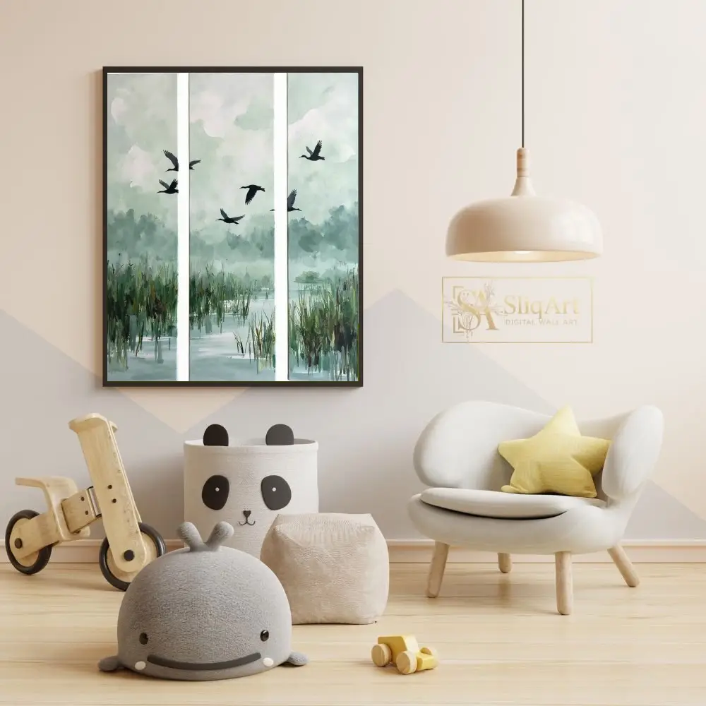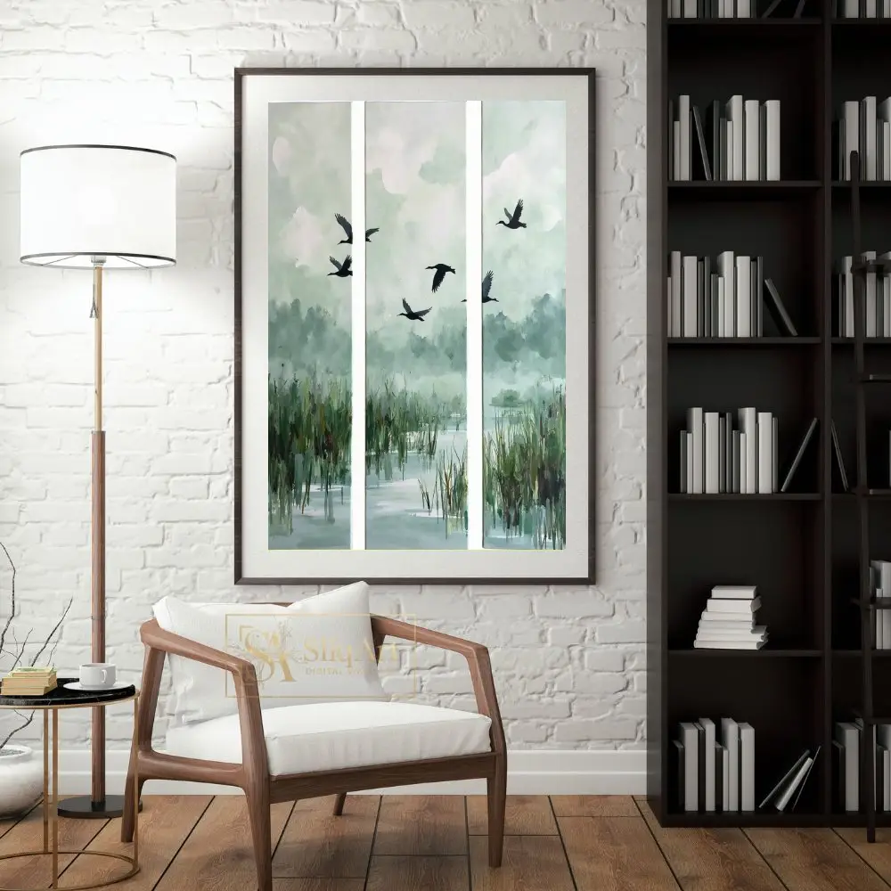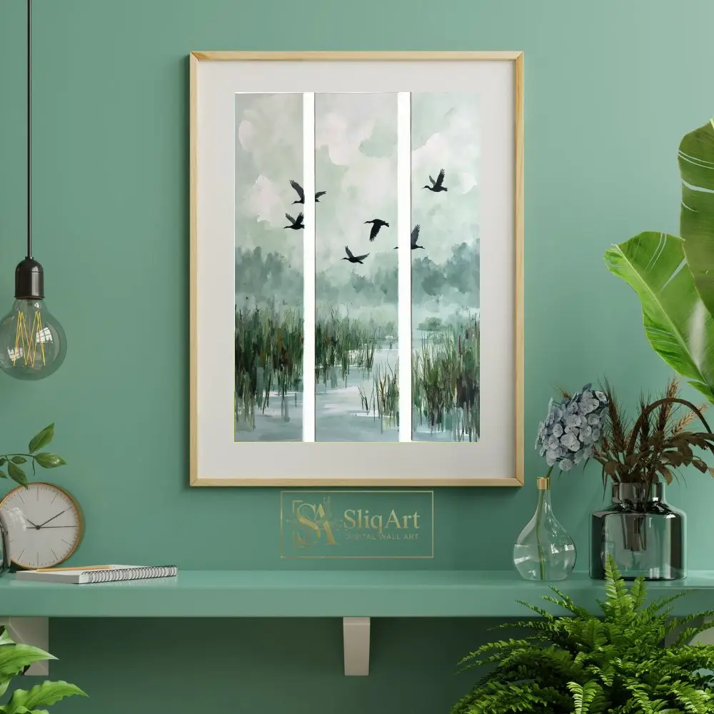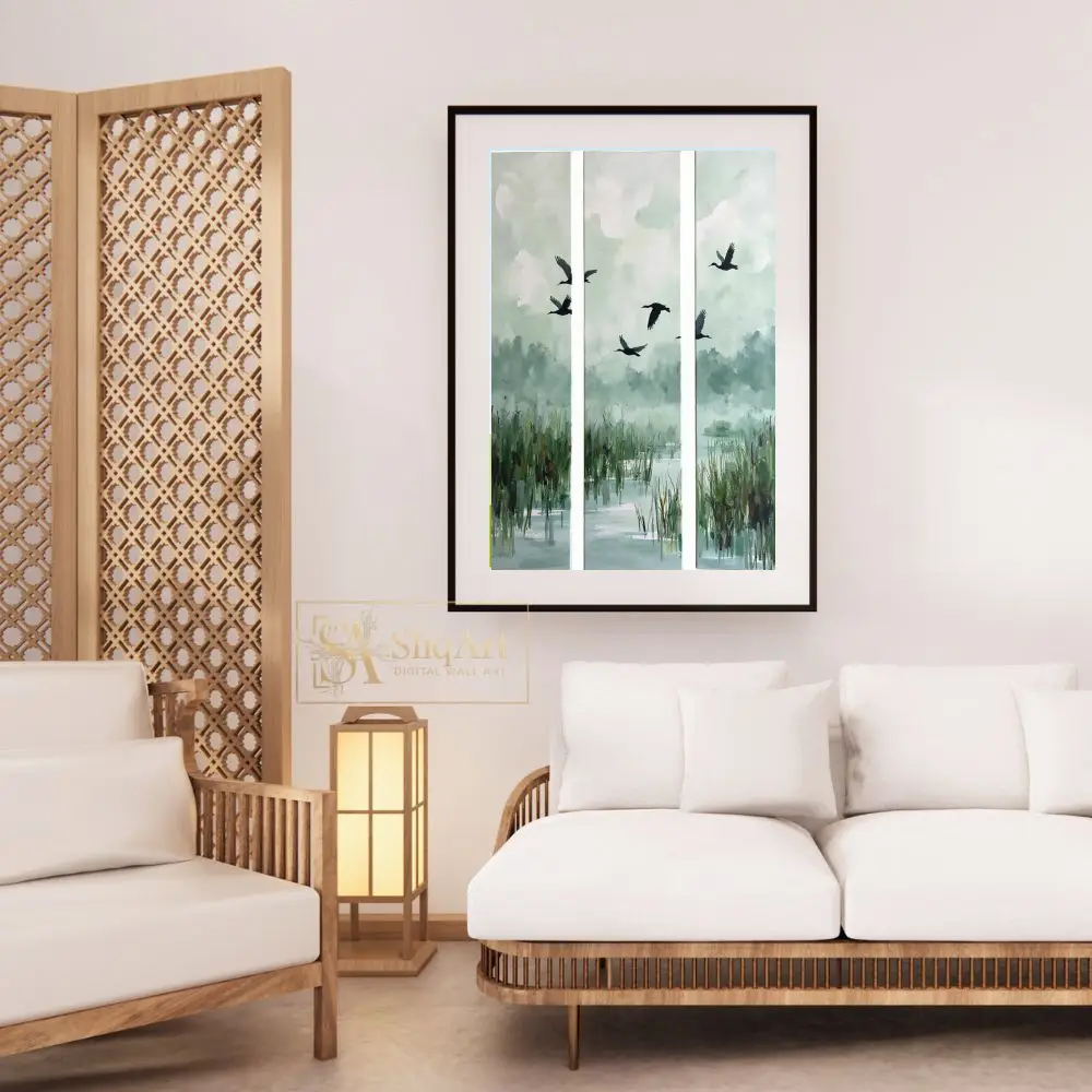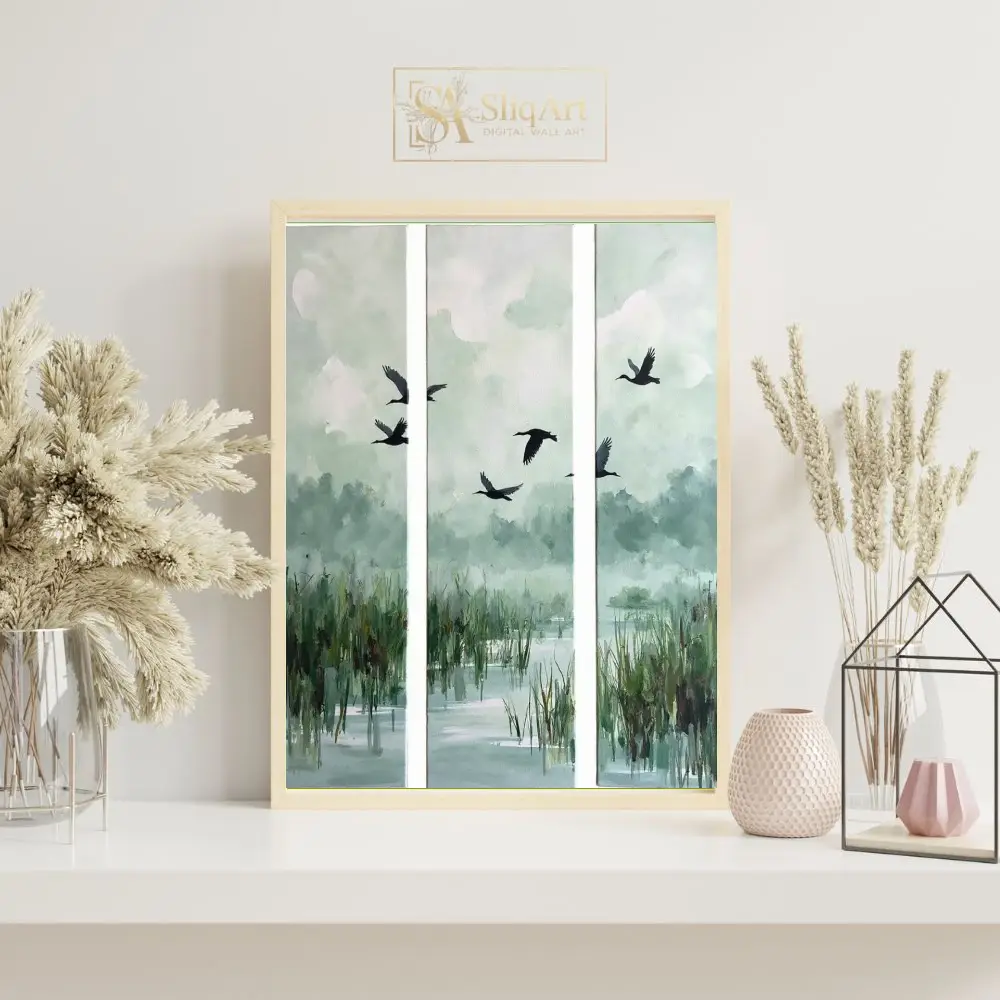 Elevate your interior with this serene three-panel triptych capturing the graceful flight of birds over a misty wetland. The muted palette of sage green, soft blues, and earthy tones creates a calming atmosphere, perfect for modern and minimalist homes.