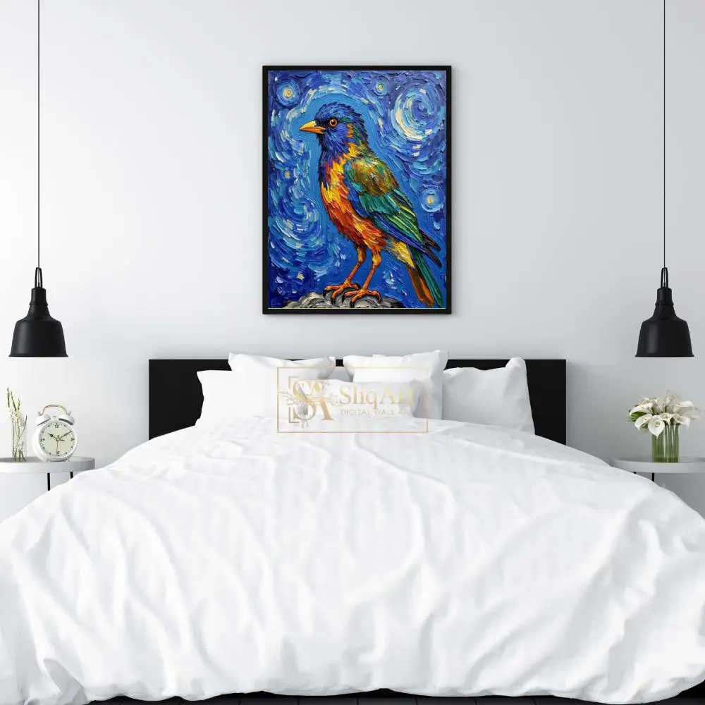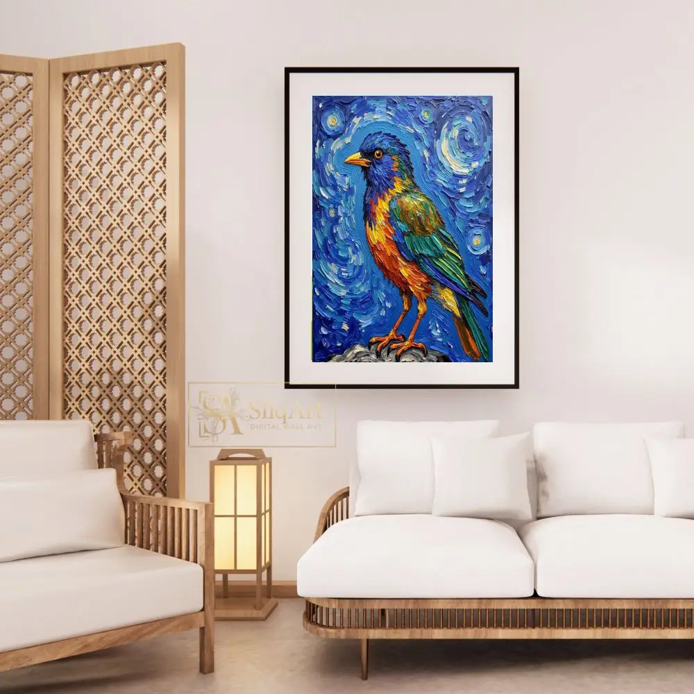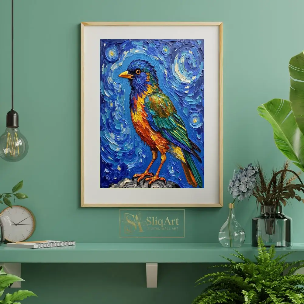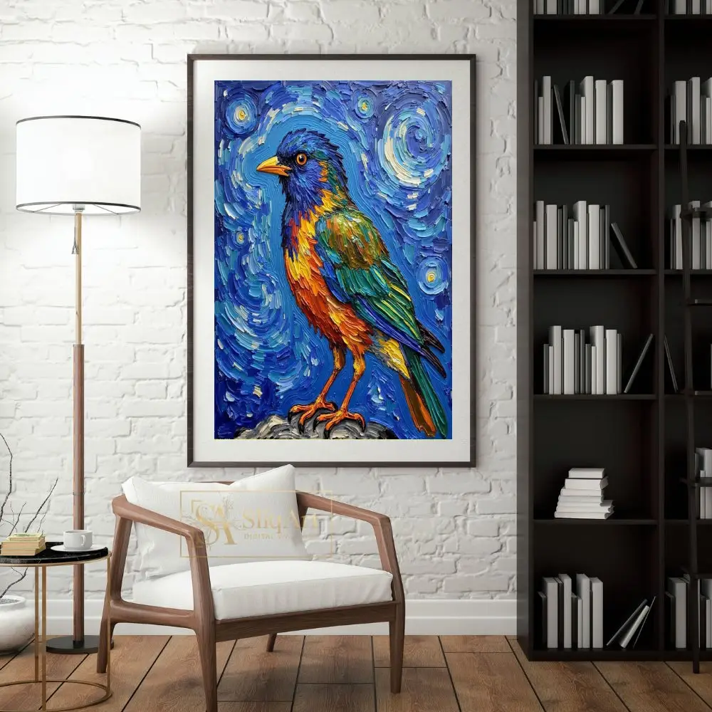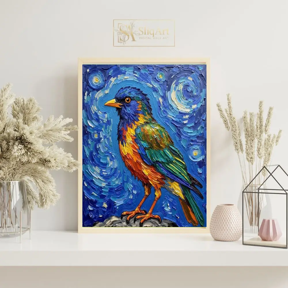 This captivating impasto artwork brings a songbird to life with extraordinary texture and a palette inspired by the cosmos. Utilizing thick, rhythmic brushstrokes reminiscent of post-impressionist techniques, the artist creates a swirling celestial backdrop that contrasts beautifully with the bird’s vivid orange, green, and blue plumage.