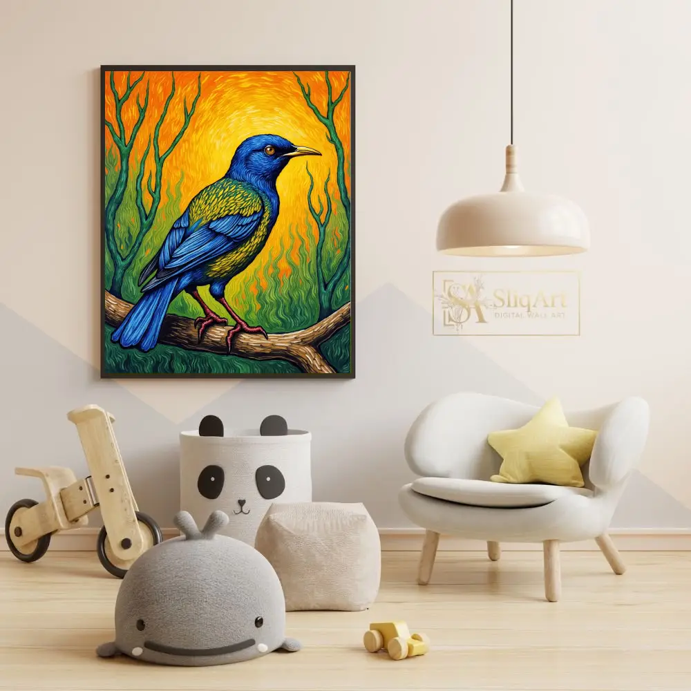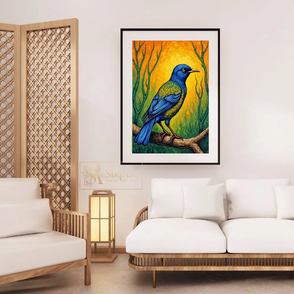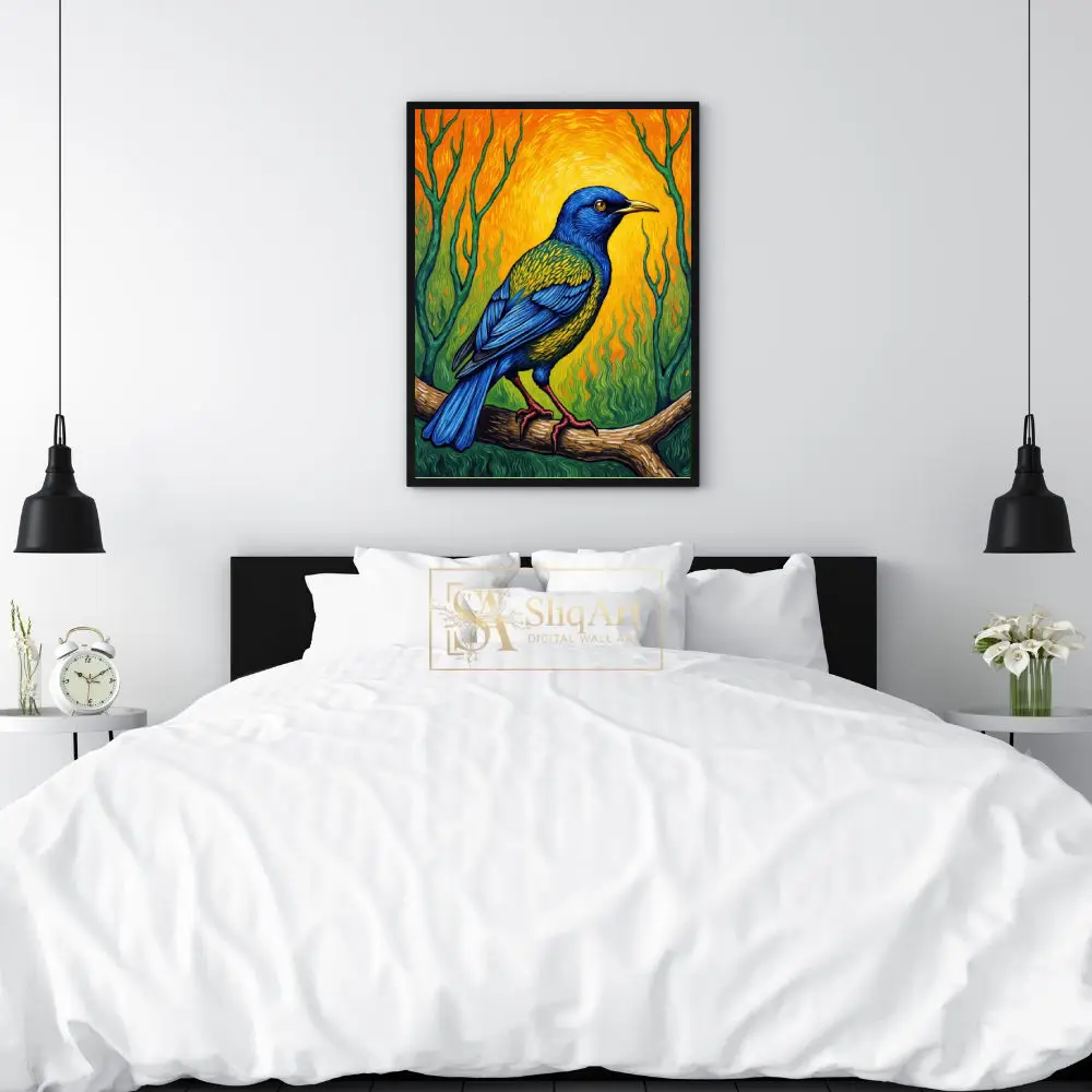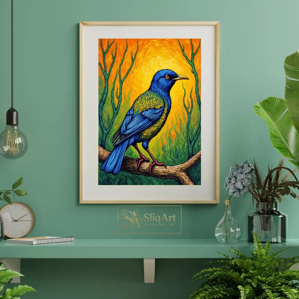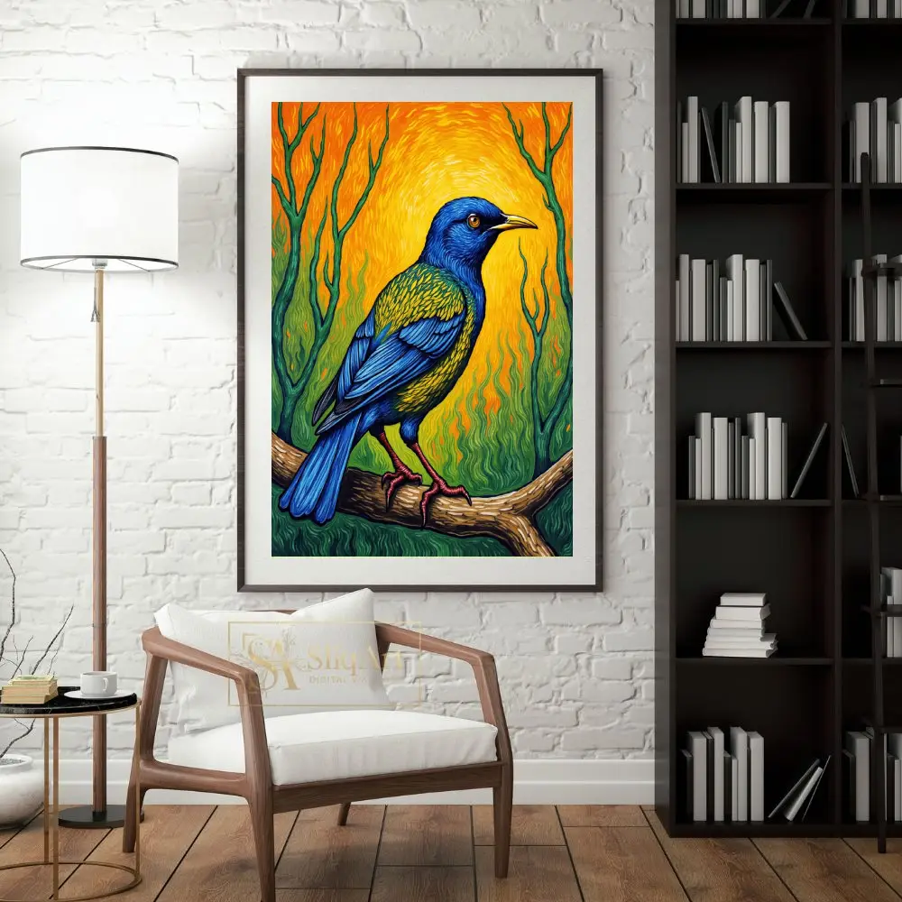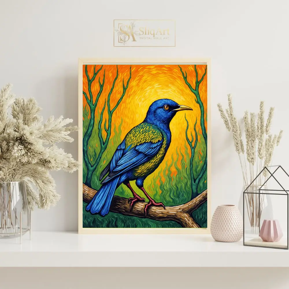 Bring a burst of energy and color into your home with this stunning Post-Impressionist style painting. This artwork features a majestic bird with deep cobalt blue feathers and iridescent green-gold accents, perched gracefully on a textured branch.